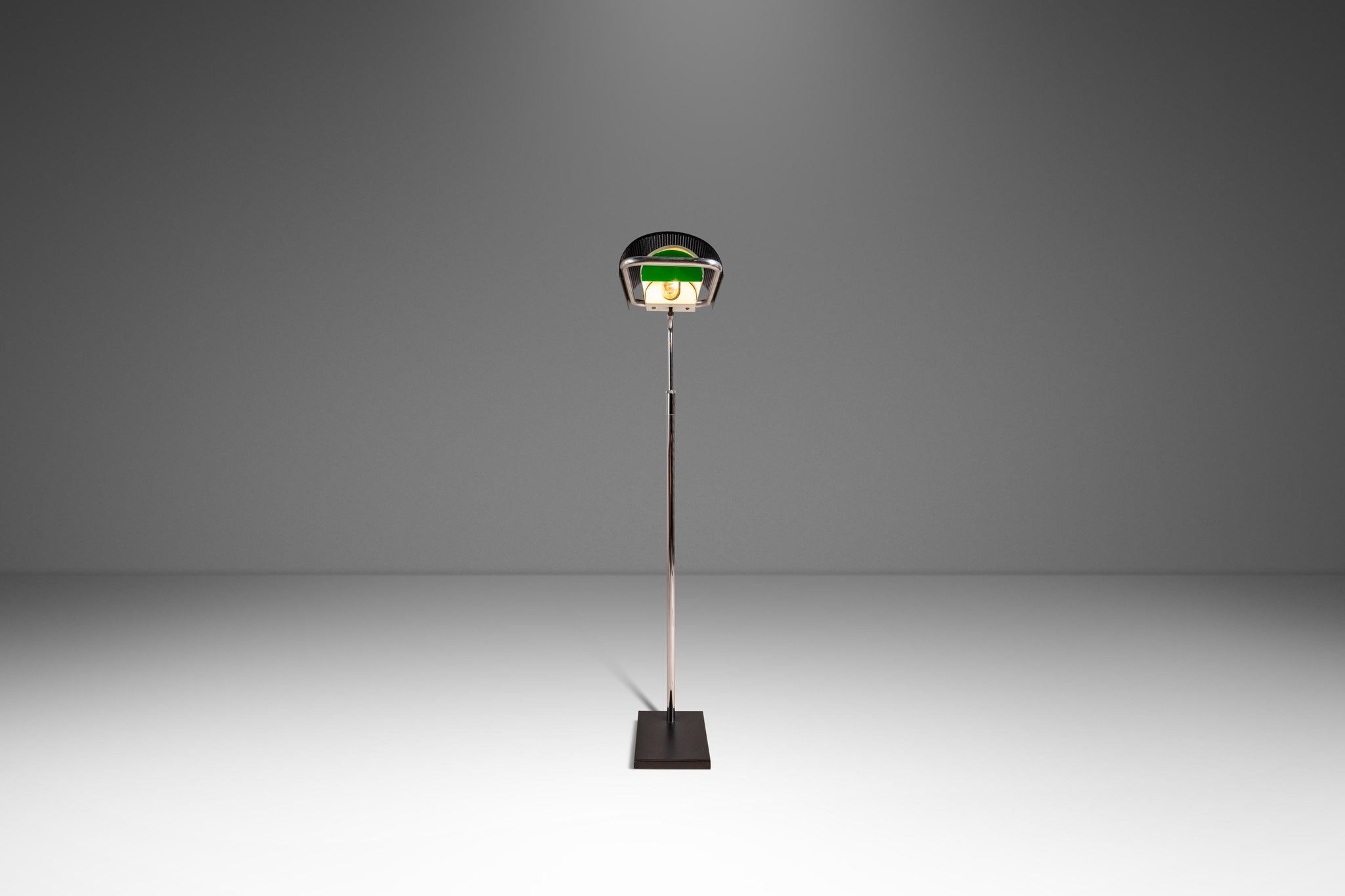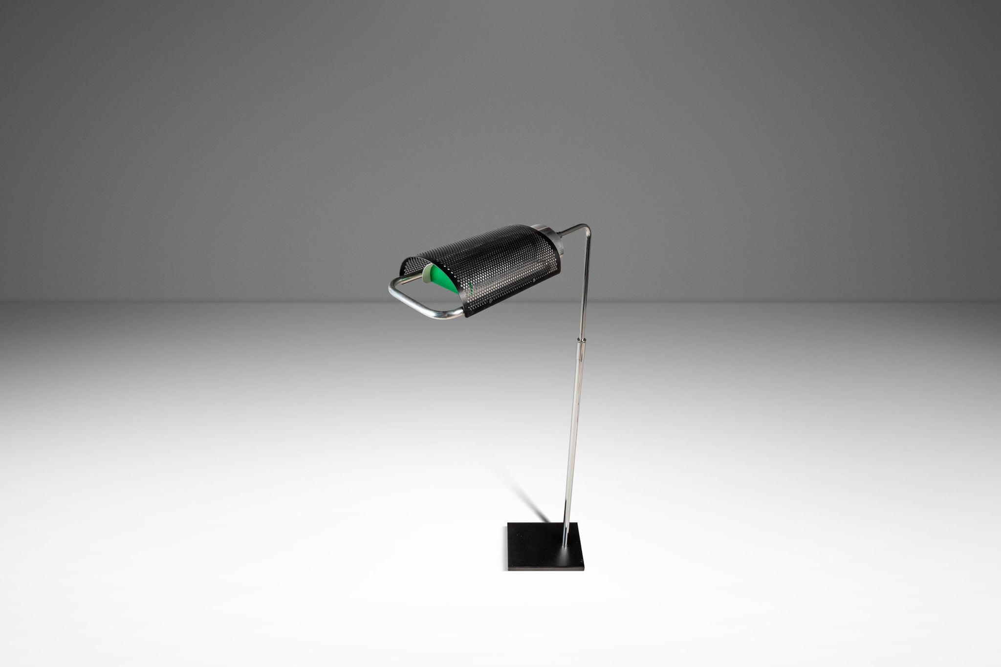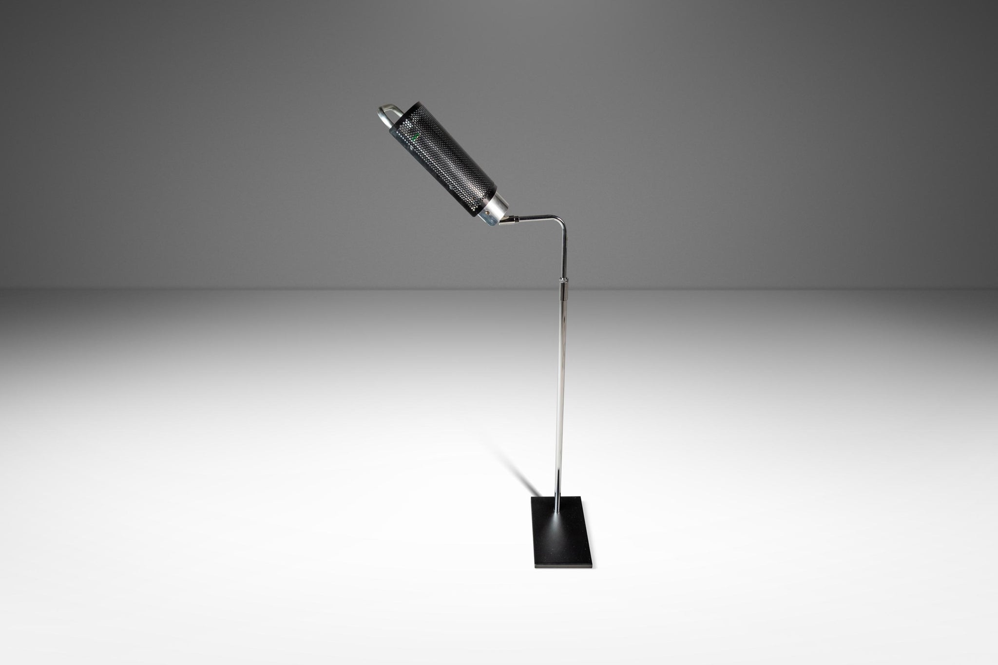 Condition Details: This iconic "Eyeshade" floor lamp is in 100% original, vintage condition and has aged to perfection! The most visible signs of wear are mostly relegated to the steel base which shows scratches (shown in the detail photos provided). With that said the only other wear present is small surface scratches in the chrome neck and lamp handle (again shown in the detail photos provided).