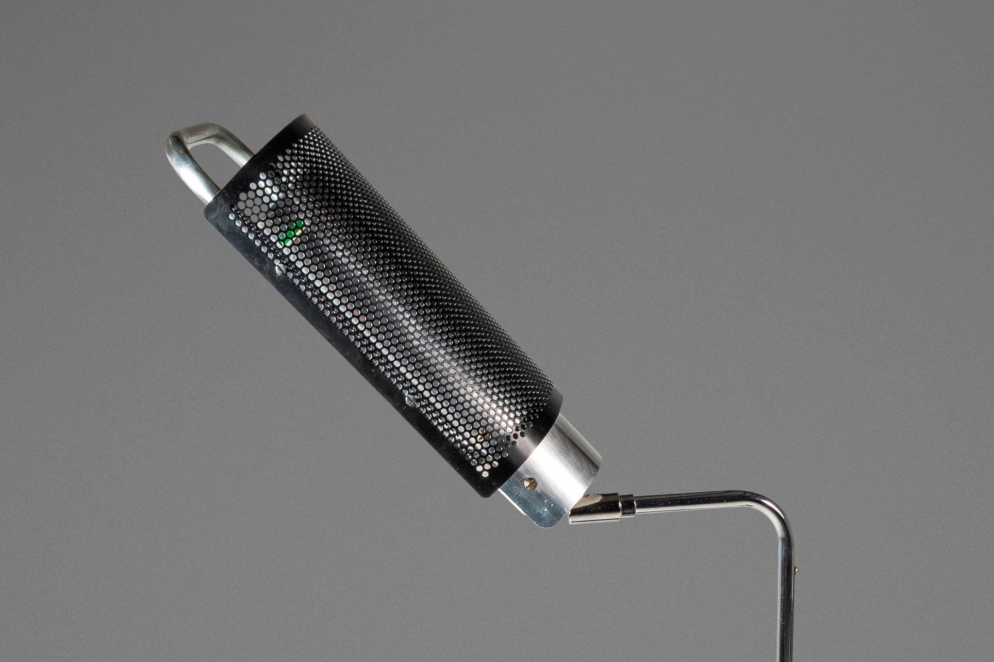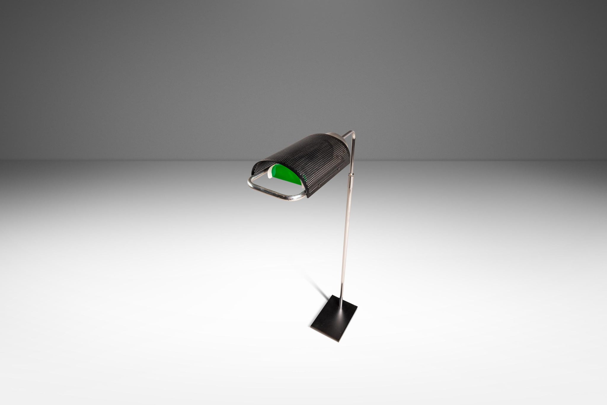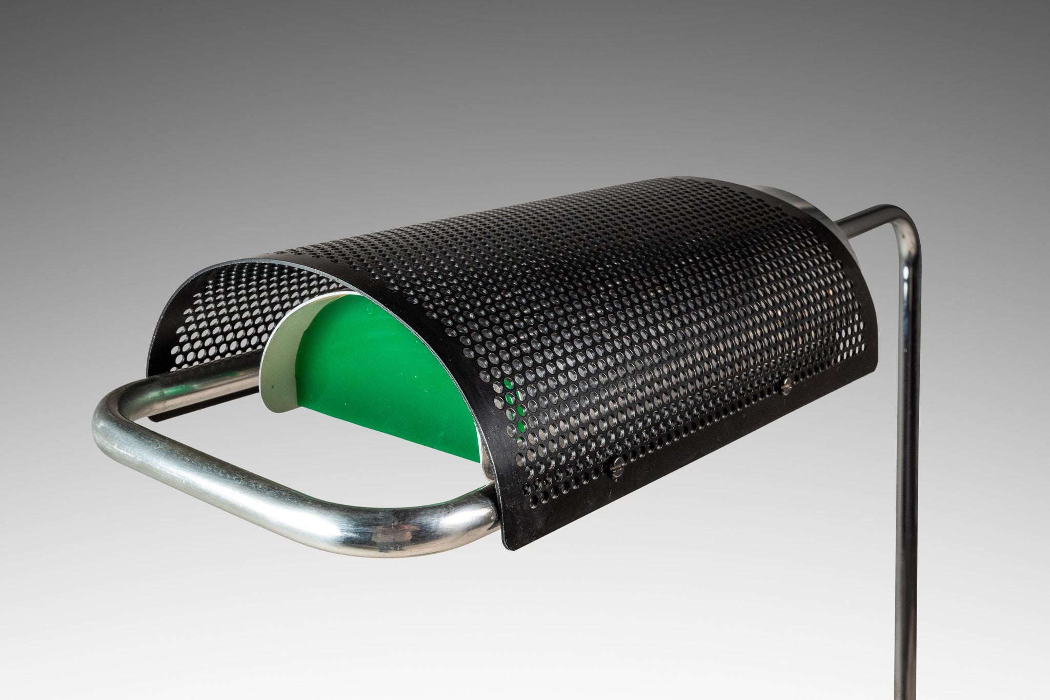 Condition Details: This iconic "Eyeshade" floor lamp is in 100% original, vintage condition and has aged to perfection! The most visible signs of wear are mostly relegated to the steel base which shows scratches (shown in the detail photos provided). With that said the only other wear present is small surface scratches in the chrome neck and lamp handle (again shown in the detail photos provided).