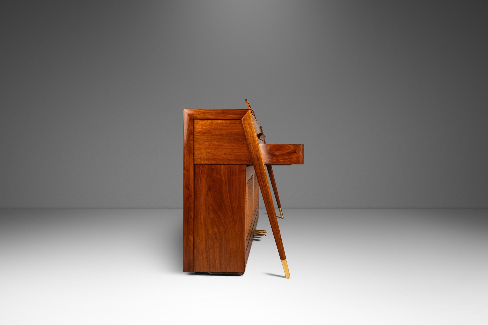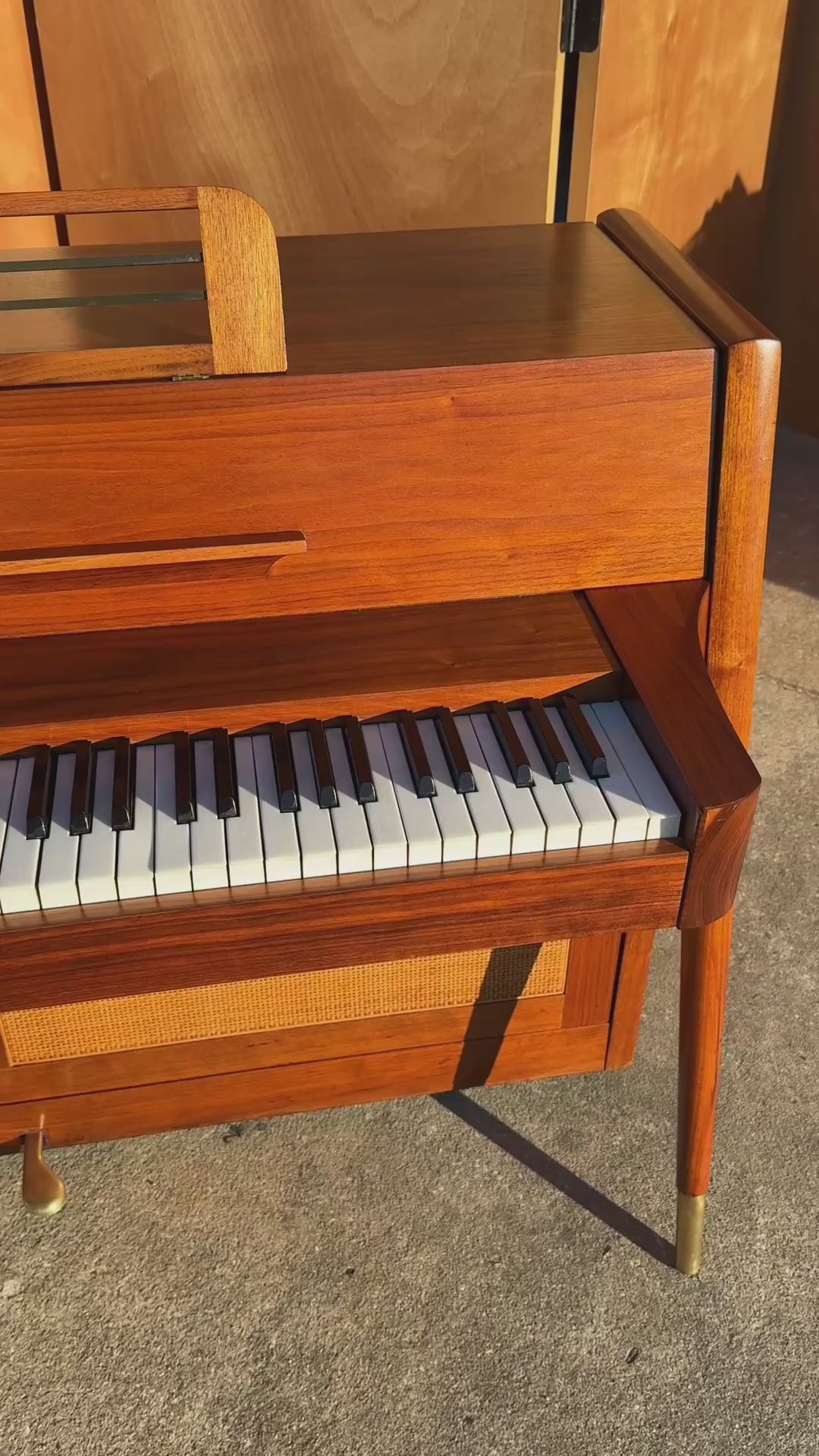 Title: Rare Mid-Century Modern Baldwin Acrosonic Spinet Piano in Walnut, Brass & Cane, USA, c. 1960s
