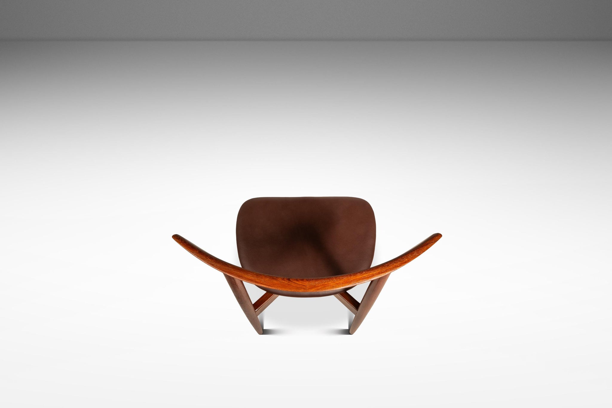 Recently and painstakingly restored this aesthetically stunning set has been hand-sanded and refinished bringing the solid teak back from the dead. Though some minor repairs remain subtly visible, this set is now in overall excellent condition. The rich dark mocha leather, cut from genuine Italian leather hides, adds warmth and comfort making this set perfect for both home and office spaces.
