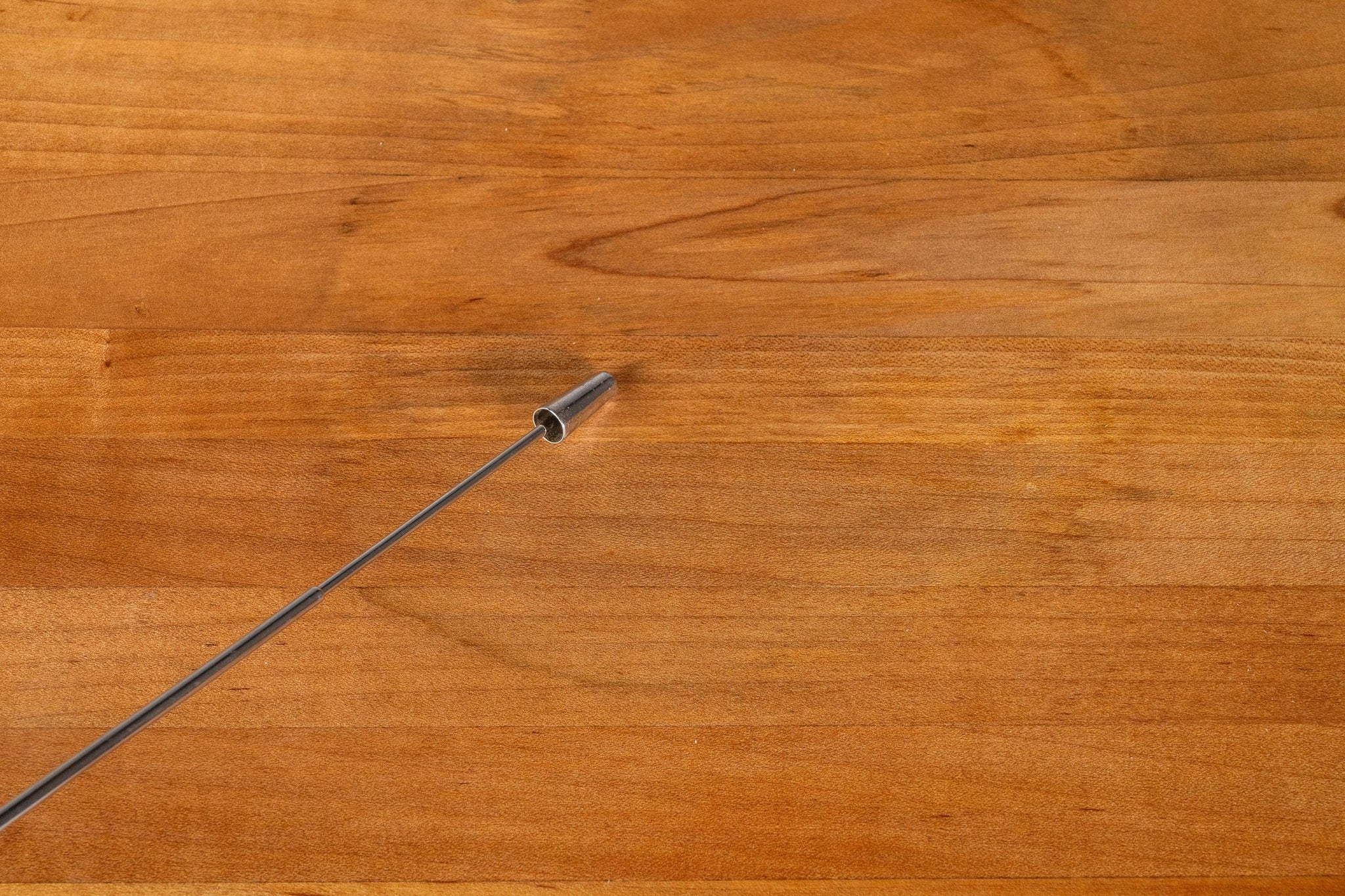 The solid butcher block top shows some signs of wear such as water stains from use as a kitchen element which can be seen in the detail photos provided. As purists, we strive to leave all of our pieces in as original condition as possible. However we do offer restoration services and a full carpentry shop which can professionally sand and refinish the butcher block included in the sale price. If this option interests you please message us prior to checkout as this service can require up to 12-14 days of lead time.