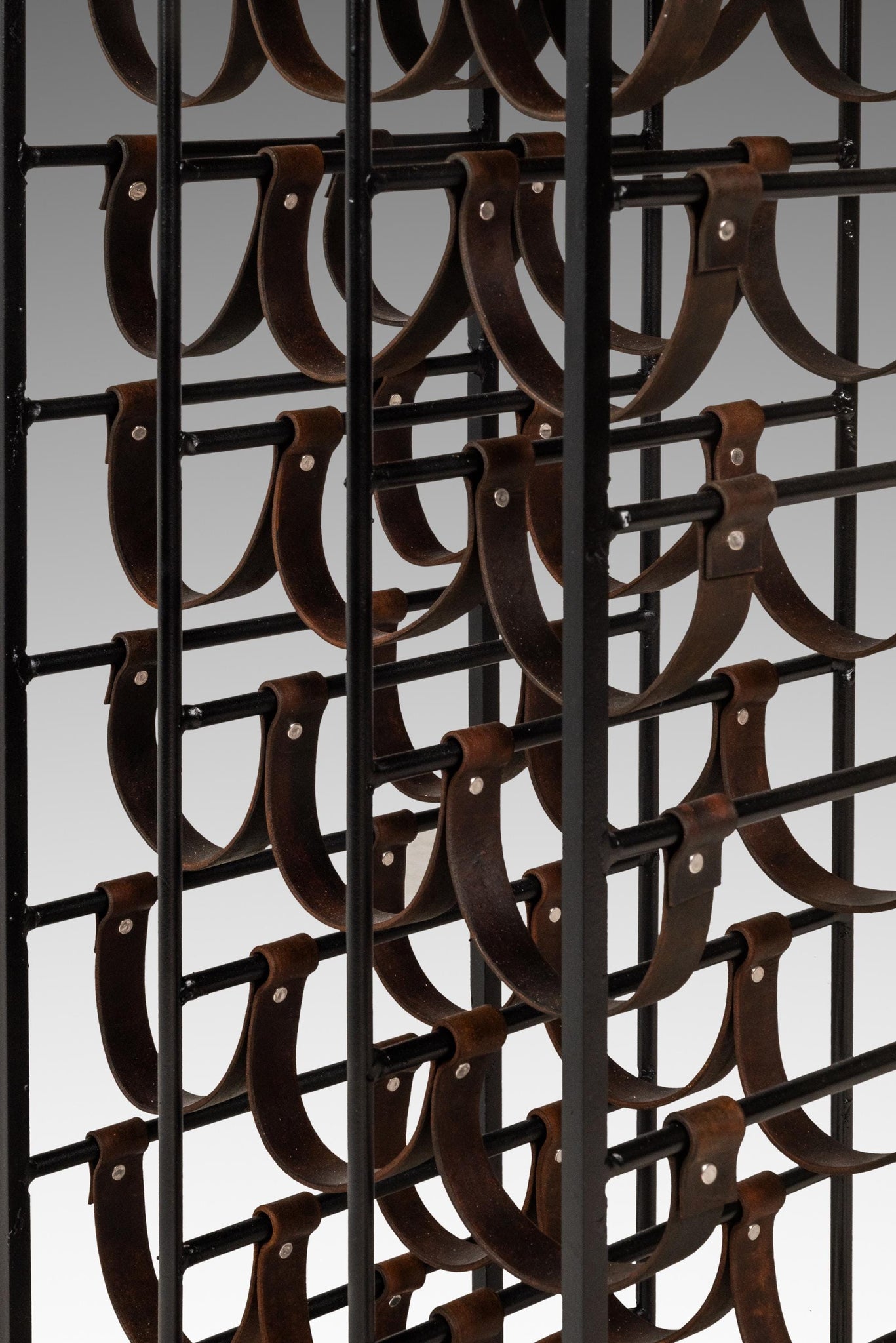 Condition Details: This architecturally fascinating wine rack has recently undergone a partial restoration process featuring newly installed leather slings. The wrought iron frames shows no serious signs of wear with only light nicks and scuffs present.