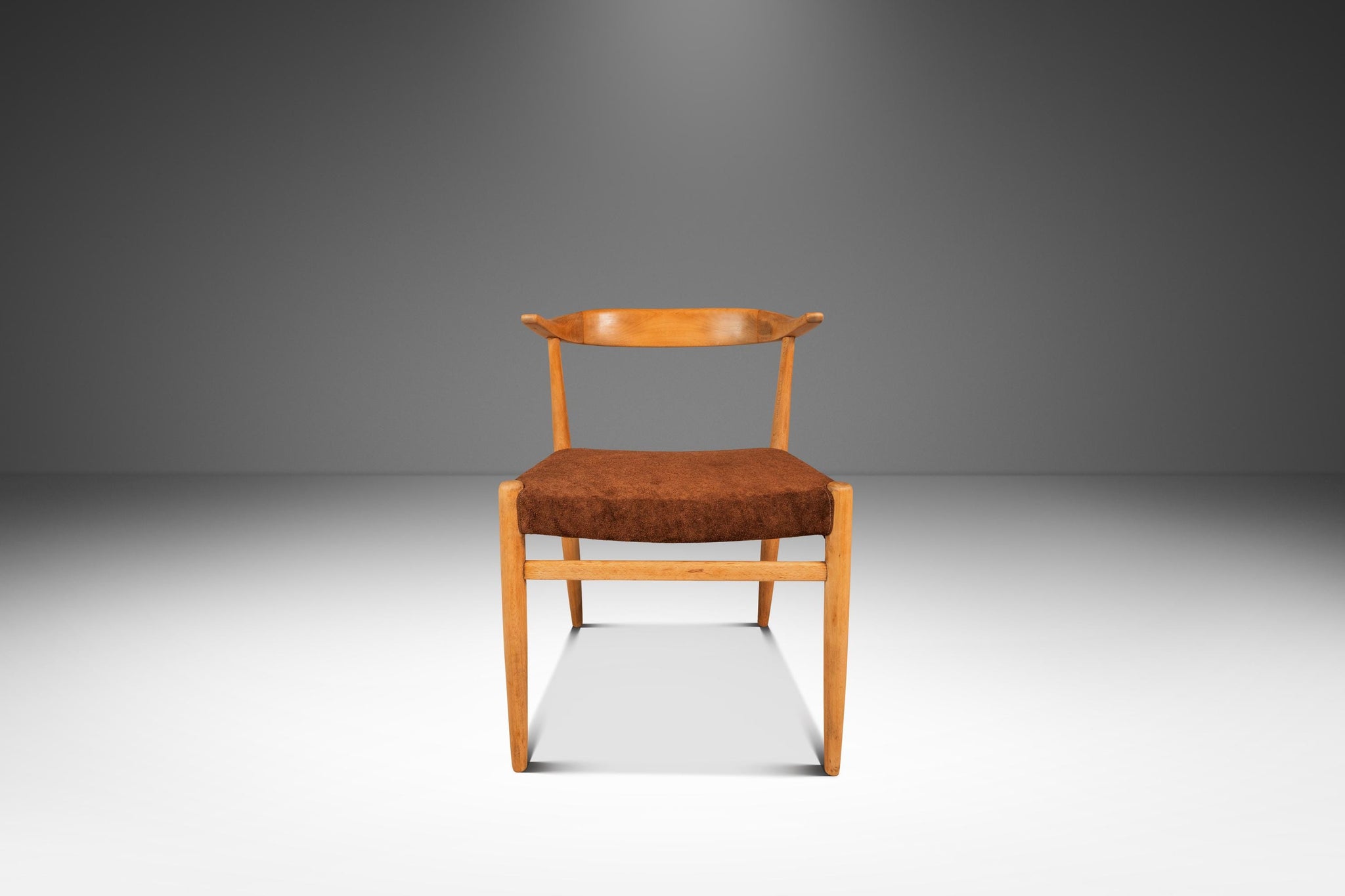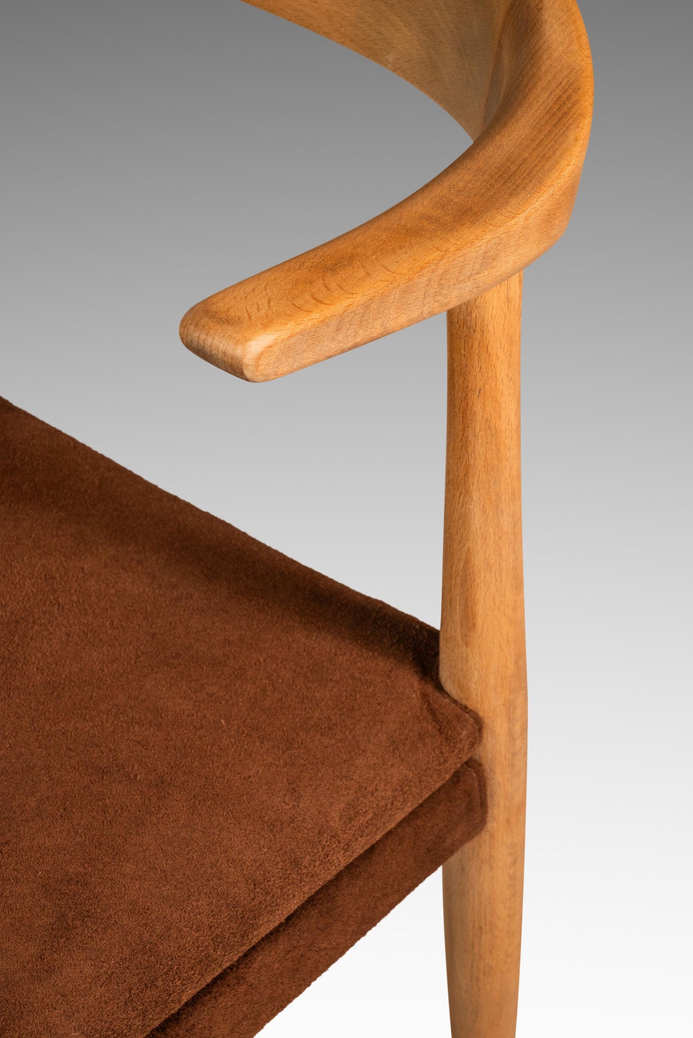 Condition Details: This rare 'horn' chair has recently undergone a comprehensive and transformative restoration process featuring new suede upholstery. The solid beech wood, originally stained walnut to appeal to the American market, has been hand-sanded and left in it's original, natural wood tone and hand-polished with natural wax and shows now discernable wear with no scratches, gouges or stains present whatsoever.