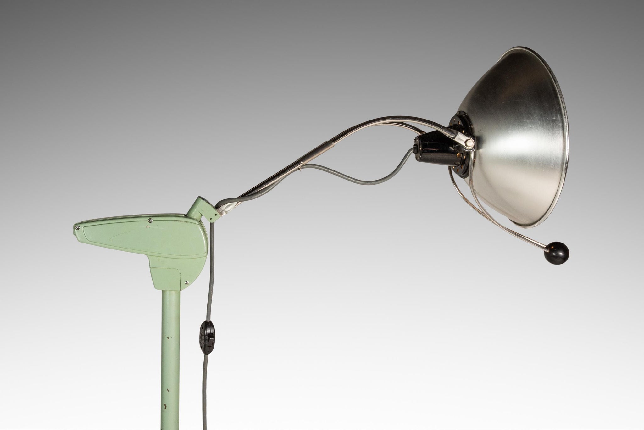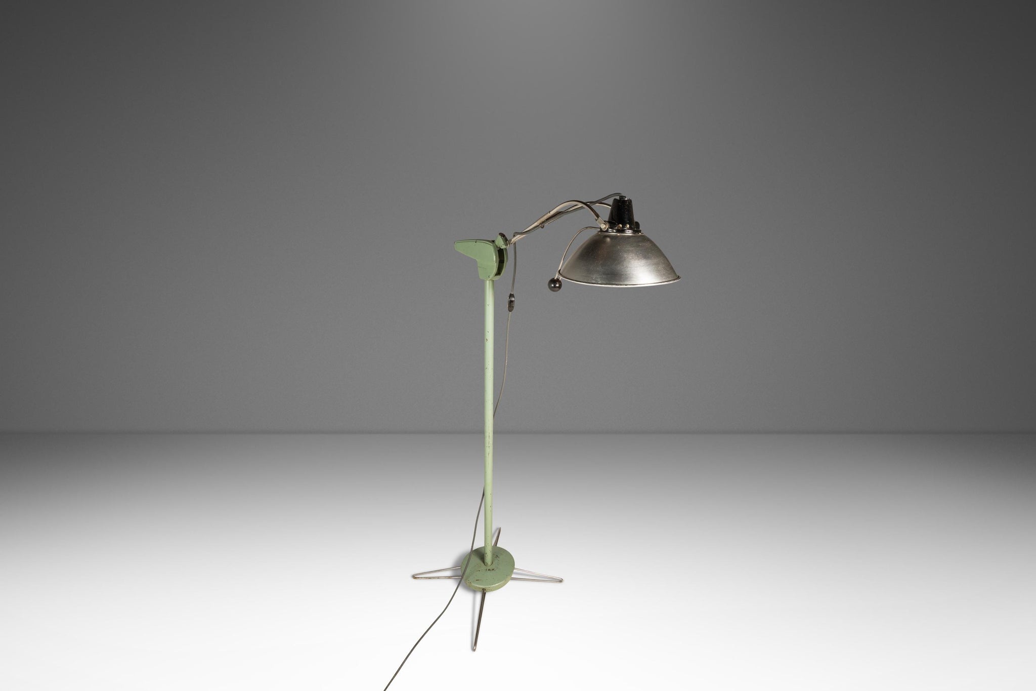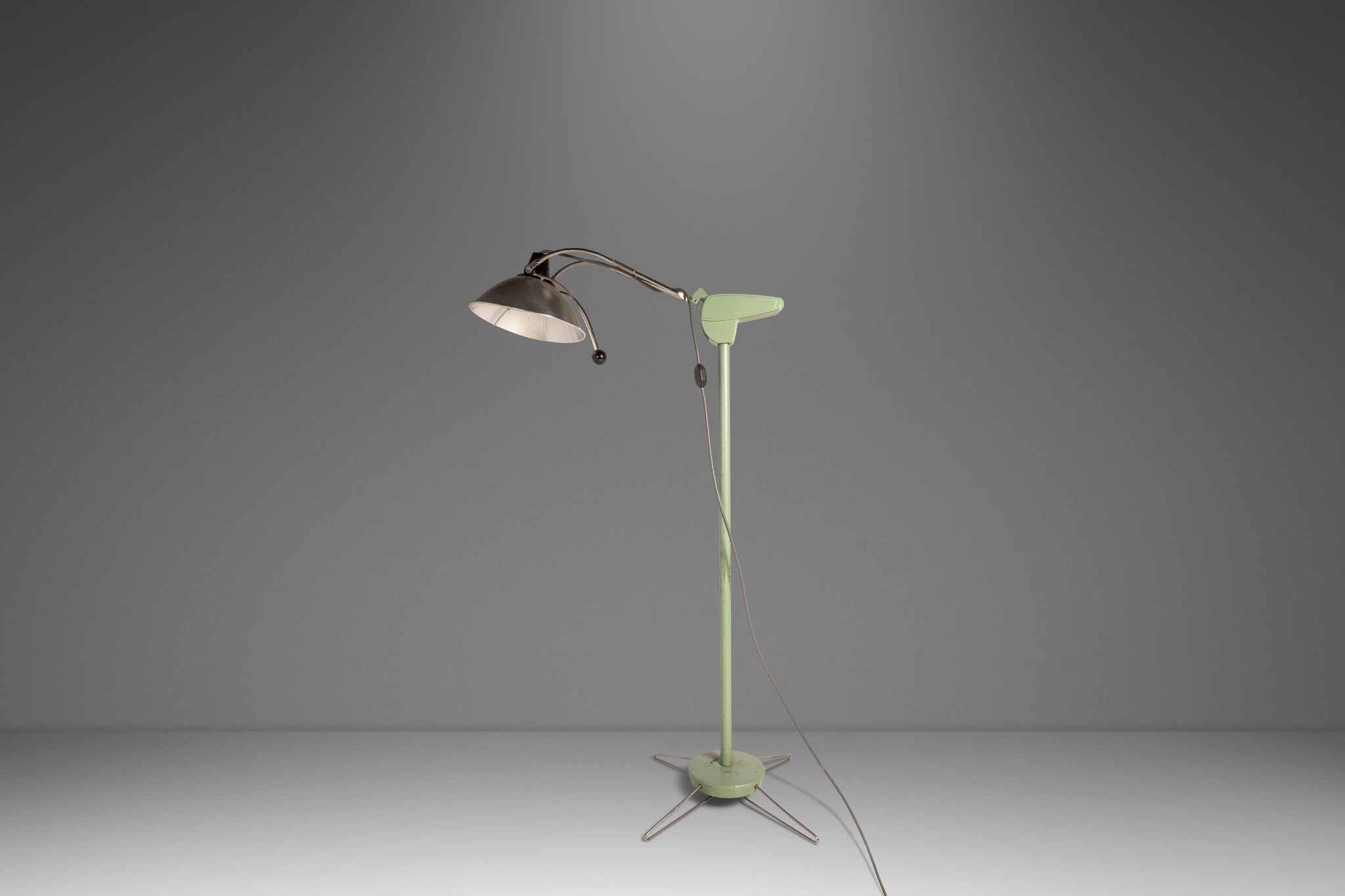 Condition Details: This heavy duty surgical floor lamp is in 100% original, vintage condition. The solid metal frame and legs, painted a vintage-feeling mint-green, shows character-rich patina throughout (nicks, scratches, spot rust etc.) which can be seen clearly in the detail photos and demonstration video provided.