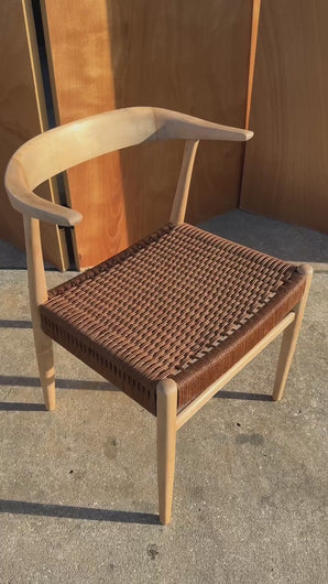 Condition Details: This rare 'horn' chair has recently undergone a comprehensive and transformative restoration process. The solid beech wood, originally stained walnut to appeal to the American market, has been hand-sanded and left in it's original, natural wood tone and hand-polished with natural wax and shows no discernable wear with no scratches, gouges or stains present whatsoever.