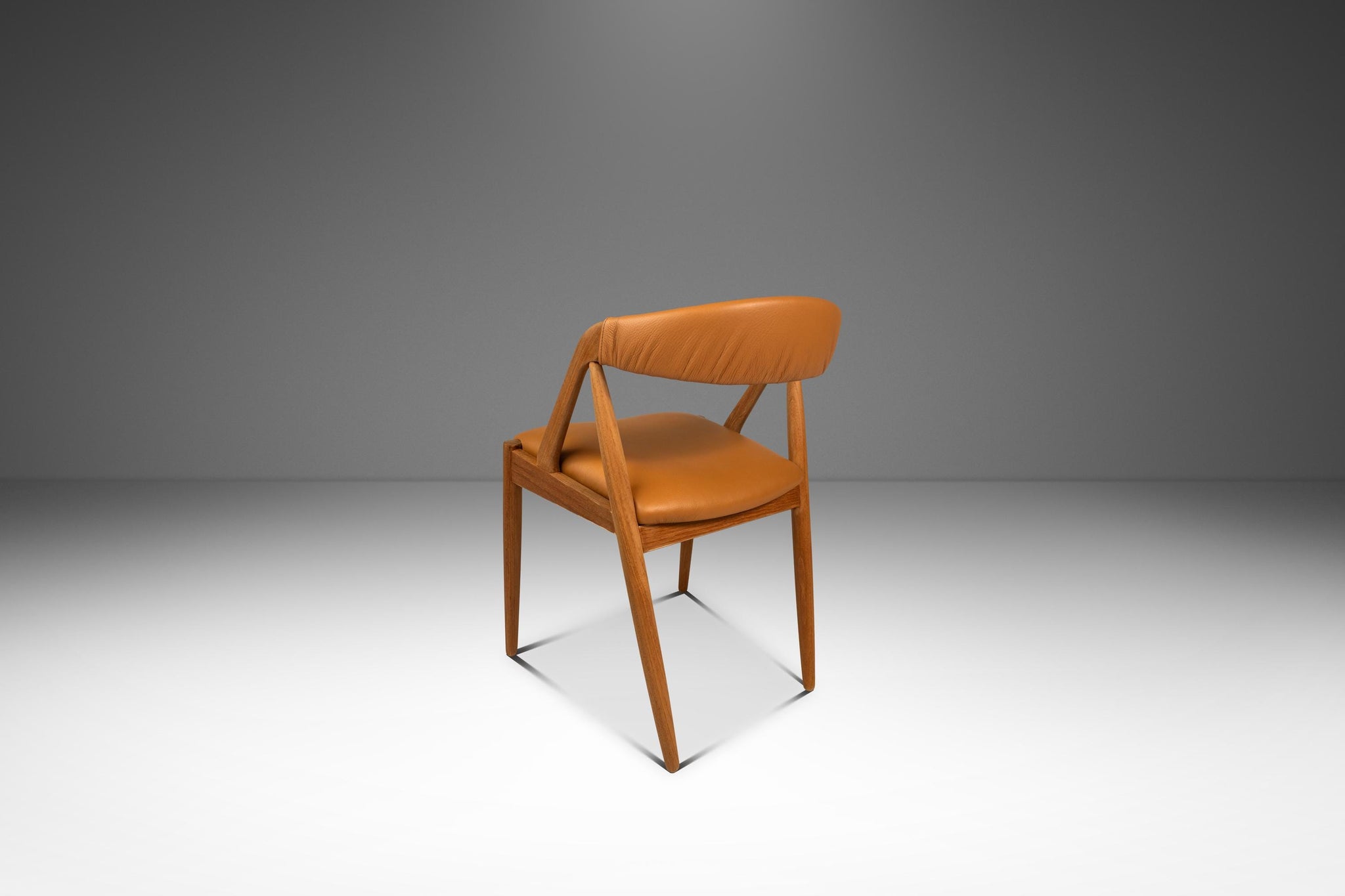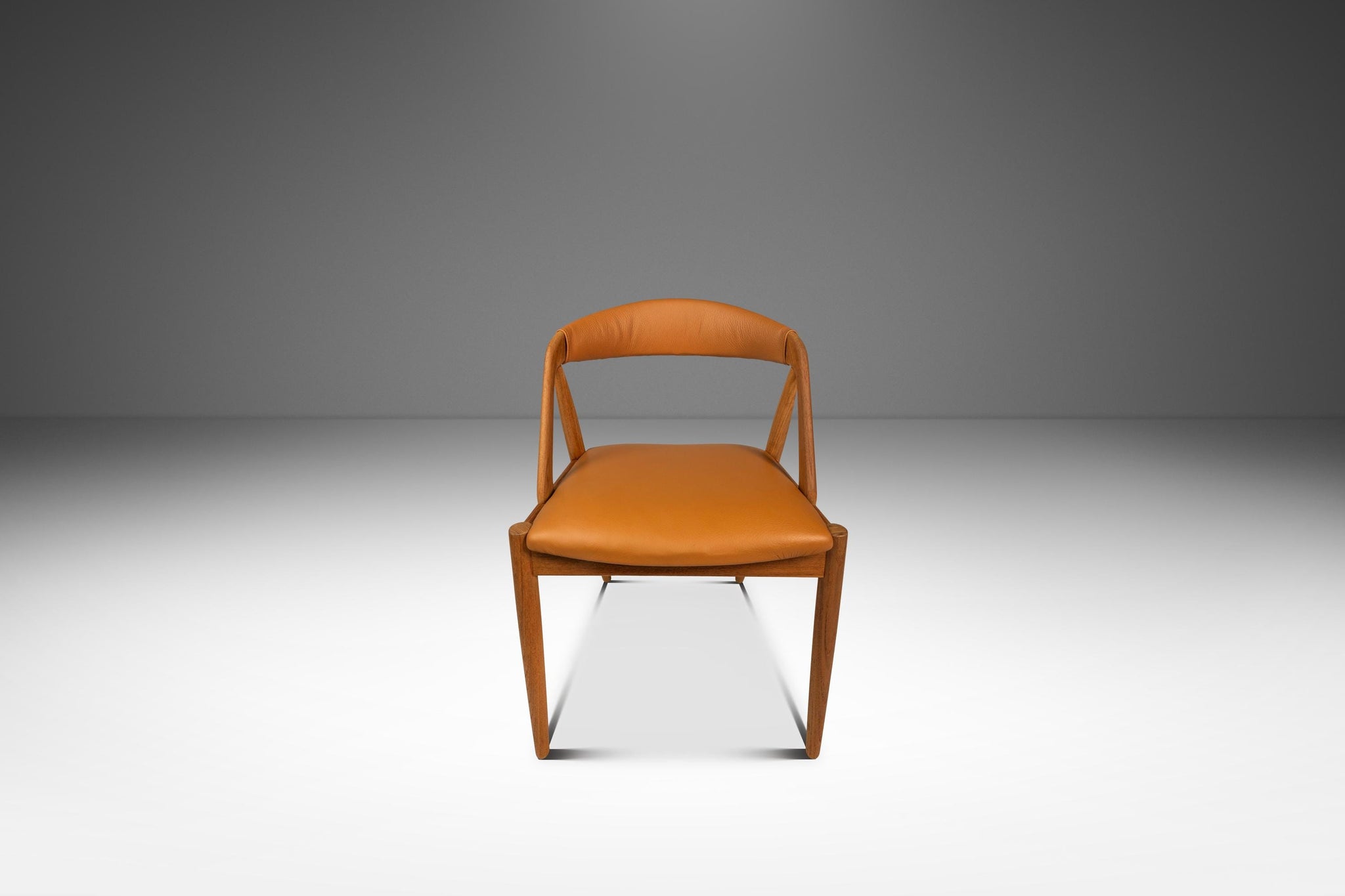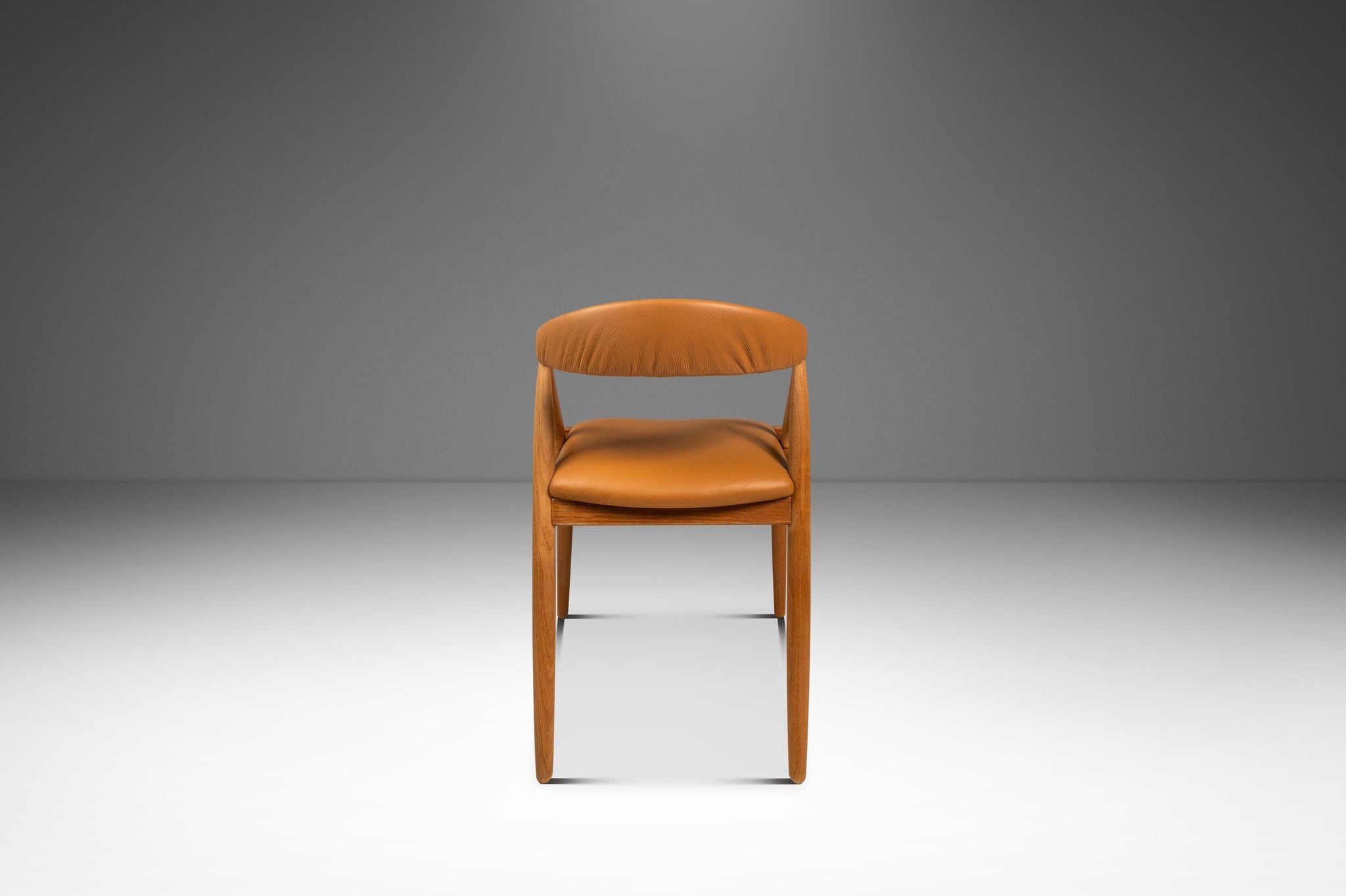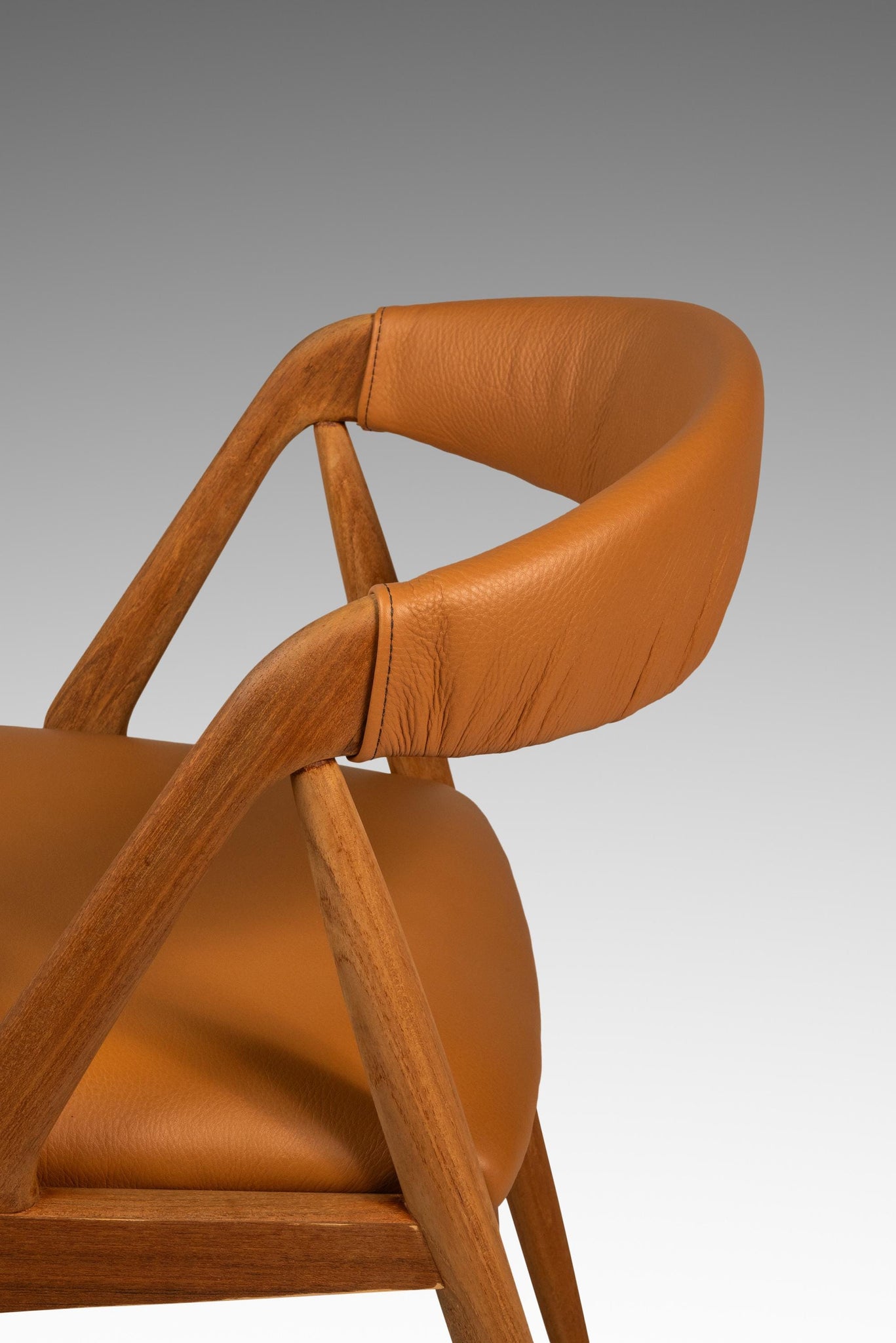 About: Introducing a set of bespoke Model 31 dining chairs designed by the influential Kai Kristiansen. Produced in Denmark in the 1960s these instantly recognizable chairs are constructed from a mix of solid and veneered Burmese teak, which have been sanded and left unfinished showcasing the natural beauty of the wood grain. The curved back and sculptural seat backs add a touch of elegance to the design, while the tapered legs add a sense of lightness and airiness. The seats have been re-strapped and reupholstered in a rich, thick-cut genuine leather hide in a fabulous hazelnut brown tone perfectly off-setting the natural wood tones of the solid teak frames.