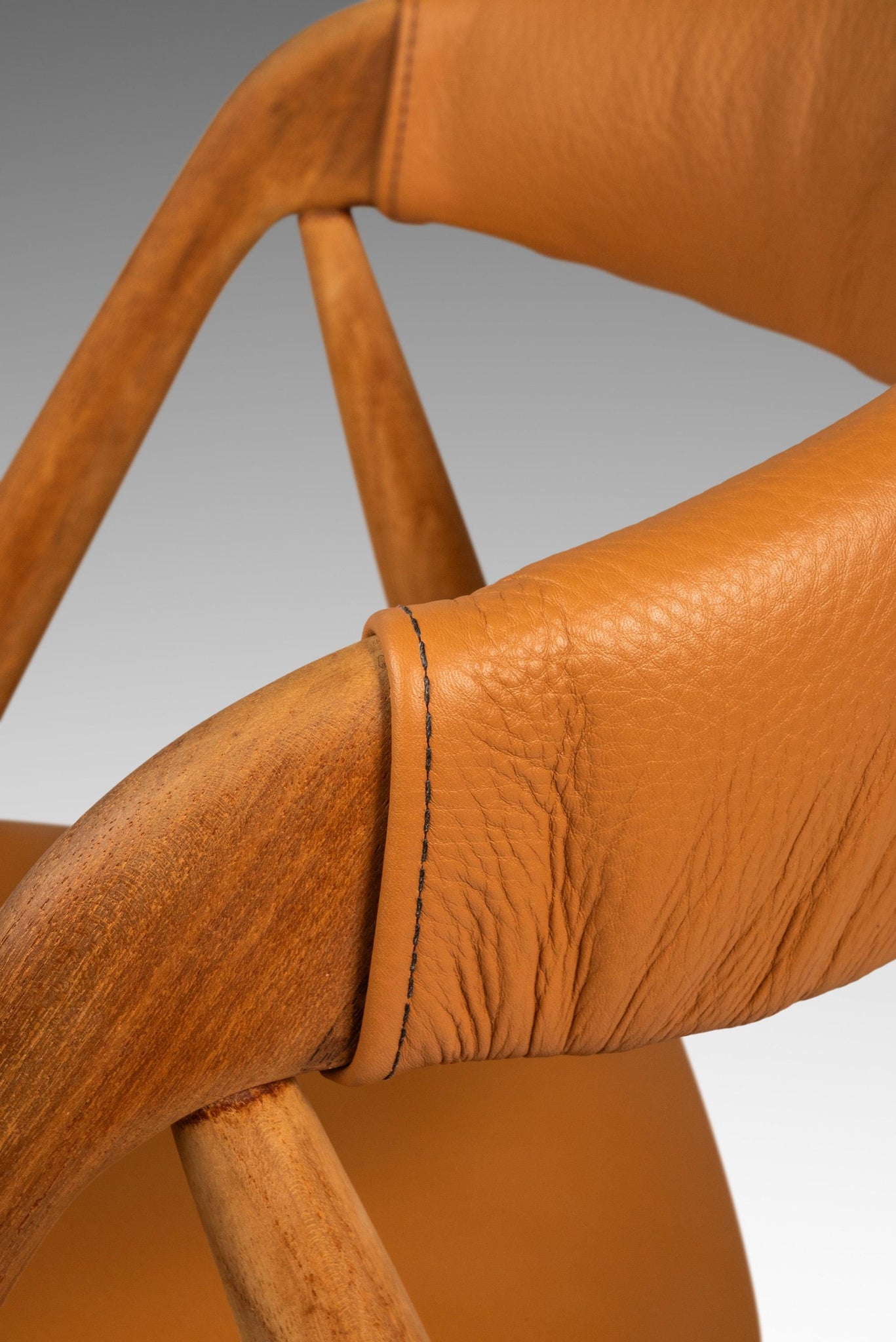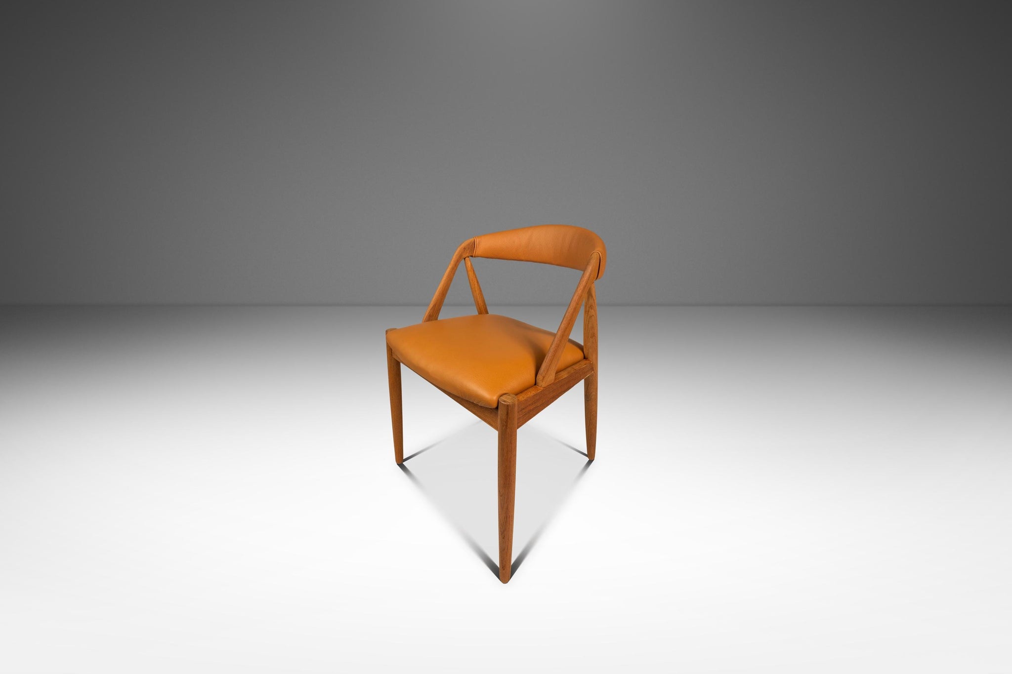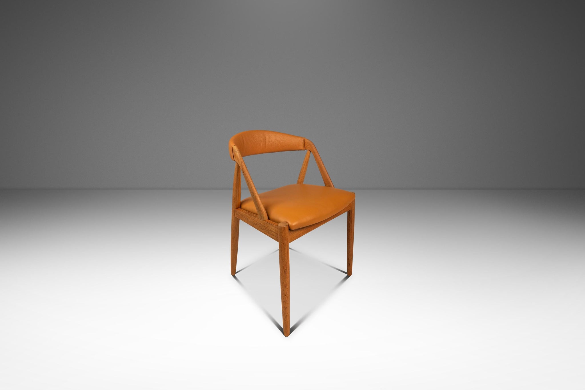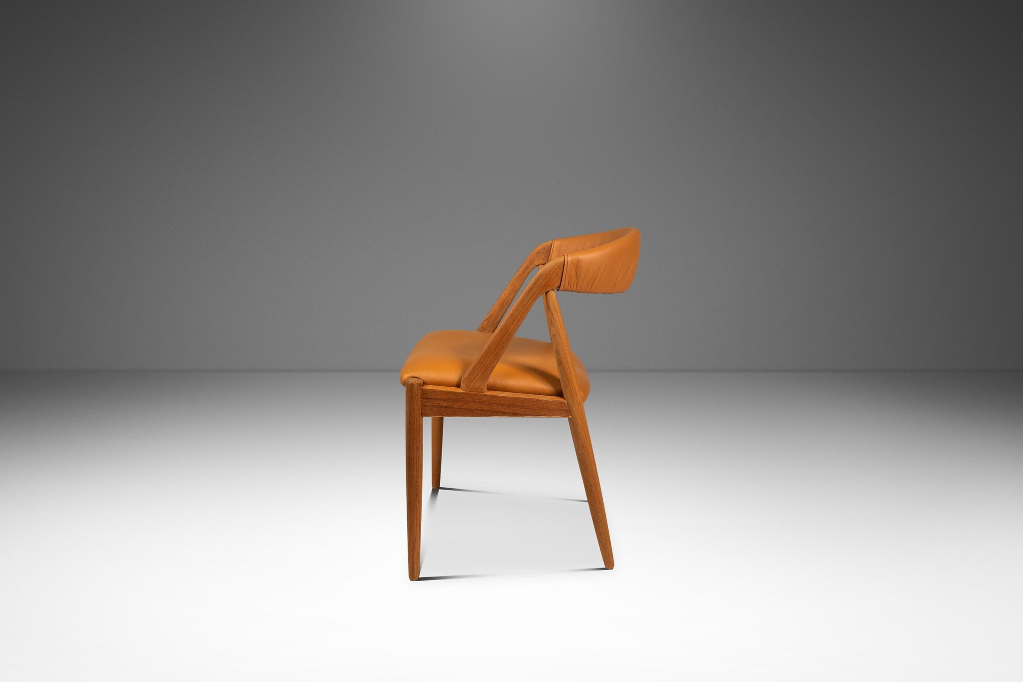 About: Introducing a set of bespoke Model 31 dining chairs designed by the influential Kai Kristiansen. Produced in Denmark in the 1960s these instantly recognizable chairs are constructed from a mix of solid and veneered Burmese teak, which have been sanded and left unfinished showcasing the natural beauty of the wood grain. The curved back and sculptural seat backs add a touch of elegance to the design, while the tapered legs add a sense of lightness and airiness. The seats have been re-strapped and reupholstered in a rich, thick-cut genuine leather hide in a fabulous hazelnut brown tone perfectly off-setting the natural wood tones of the solid teak frames.