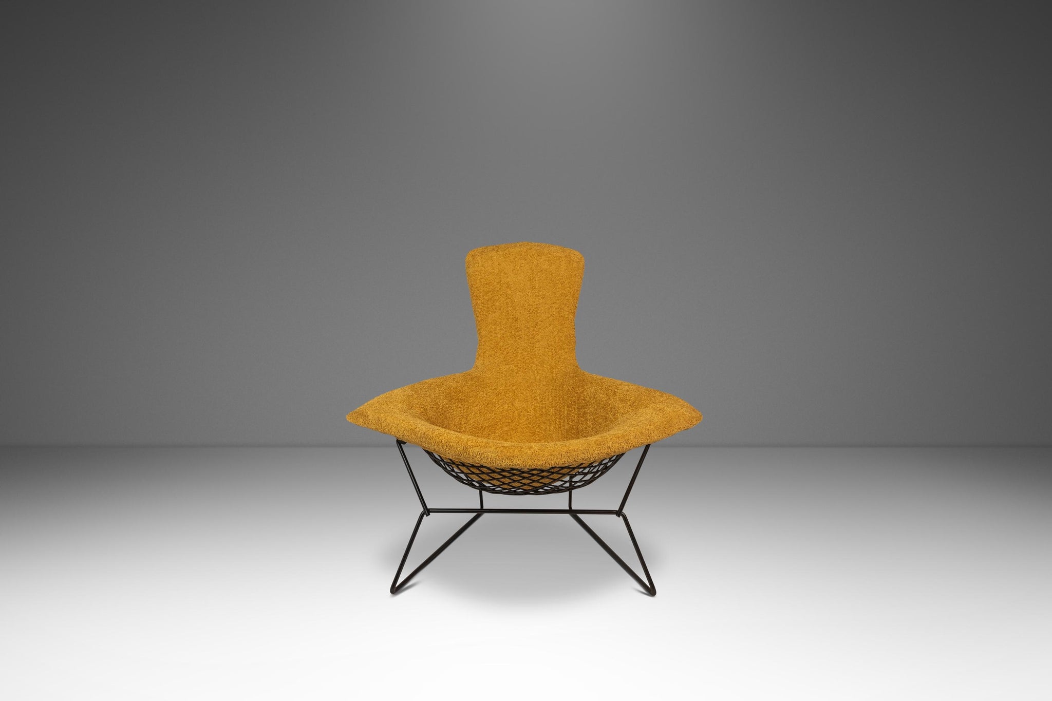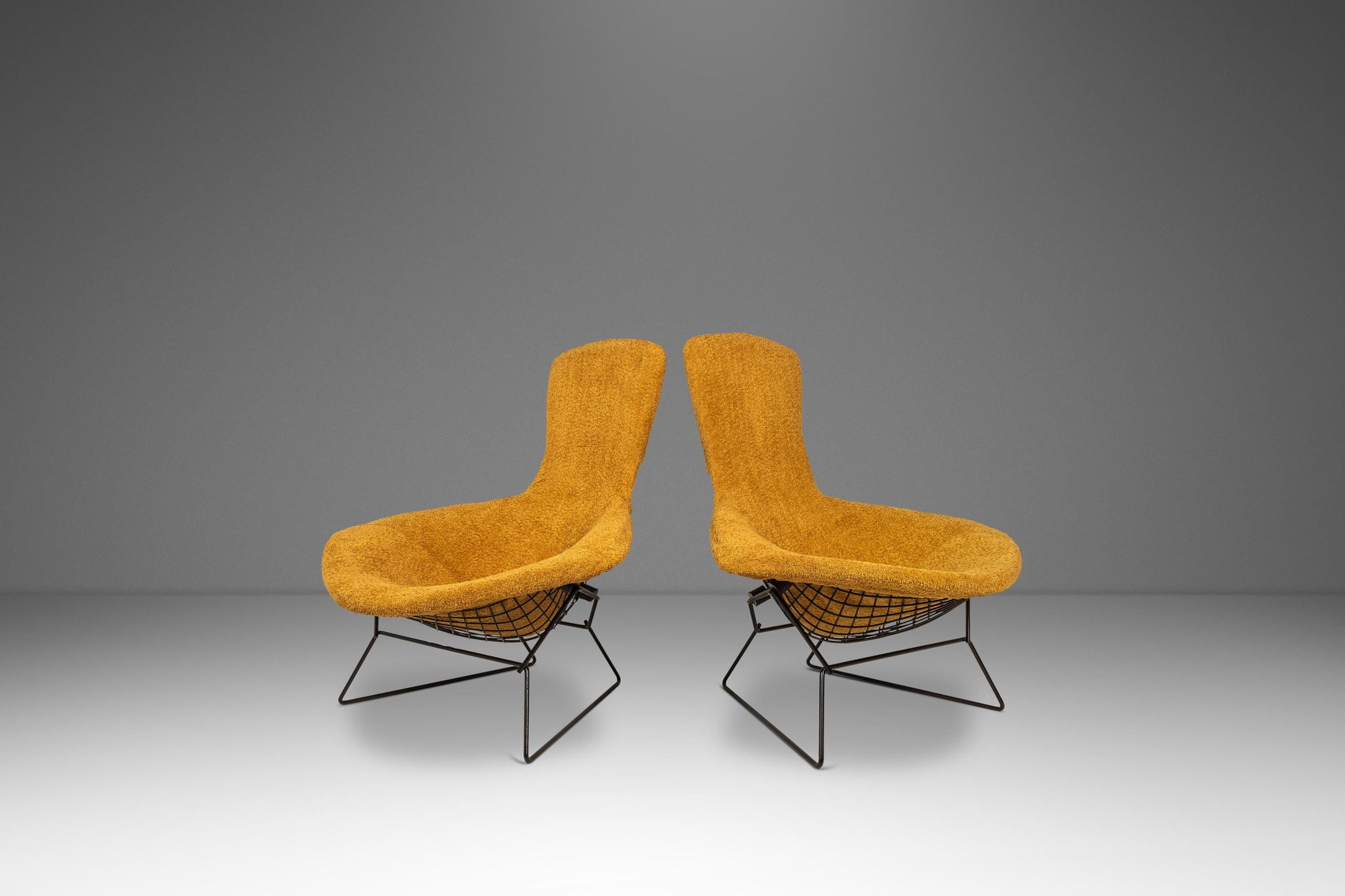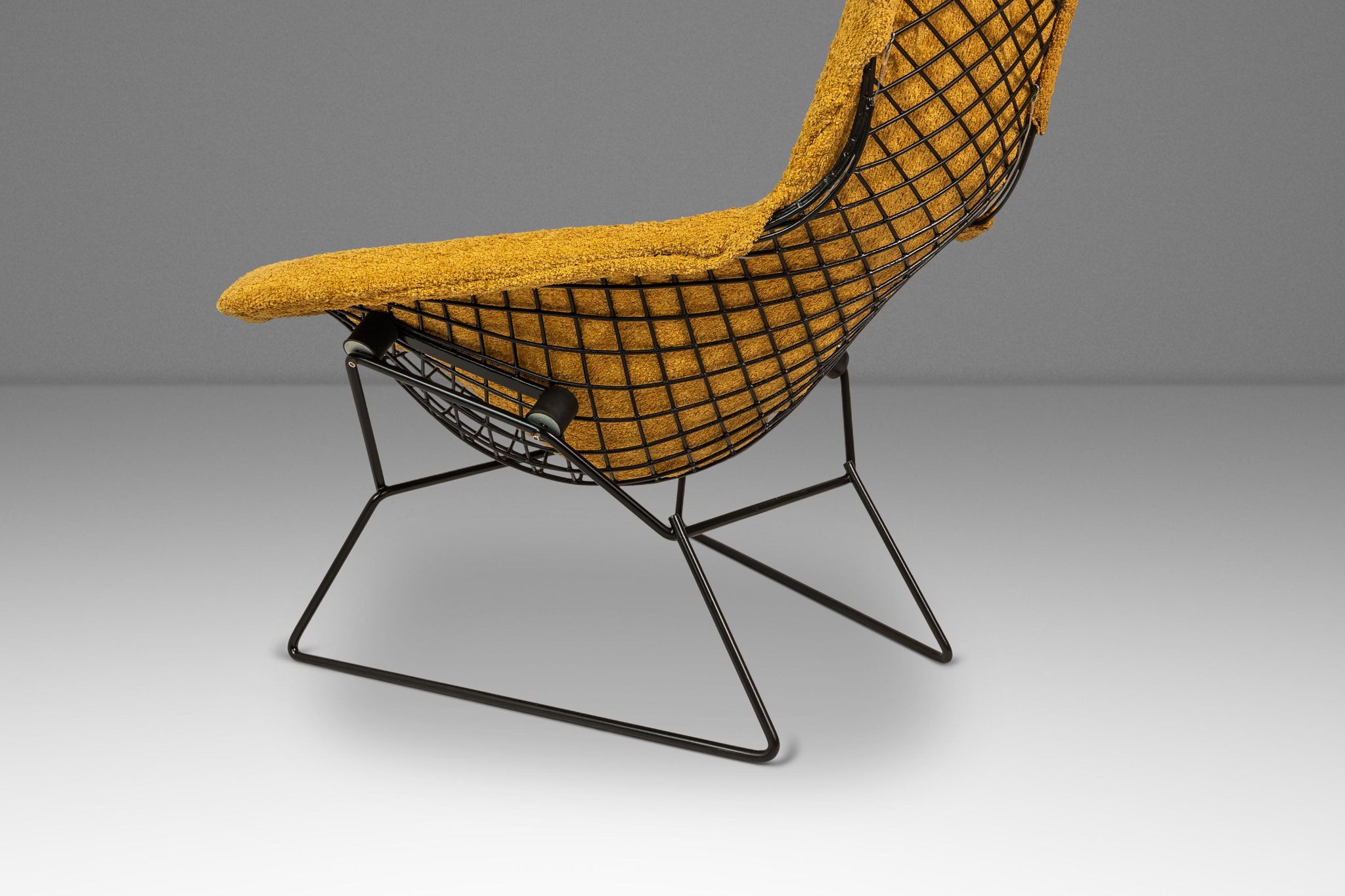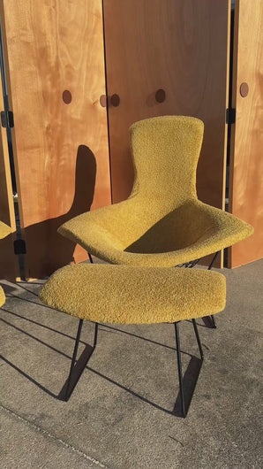 About: Introducing a rare and limited "Bird" chair designed by the influential Harry Bertoia for Knoll. First designed in the early 1950s for Knoll, the bird chair was by far one of Bertoia's most famous and recognized designs and formed part of his 5-piece wire-made body of work for Knoll called the "Bertoia Collection". The bird chair is characterized by a fluid, sculptural form made from a welded lattice work of steel. In Bertoia's own words, "If you look at these chairs, they are mainly made of air, like (a) sculpture. Space passes right through them." The chairs were produced with varying degrees of upholstery over their light grid-work, and they were handmade at first because a suitable mass production process could not be found and that's exactly how the upholstery was redone in our shop - by hand. Featuring new upholstery, in a fabulous kind-to-the-touch mustard bouclé, this iconic bird chair set is ready for a literal lifetime more of use.