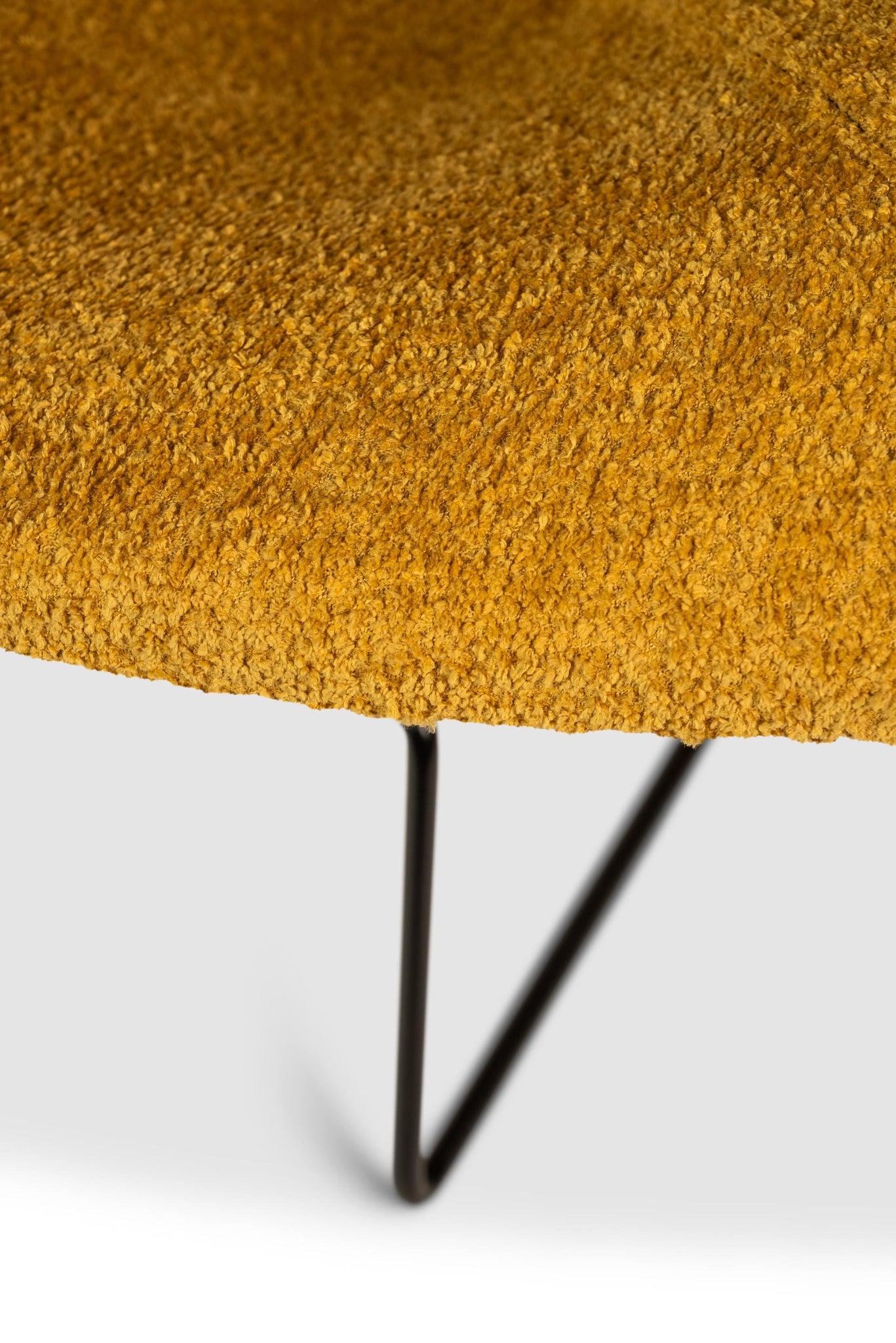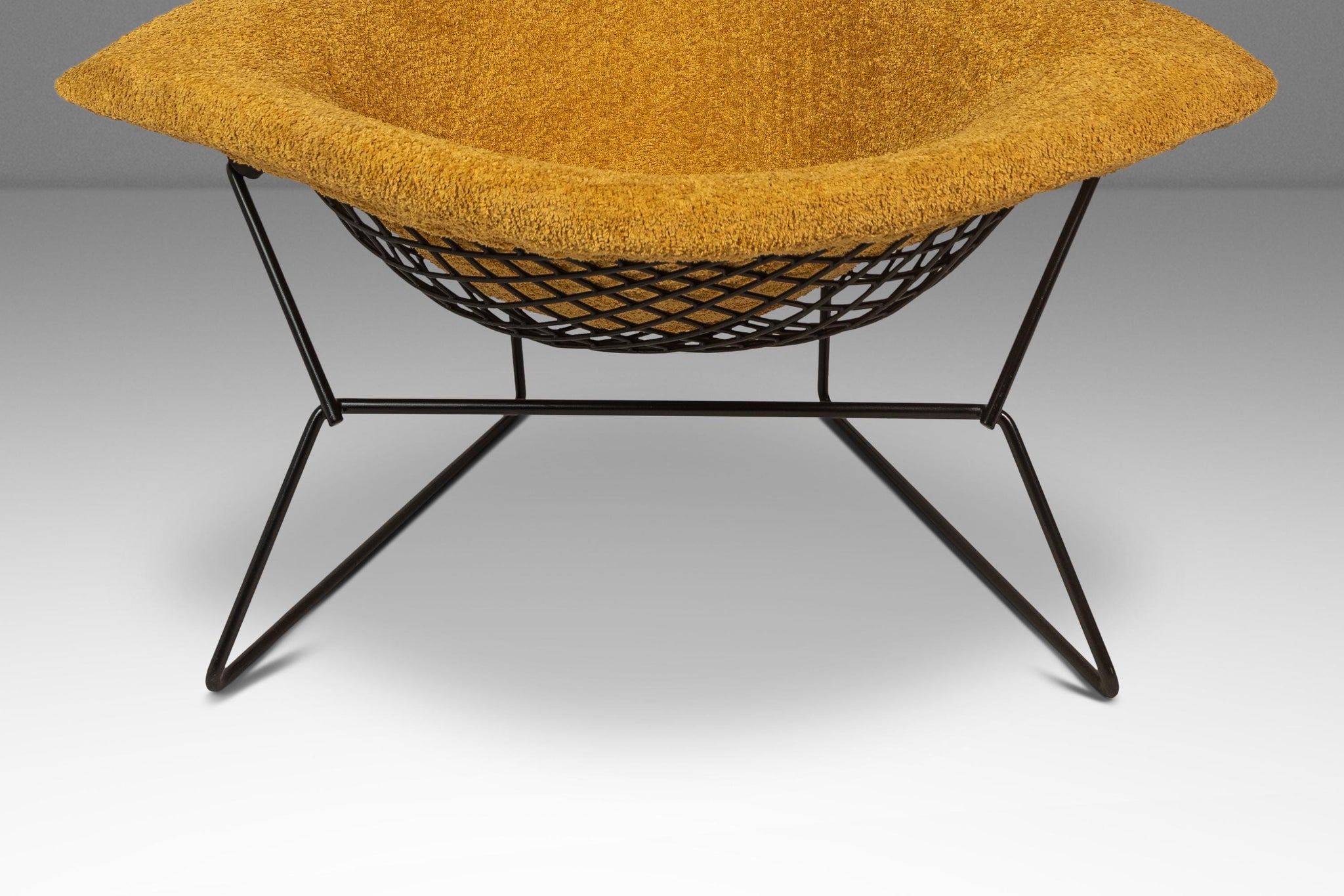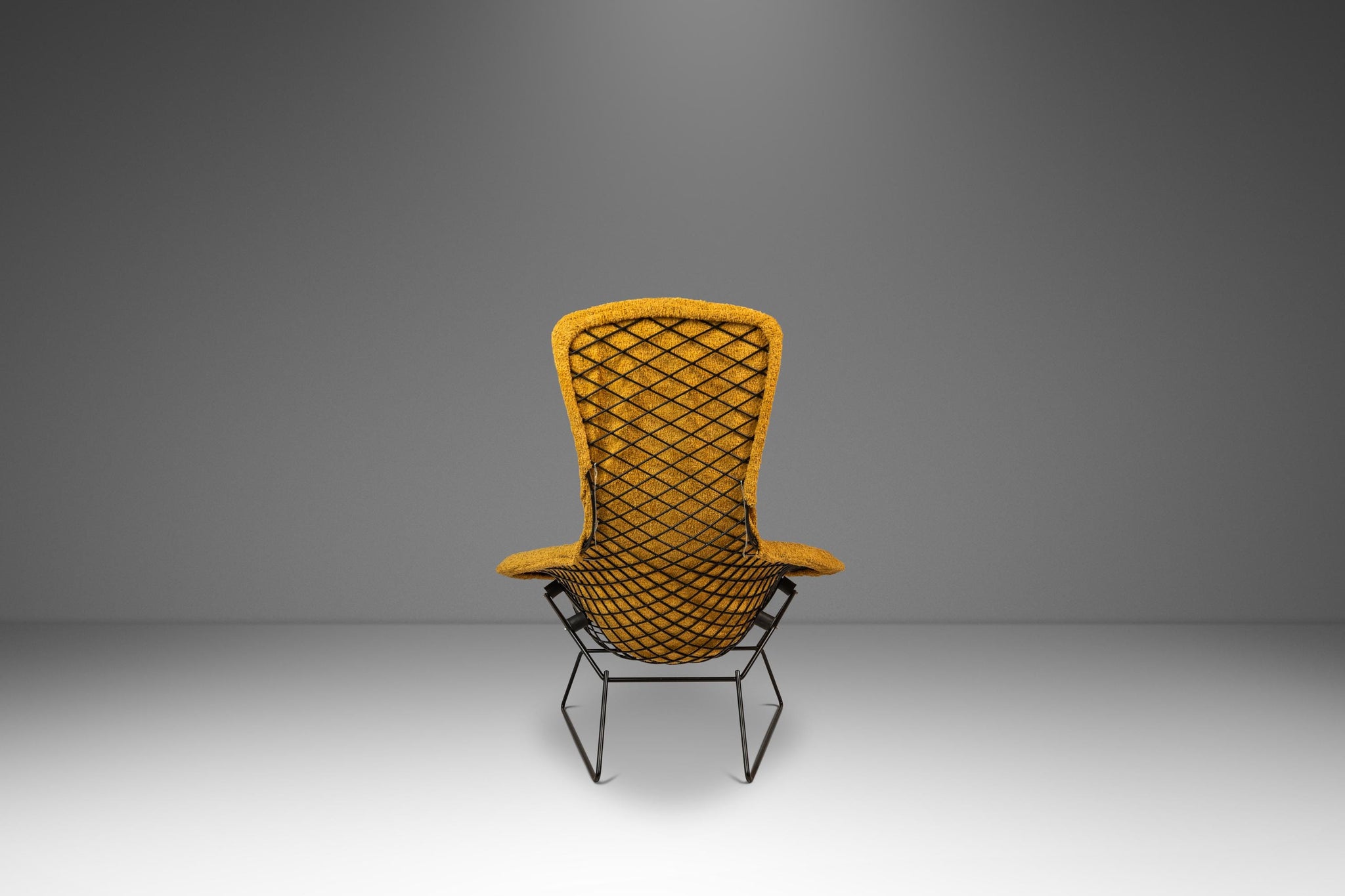 About: Introducing a rare and limited "Bird" chair designed by the influential Harry Bertoia for Knoll. First designed in the early 1950s for Knoll, the bird chair was by far one of Bertoia's most famous and recognized designs and formed part of his 5-piece wire-made body of work for Knoll called the "Bertoia Collection". The bird chair is characterized by a fluid, sculptural form made from a welded lattice work of steel. In Bertoia's own words, "If you look at these chairs, they are mainly made of air, like (a) sculpture. Space passes right through them." The chairs were produced with varying degrees of upholstery over their light grid-work, and they were handmade at first because a suitable mass production process could not be found and that's exactly how the upholstery was redone in our shop - by hand. Featuring new upholstery, in a fabulous kind-to-the-touch mustard bouclé, this iconic bird chair set is ready for a literal lifetime more of use.