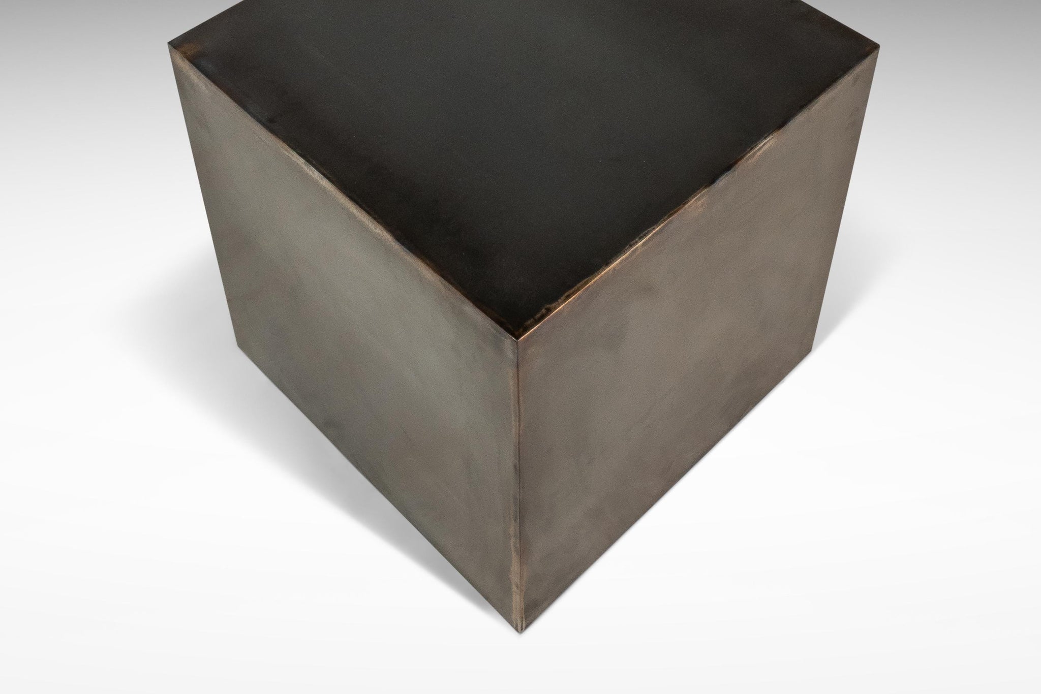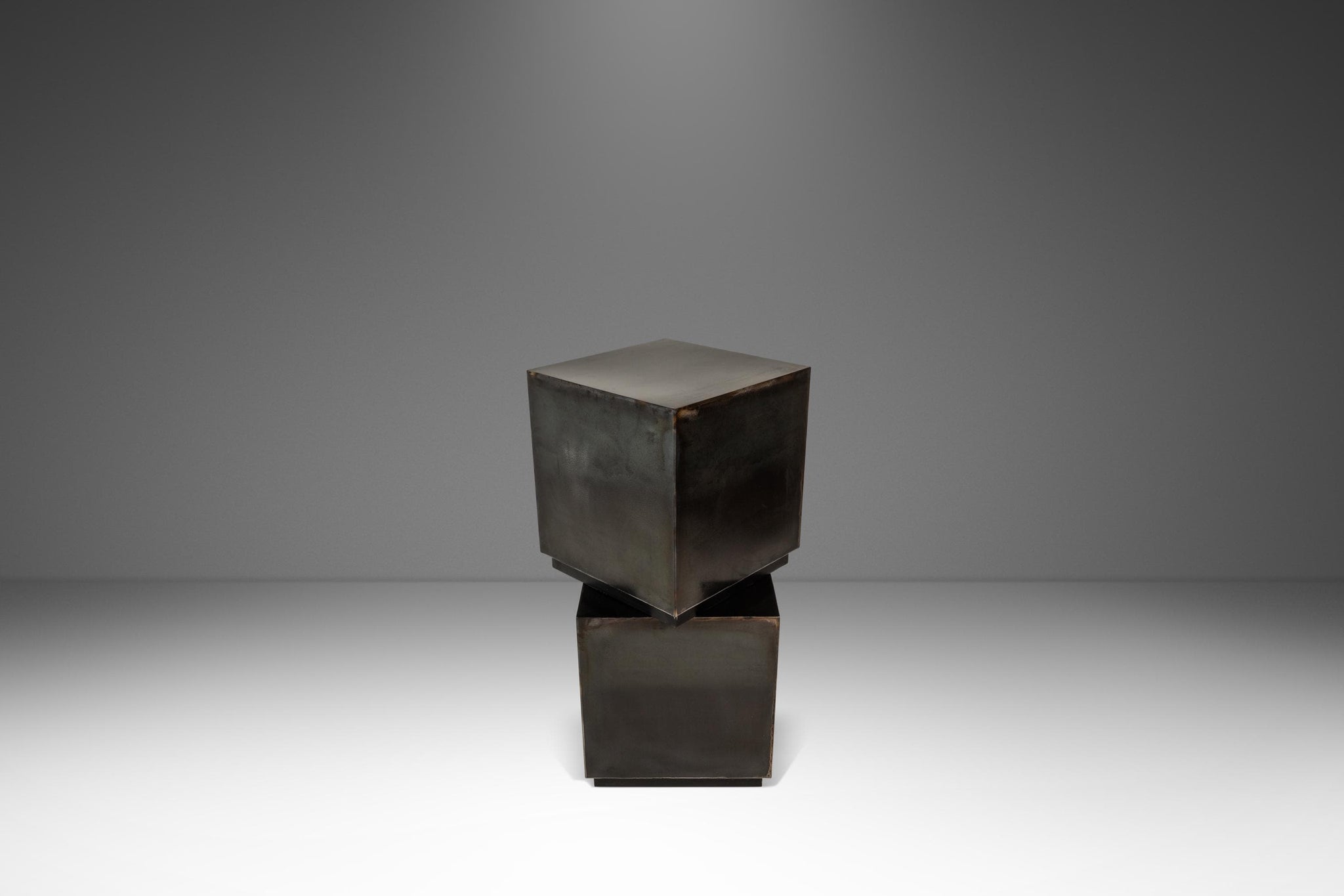 Title: Set of Two (2) Mid-Century Modern Industrial Brutalist Cubes / End Tables / Pedestals in Patinaed Metal, USA, c. 1970s