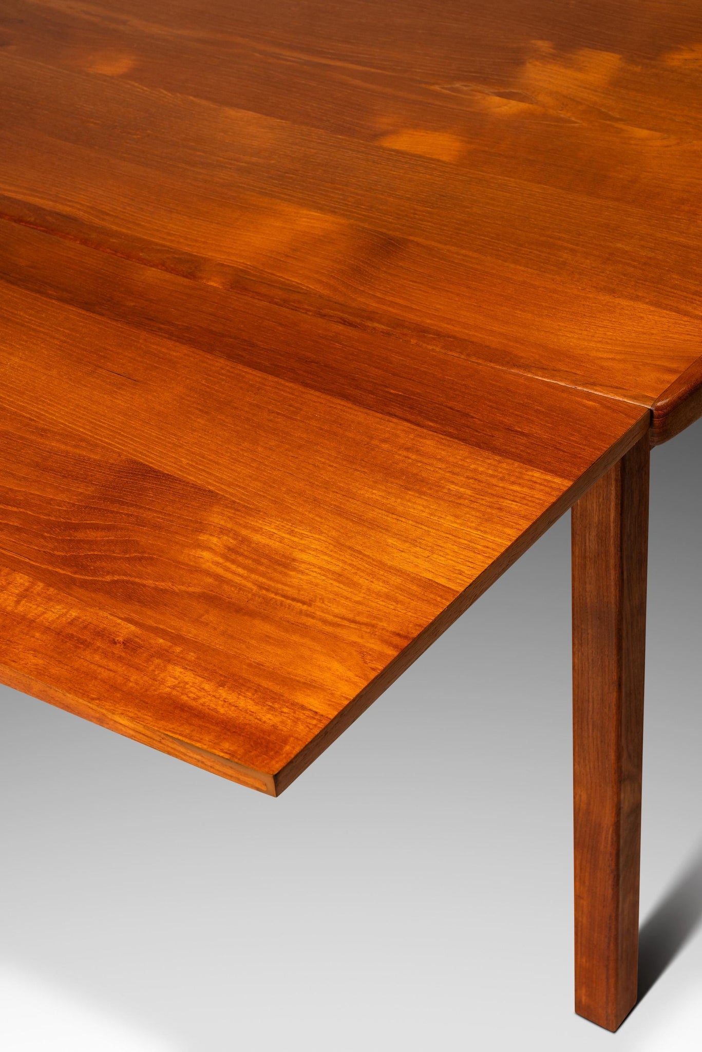 Condition Details: Save for a few minor veneer repairs this splendid Scandinavian Modern dining table is in original, vintage condition and has aged to perfection! As mentioned the table shows some minor veneer repairs which can be seen in the detail photos provided but in aggregate the mix of solid and veneered Burmese teak is in excellent condition and the woodgrains are absolutely mesmerizing in natural light. Both leaves easily expand and contract and conveniently stow in the table.