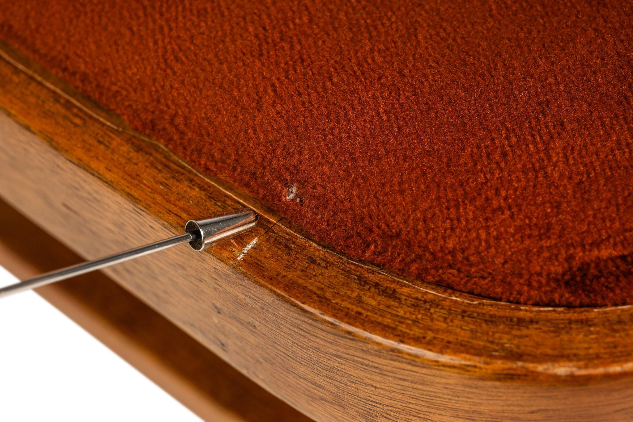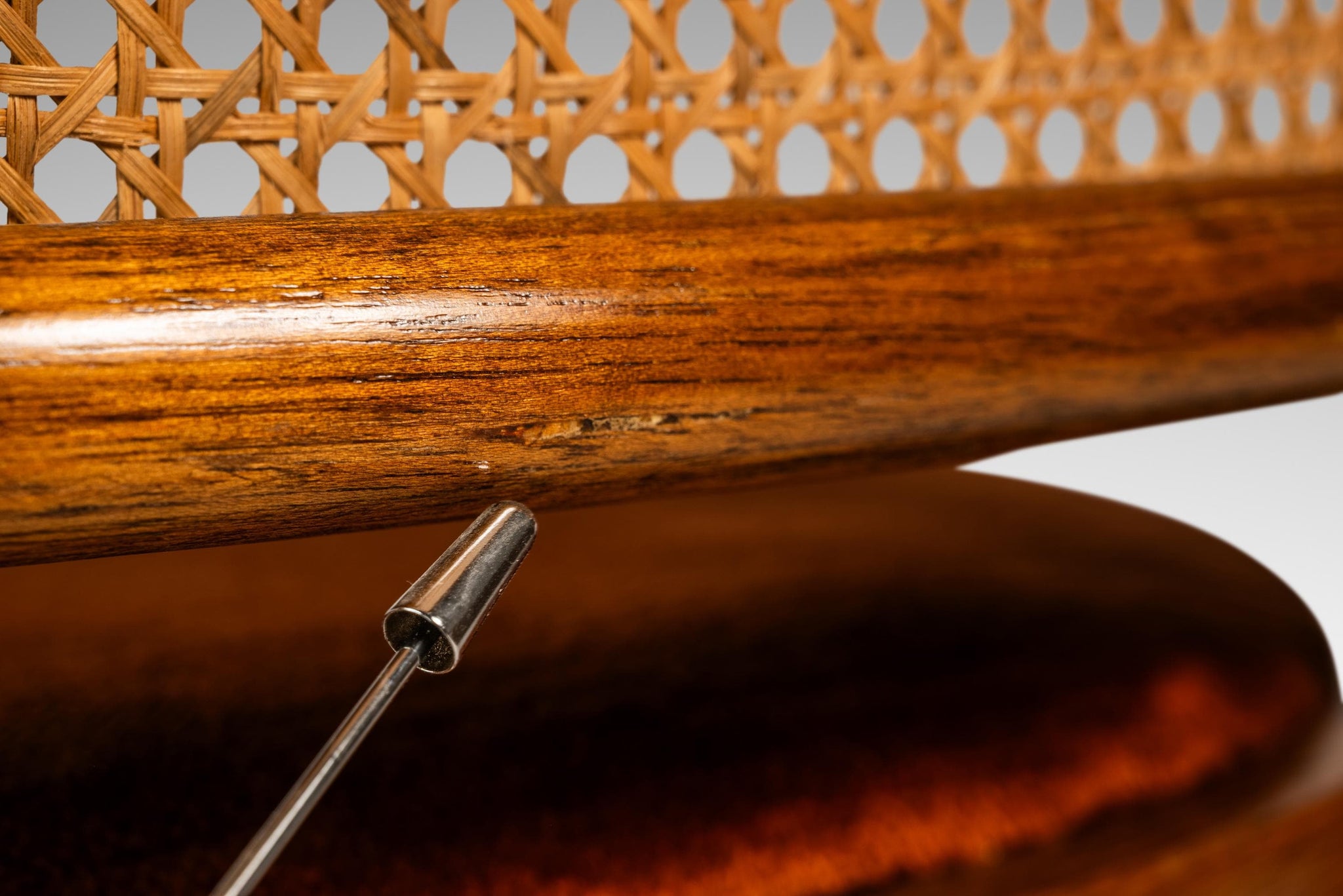 The caning is in excellent shape showing no stains or breaks whatsoever and all backrests are weight-bearing. The woolen seats show only minor burns (the worst of which can be seen in the detail photos provided). If desired, we can re-upholster this set in a fabric of your choosing. If this service interests you please message us prior to checkout to discuss options and pricing.