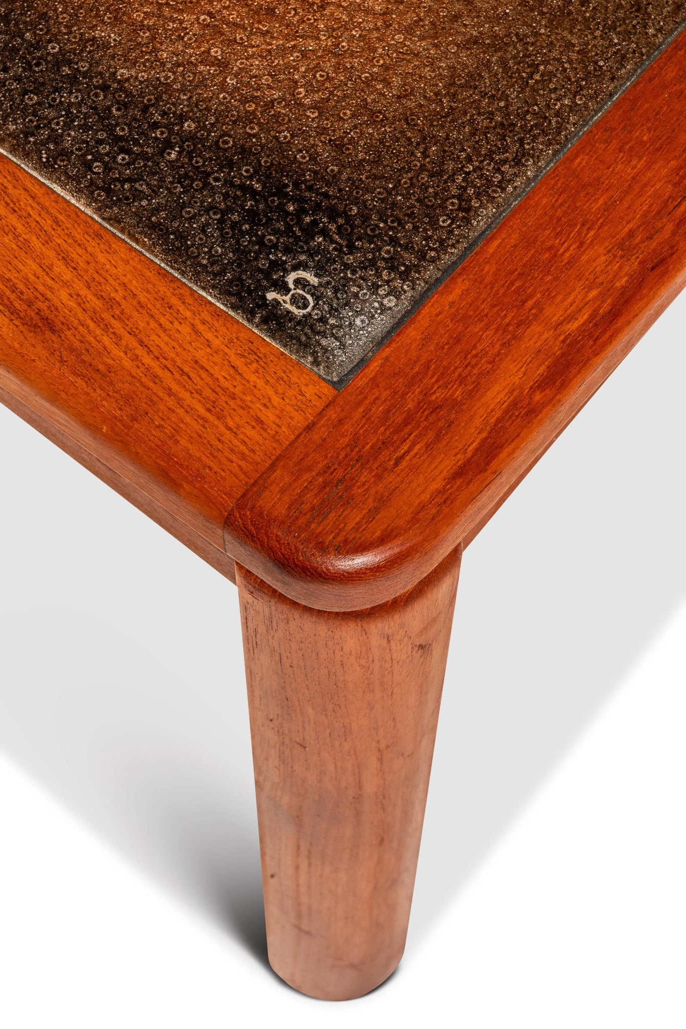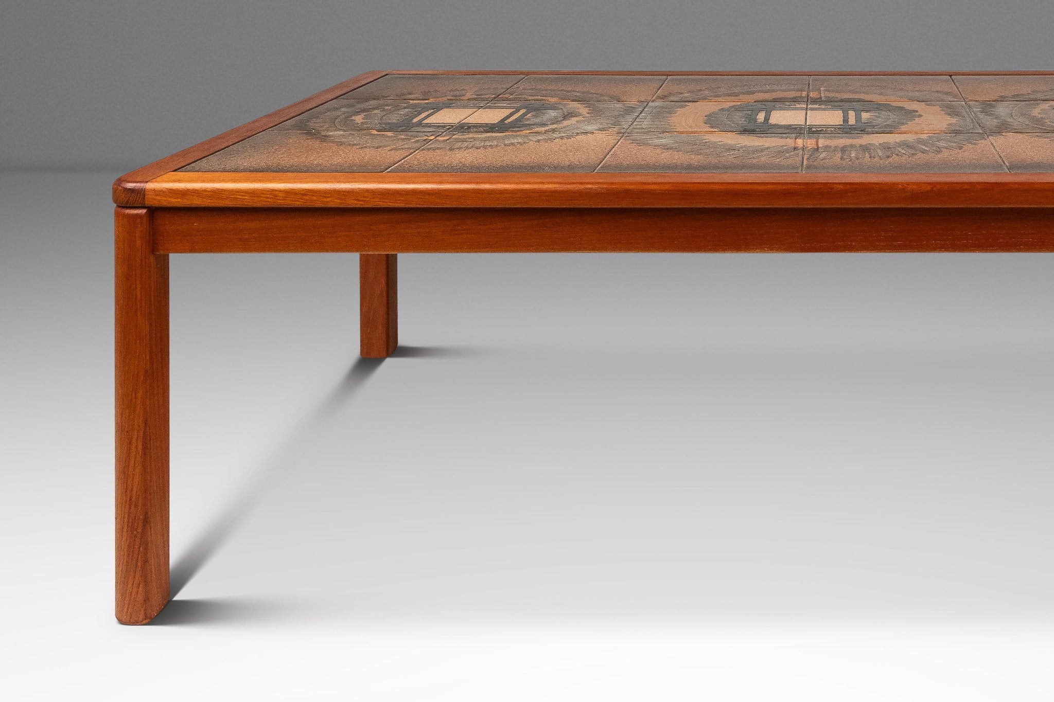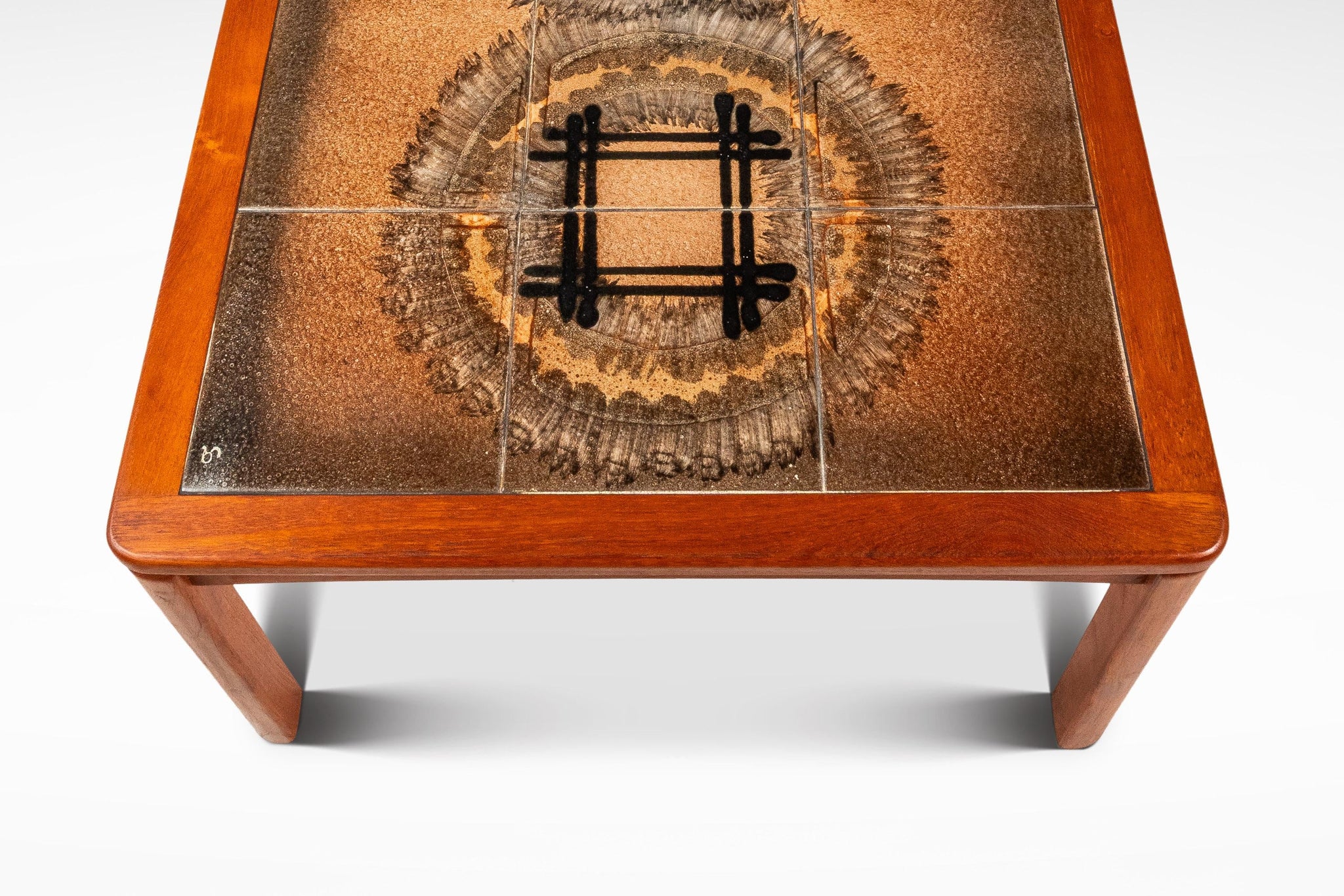 About: Introducing a true Danish Modern treasure: a rare, signed coffee table designed by the well respected and prolific Johannes Andersen. Featuring a table top constructed from ceramic tiles, painted with intriguing geometric shapes as well as a frame of solid Burmese teak with exceptional woodgrains this table is the very epitome of "functional art". In rare stunning original condition this piece is ideal for collectors searching for an authentic Andersen table that is ready for a lifetime more of use.