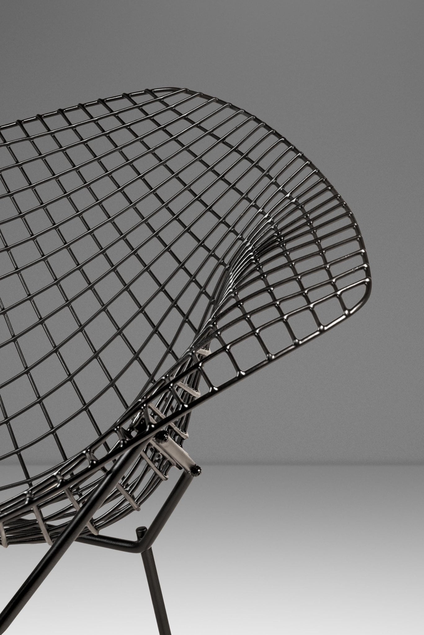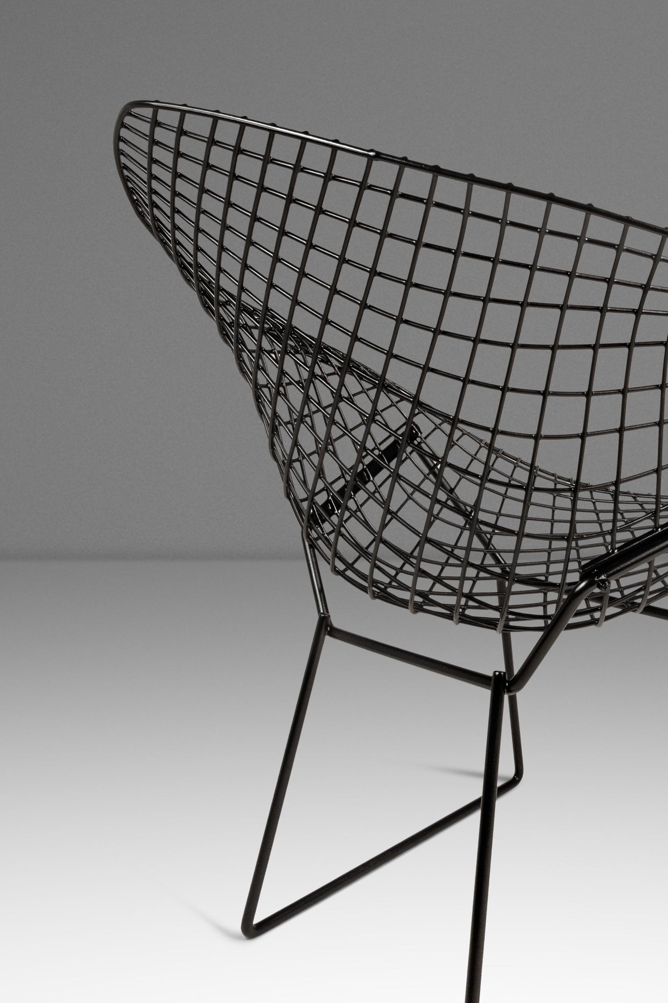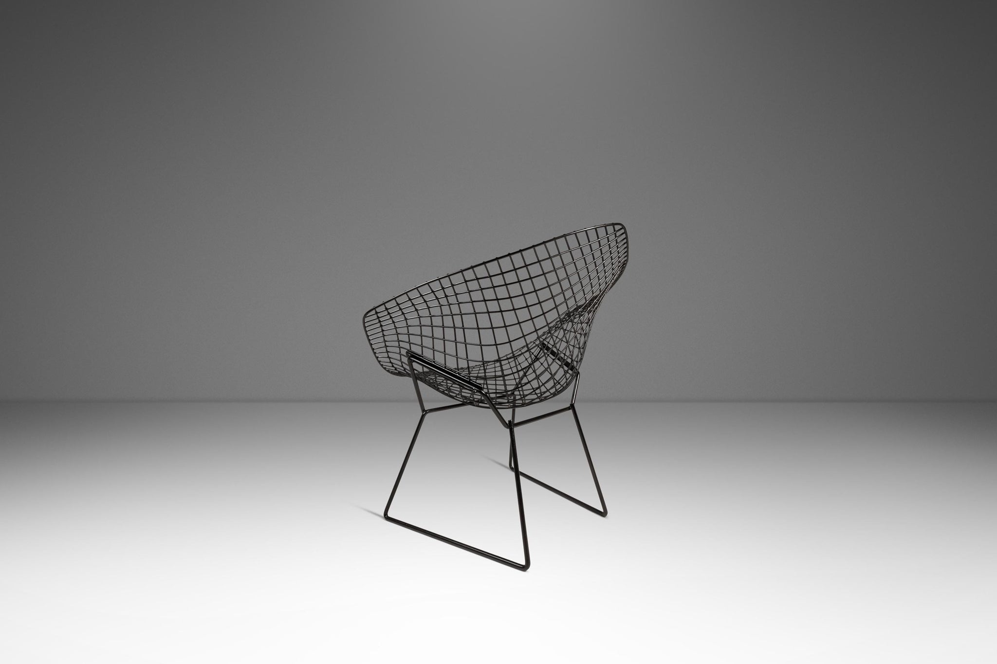 About: Introducing a rare authentically vintage "Diamond" chair designed by the influential Harry Bertoia for Knoll. First designed in 1952 for Knoll, the diamond chair was by far Bertoia's most famous and recognized design and formed part of his 5-piece wire-made body of work for Knoll called the "Bertoia Collection". The Diamond chair is characterized by a fluid, sculptural form made from a welded lattice work of steel. In Bertoia's own words, "If you look at these chairs, they are mainly made of air, like (a) sculpture. Space passes right through them." The chairs were produced with varying degrees of upholstery over their light grid-work, and they were handmade at first because a suitable mass production process could not be found and that's exactly how the upholstery can be re-done for this chair - by hand. Featuring new automotive-grade, single-stage polyurethane paint, this truly iconic chair is ready for re-upholstery a fabric of your choosing.