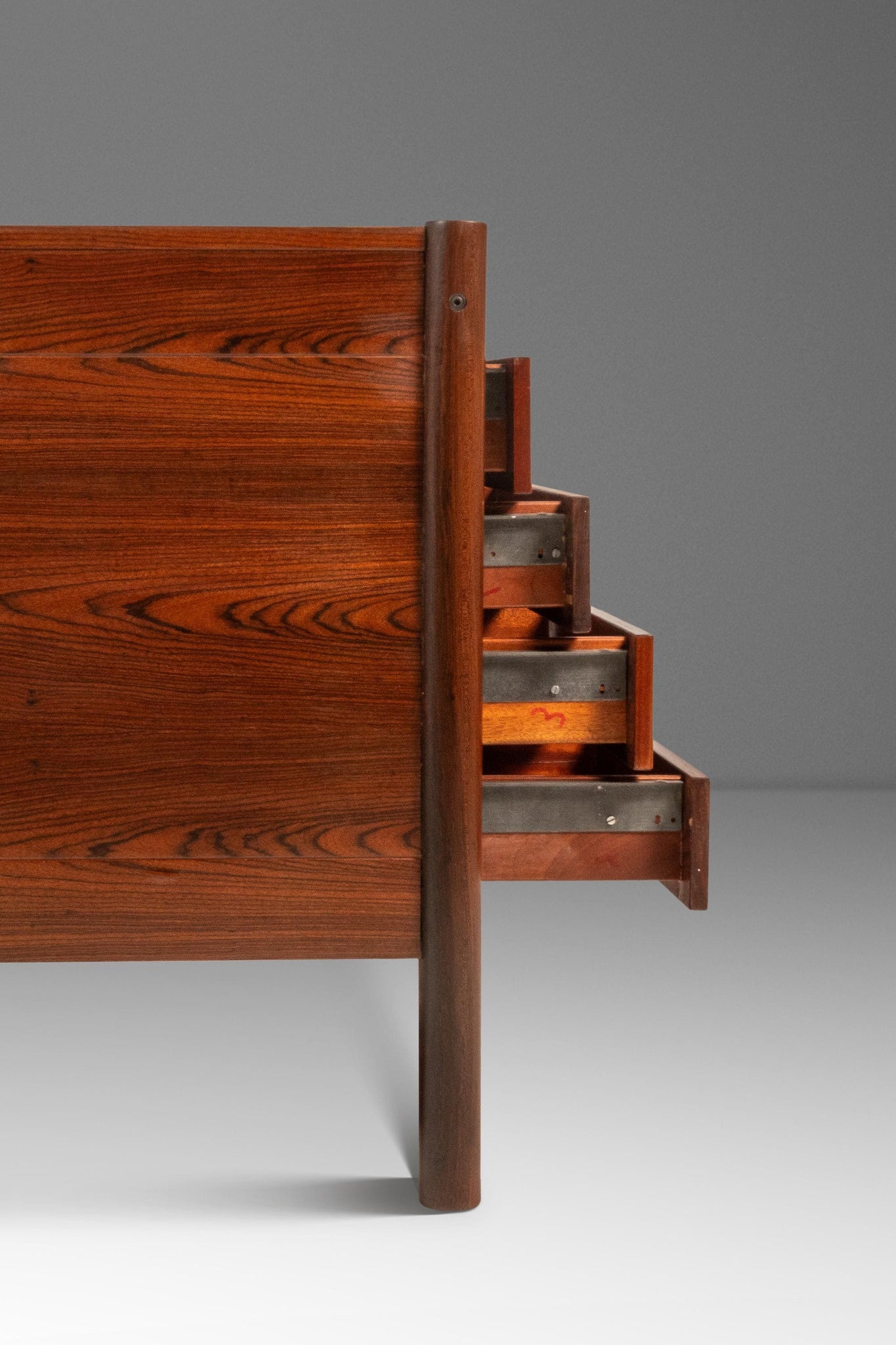 About: This sophisticated Mid-Century Modern executive desk, designed by Jean Gillon and manufactured by Italma in Brazil during the late 1960s, exemplifies luxurious craftsmanship. Crafted from solid wood and veneered in jacarandá (Brazilian rosewood), it showcases the material’s prized grain and natural beauty. Featuring clean, modernist lines and dual pedestals, the desk includes a left side with a pull-out shelf and three drawers, and a right side with one pull-out shelf and a single file drawer. In excellent condition, this minimalist masterpiece elevates any office or collector’s space, appealing to designers and enthusiasts alike.