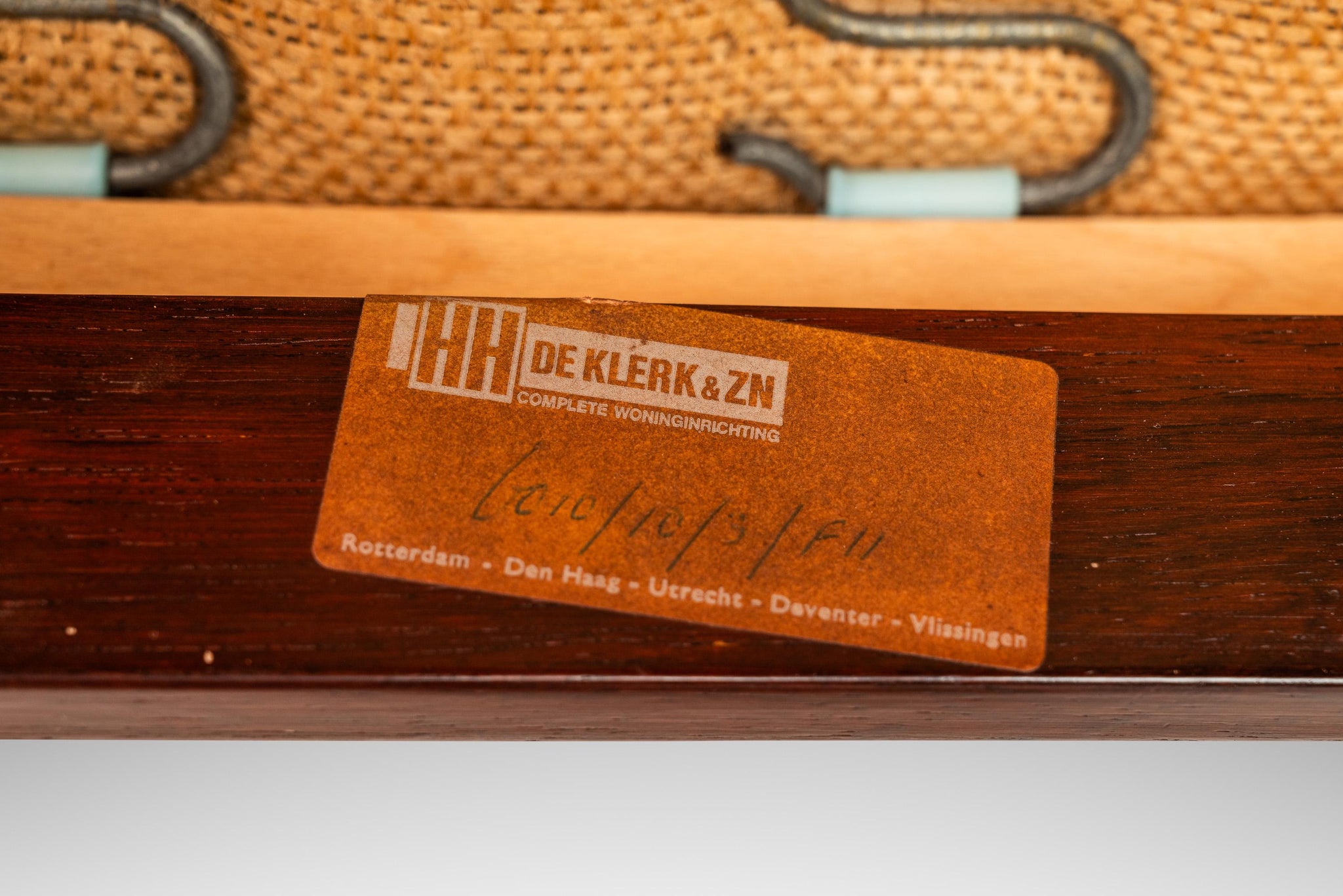 About: Introducing a rare, Dutch-made pair of armchairs produced by the lauded Amsterdam-based De Klerk & Sons firm. Built from a frame of solid Brazilian rosewood with stunning, variegated woodgrains unique to the rare hardwood this set has been recently and meticulously restored featuring new leather upholstery painstakingly hand-stitched to the exact layout and scheme as the original. The rosewood has been hand-sanded and refinished bringing the outstanding woodgrains back to their original luster.