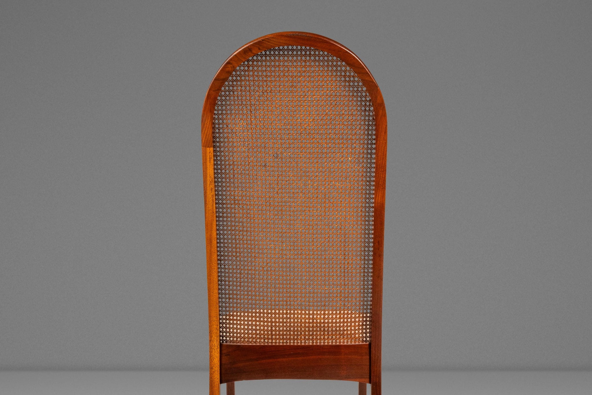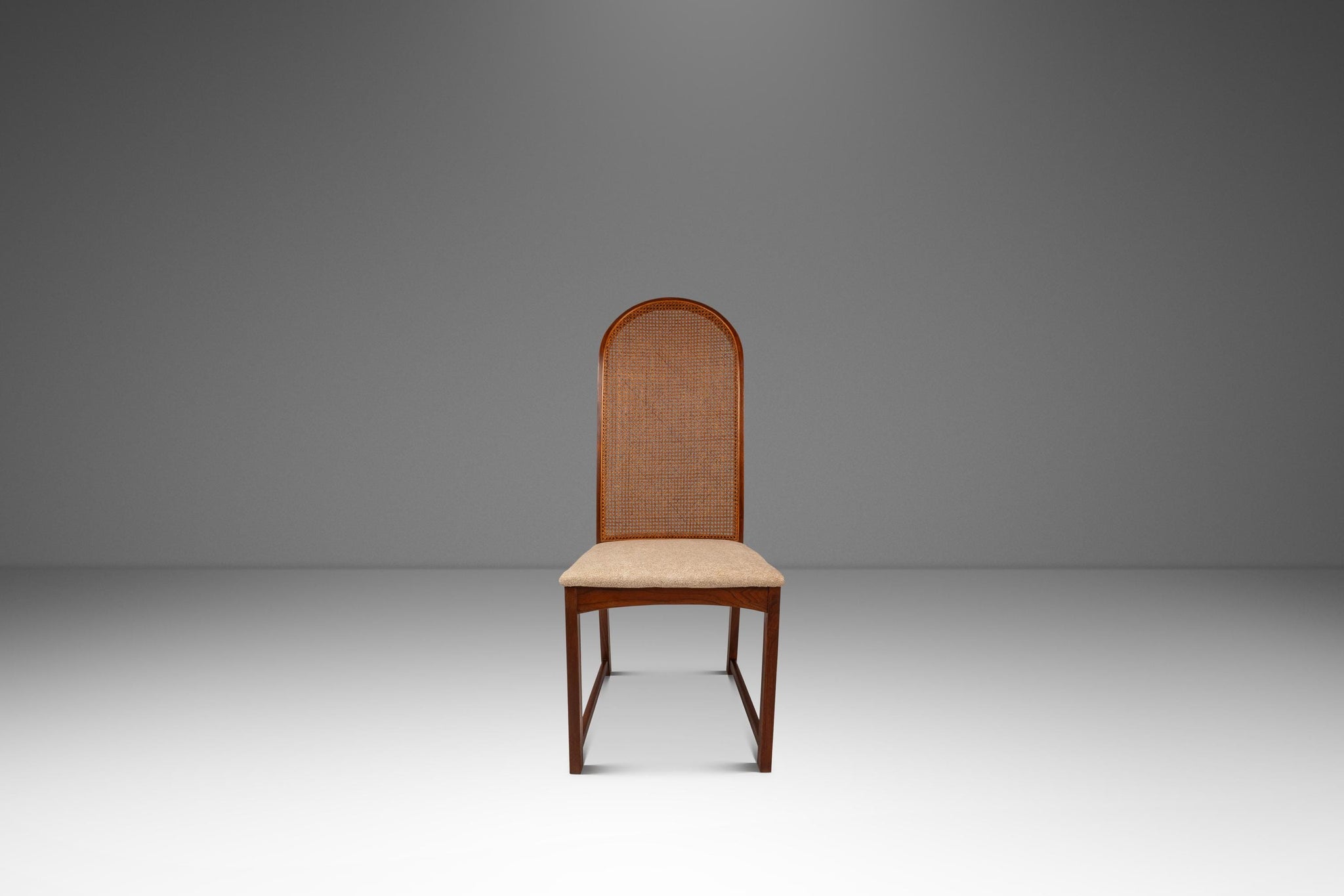 About: Introducing an ultra-rare set of cane-back dining chairs designed by the influential Milo Baughman for Directional made in the 1950's. Constructed from a frame of solid American black walnut with stunning variegated woodgrains this set of dining chairs feature architecturally and visually fascinating hoop-shaped, caned backrests. The caning, in superb original condition, adds a sense of airiness for an otherwise grandiose chair. With new upholstery, redone in a kind to the touch cotton blend fabric, this set is ready for a literal lifetime more of use.