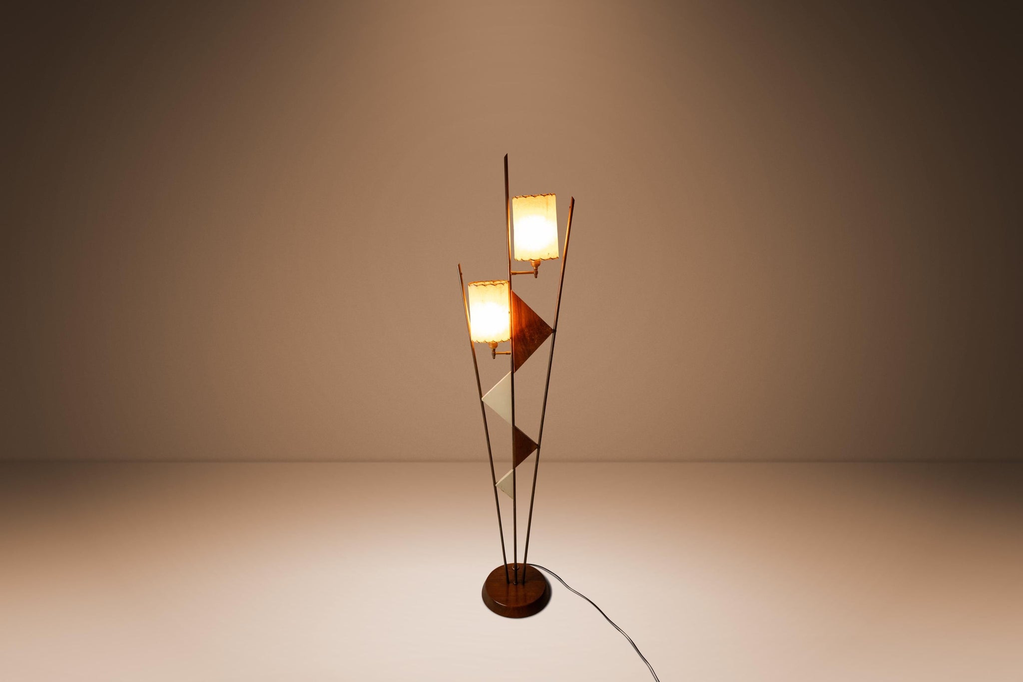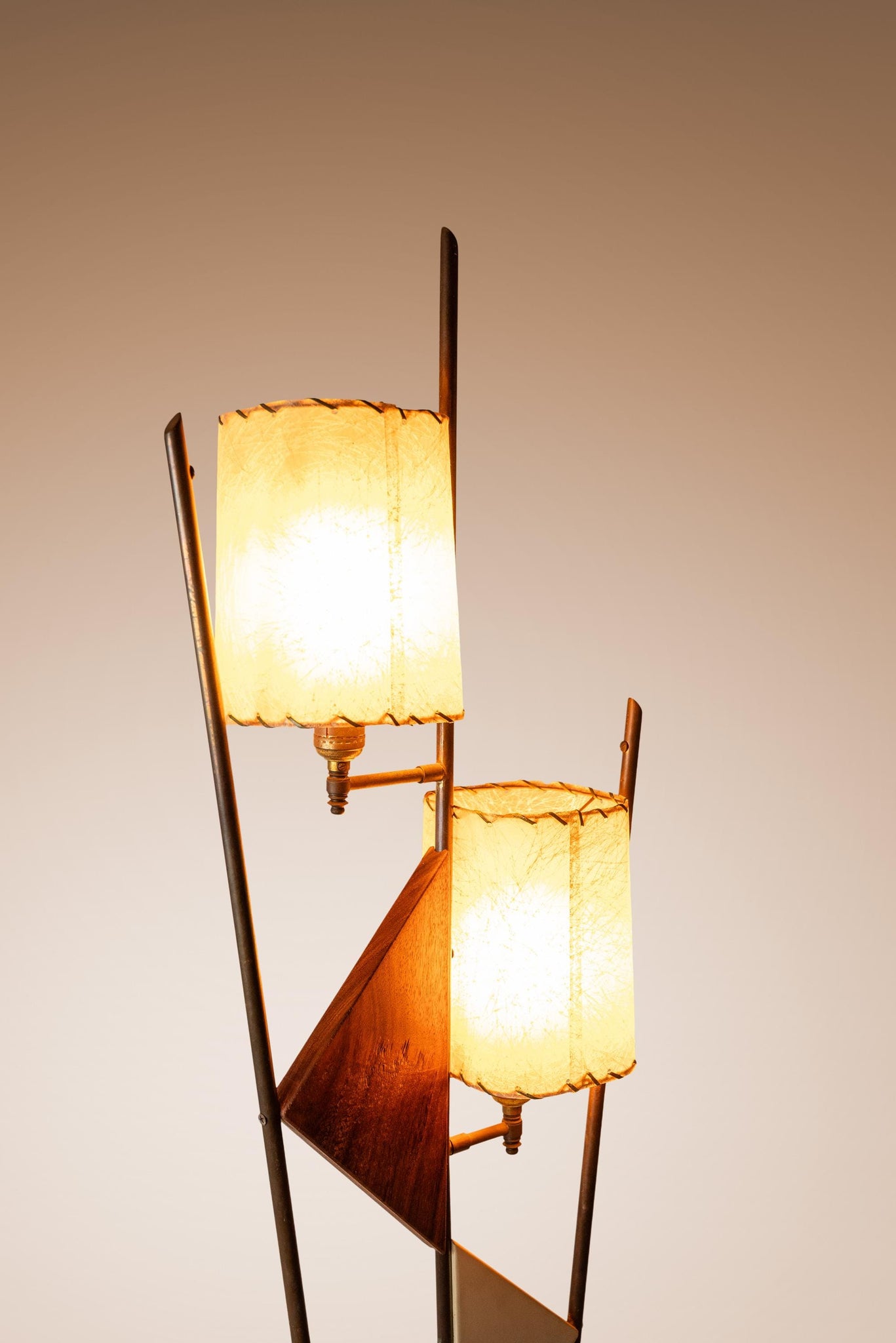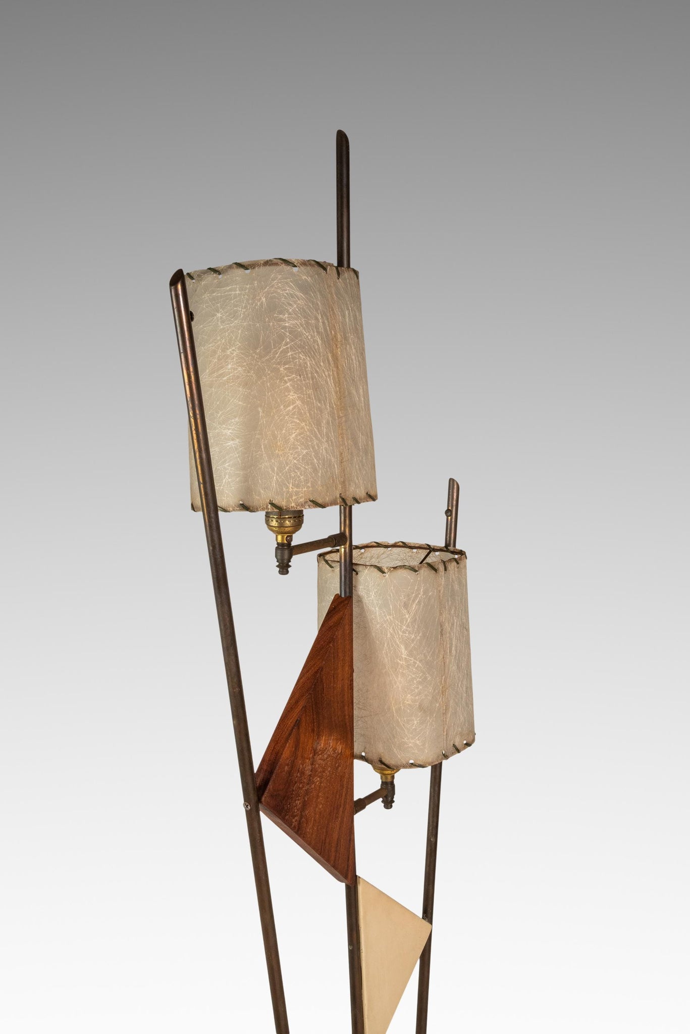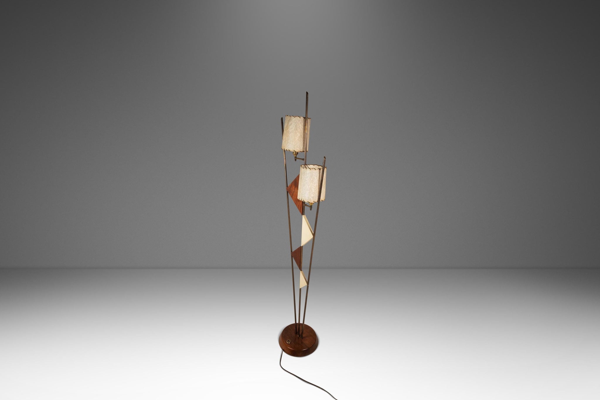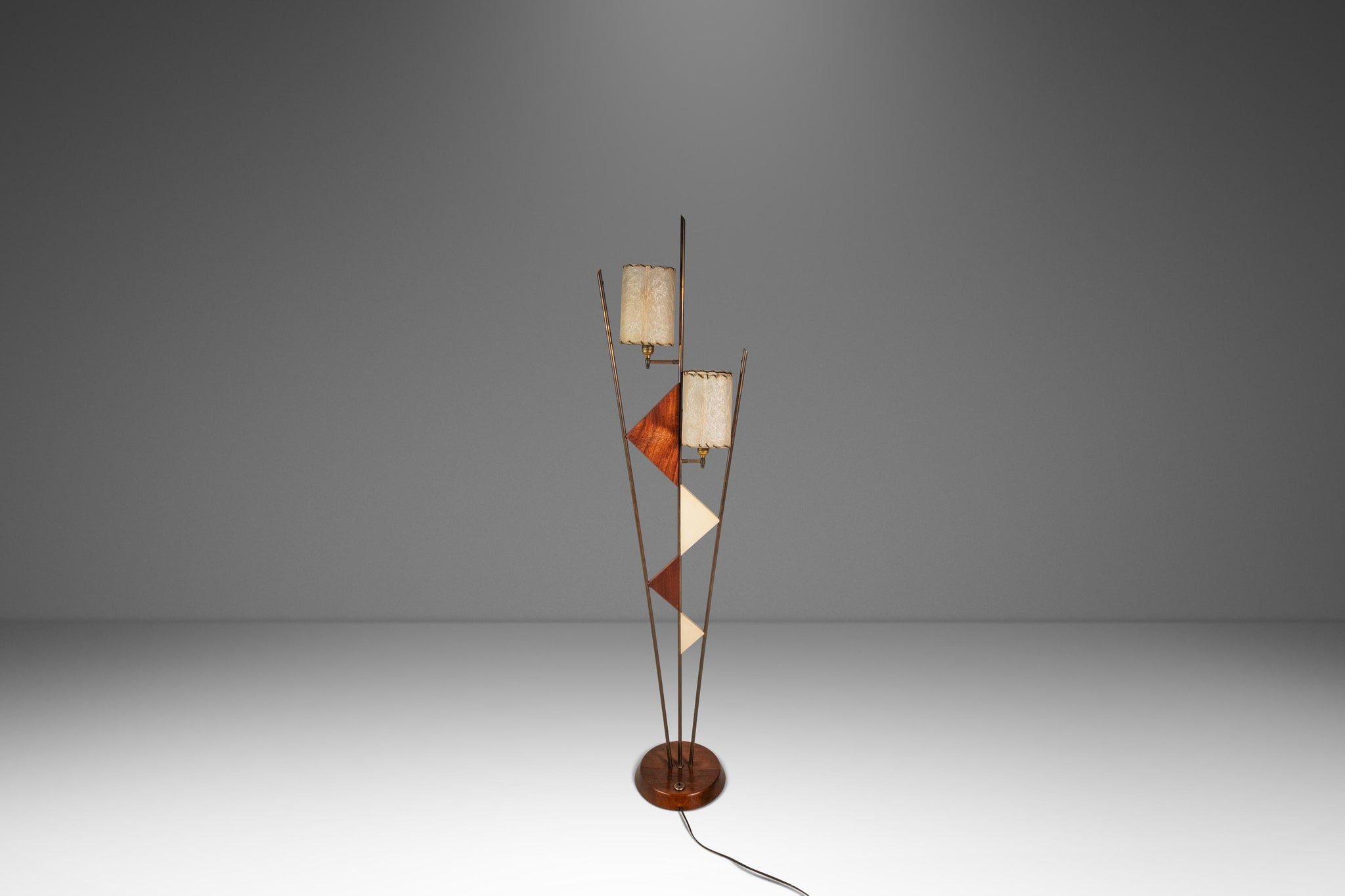 The lamp shades, custom made and sewn from paper-like fiberglass, add yet more character and capture the viewers' eye from every angle. The brass upright risers, supporting two-tone geometric shapes cut from solid black walnut, add to an altogether fascinating amalgamation of design elements from industrial to space age and harkens back to the 1950s almost instinctively. With nothing out there like it, this extraordinary lamp won't last long. Make it yours today before it's gone forever.