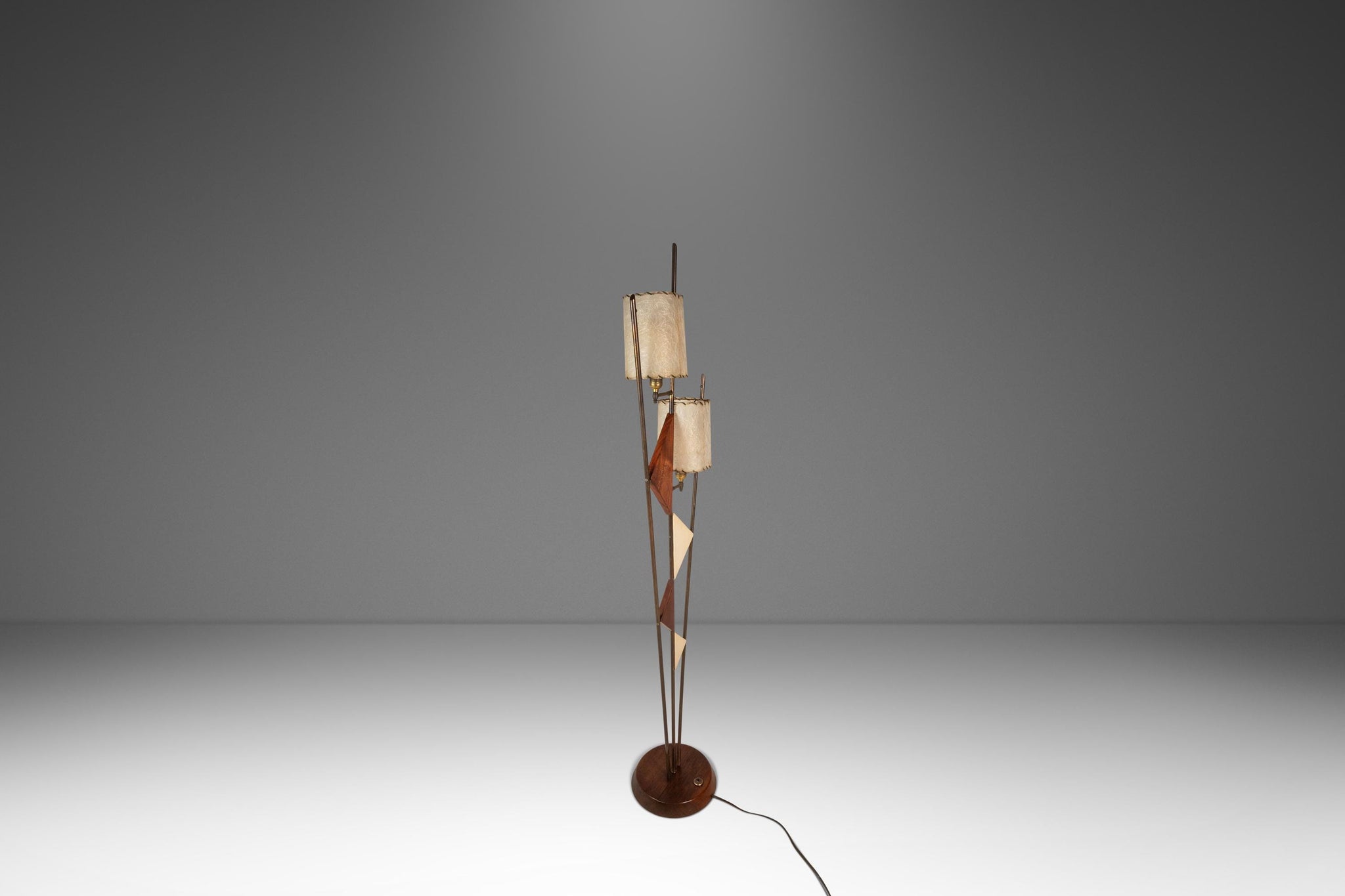 Condition Details: This extraordinary floor lamp has recently undergone a partial restoration. The solid walnut base and accent pieces have been hand-sanded and refinished with new clearcoat as was originally produced in the 1950s. Some minor scratches remain on the base, the worst of which can be seen in the detail photos provided.
