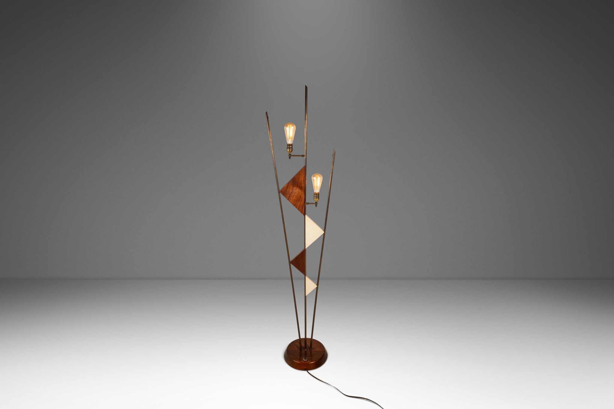Title: Mid-Century Modern Art Deco Atomic Era Custom-Made Floor Lamp w/ Geometric Shapes in Walnut & Brass, USA, c. 1950s