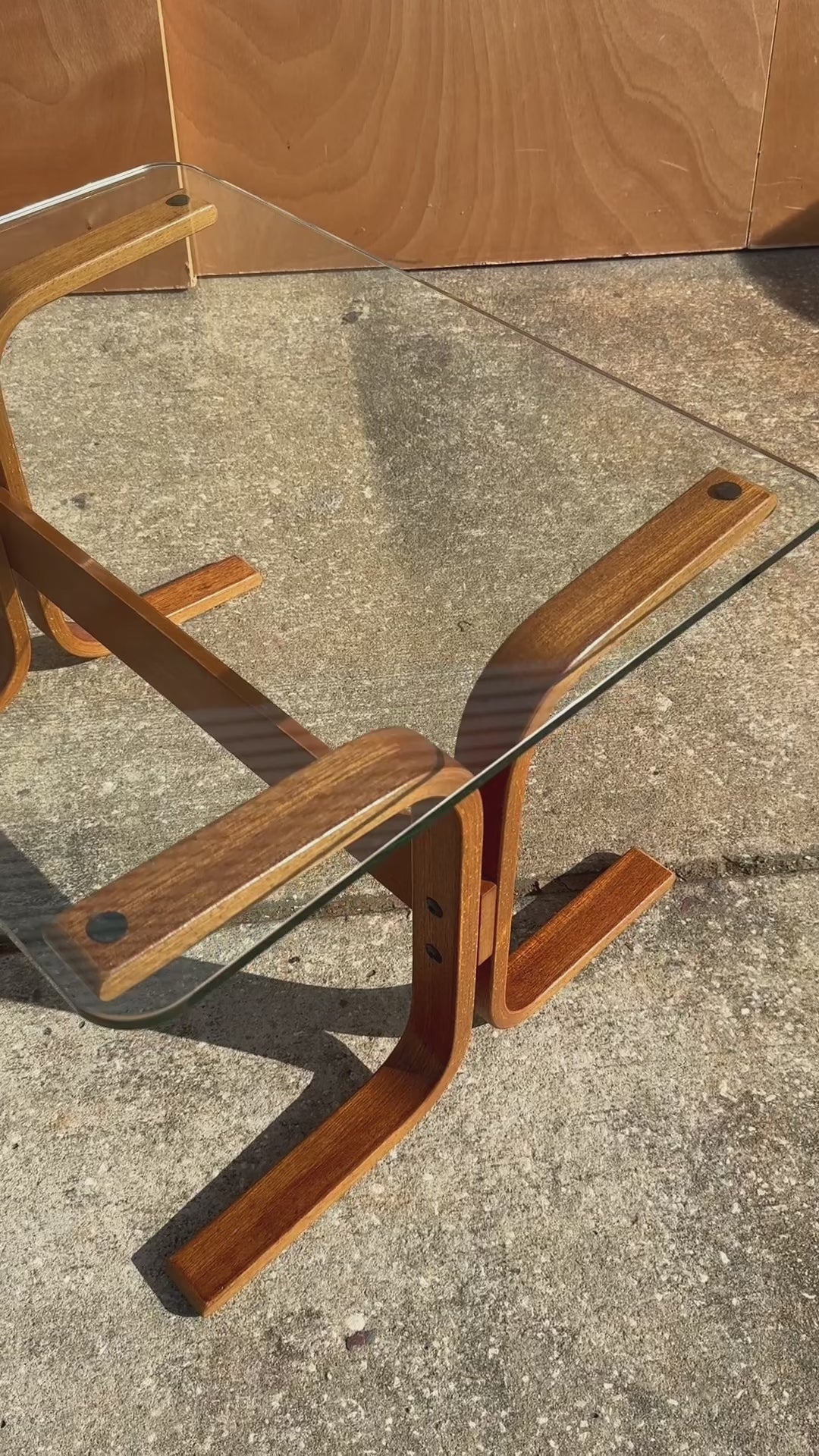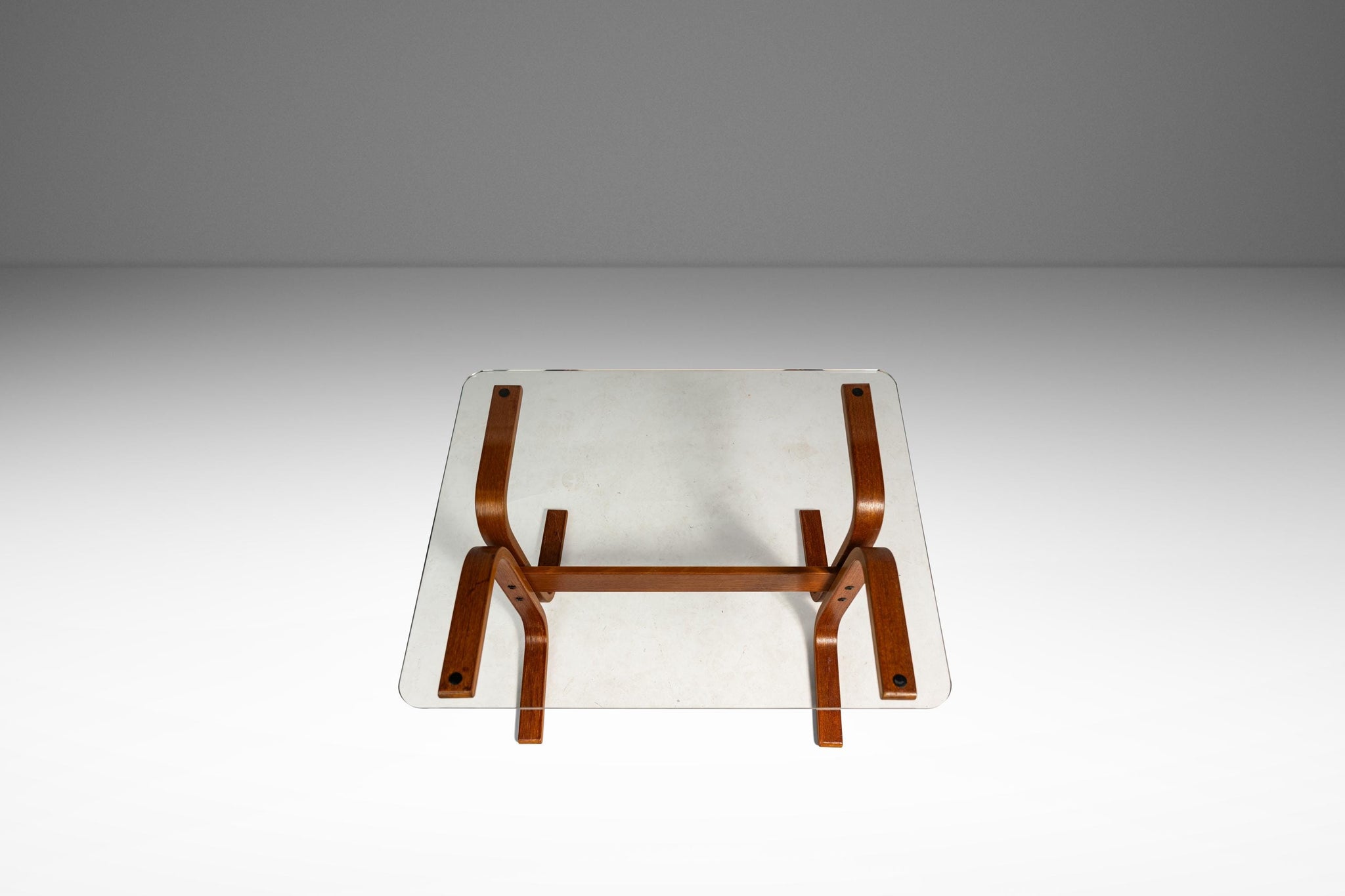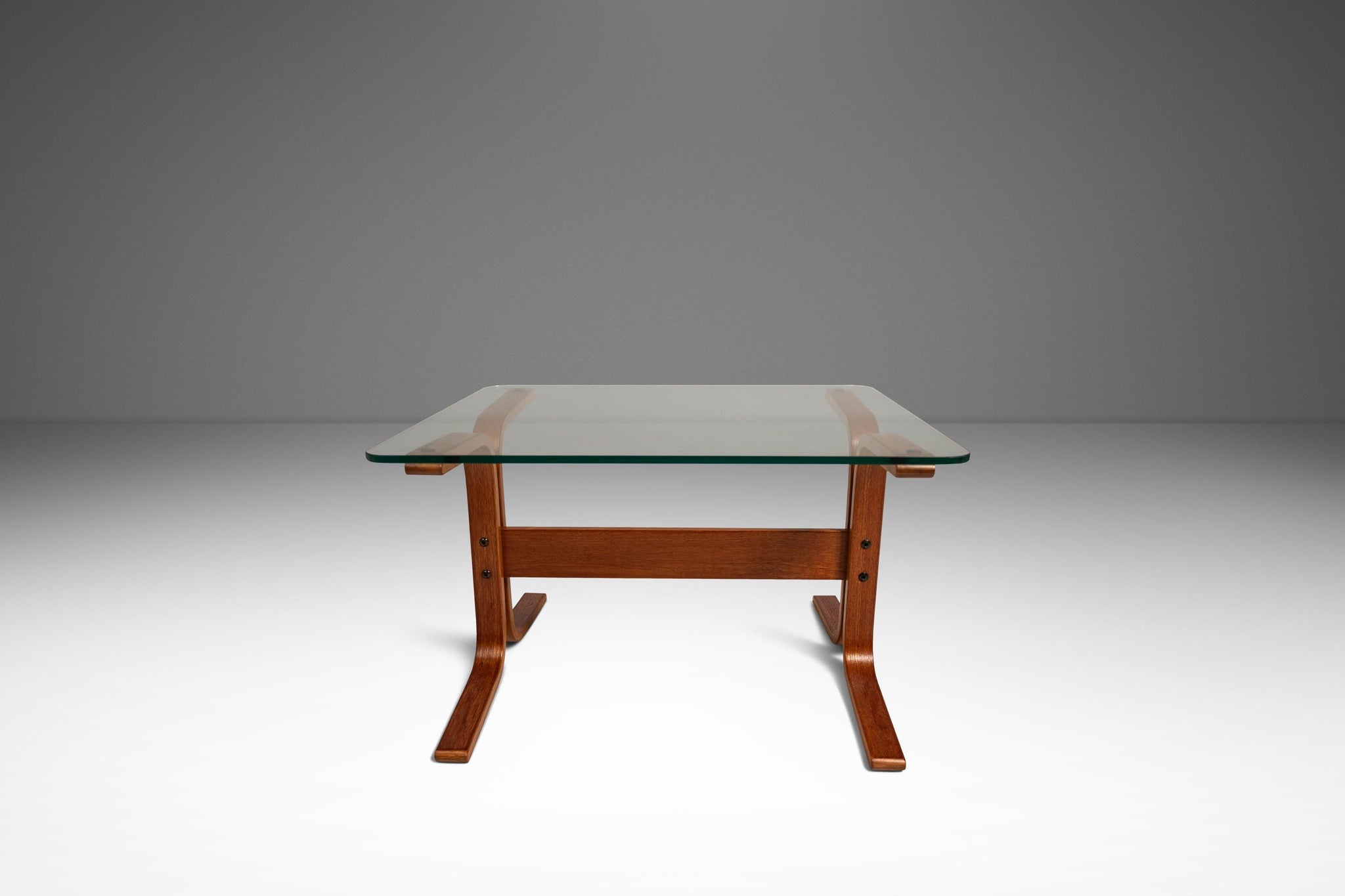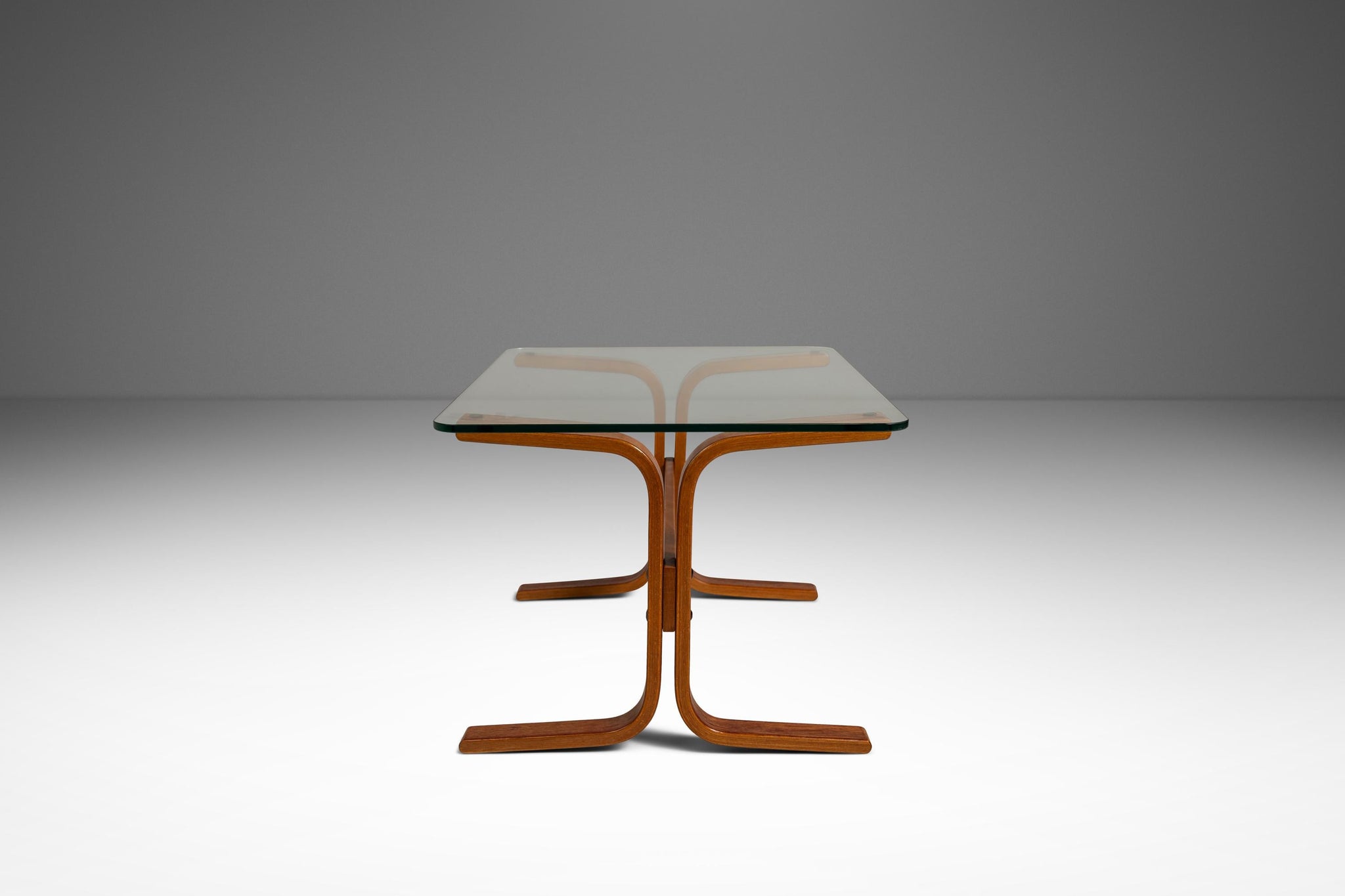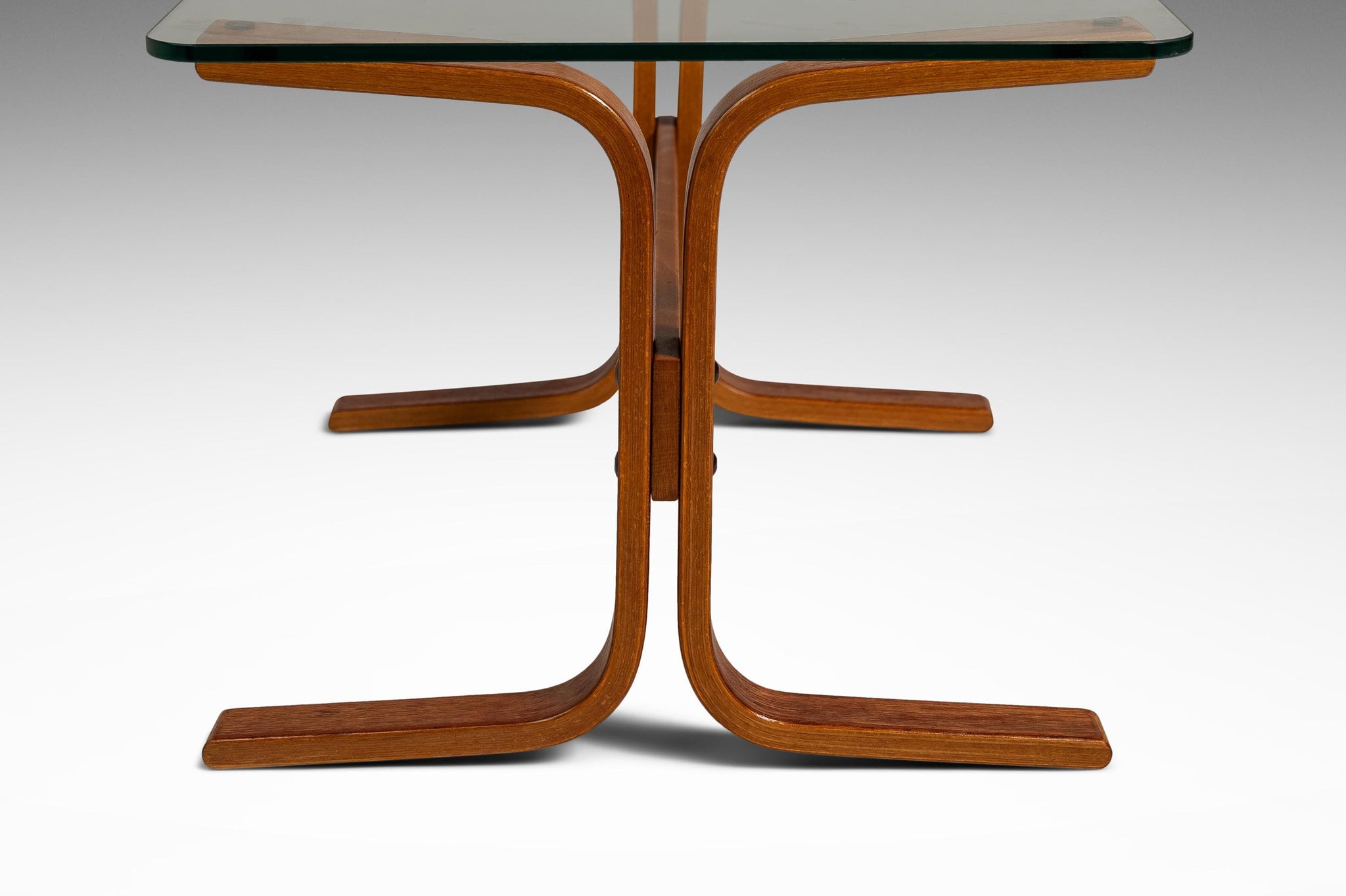 About: This elegant Scandinavian Modern Siesta occasional table / side table by Ingmar Relling for Westnofa extends the iconic Siesta series into versatile accent furniture. Designed with the same fluid, sculptural sensibility as the famous Siesta chair, the table features a rectangular clear glass top that appears to float above a striking bentwood base. The beech frame, stained in a warm teak tone is formed from gracefully curved, intersecting supports that create a dynamic, organic silhouette while maintaining exceptional stability.
