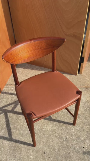 About: Introducing a rare Model 317 side chair in stunning, vintage condition. Designed by the iconic design duo Peter Hvidt & Orla Mølgaard-Nielsen this artfully crafted chair is the epitome of "functional art". Constructed from solid teak with out-of-this-world woodgrains and a seat re-upholstered in a new, genuine leather hide this visually arresting chair is ideal for those searching for the perfect accent or desk chair or to add to an already existing set.