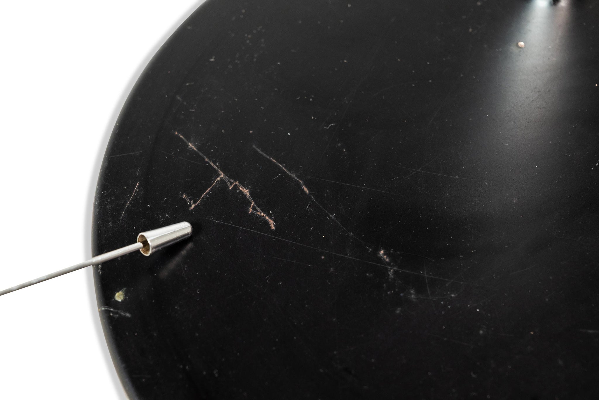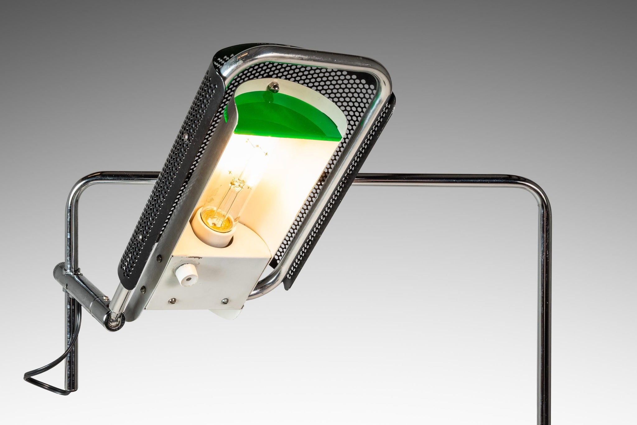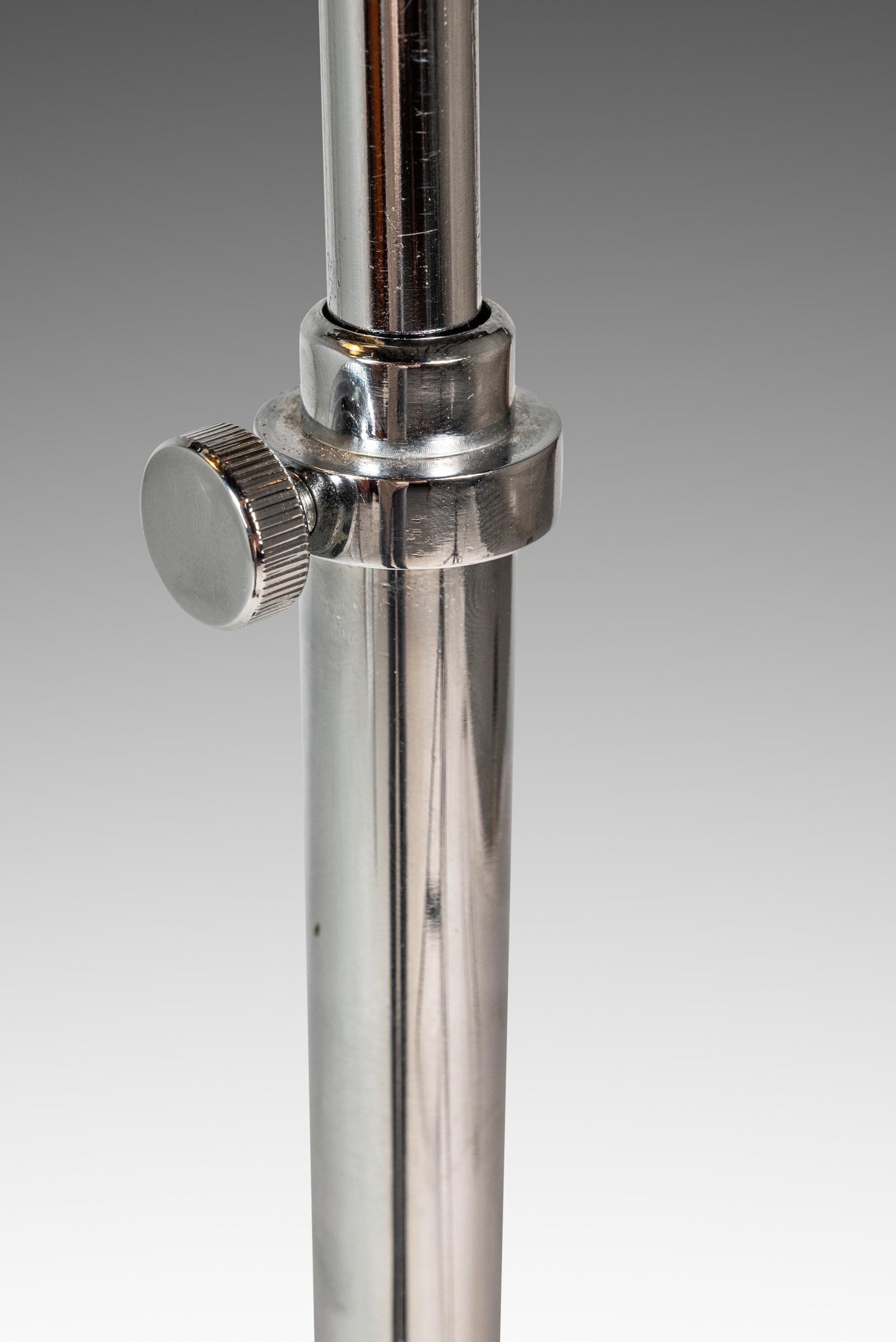 Condition Details: This iconic "Eyeshade" floor lamp is in 100% original, vintage condition and has aged to perfection! The most visible signs of wear are mostly relegated to the steel base which shows scratches (shown in the detail photos provided). With that said the only other wear present is small surface scratches in the chrome neck and lamp handle (again shown in the detail photos provided).