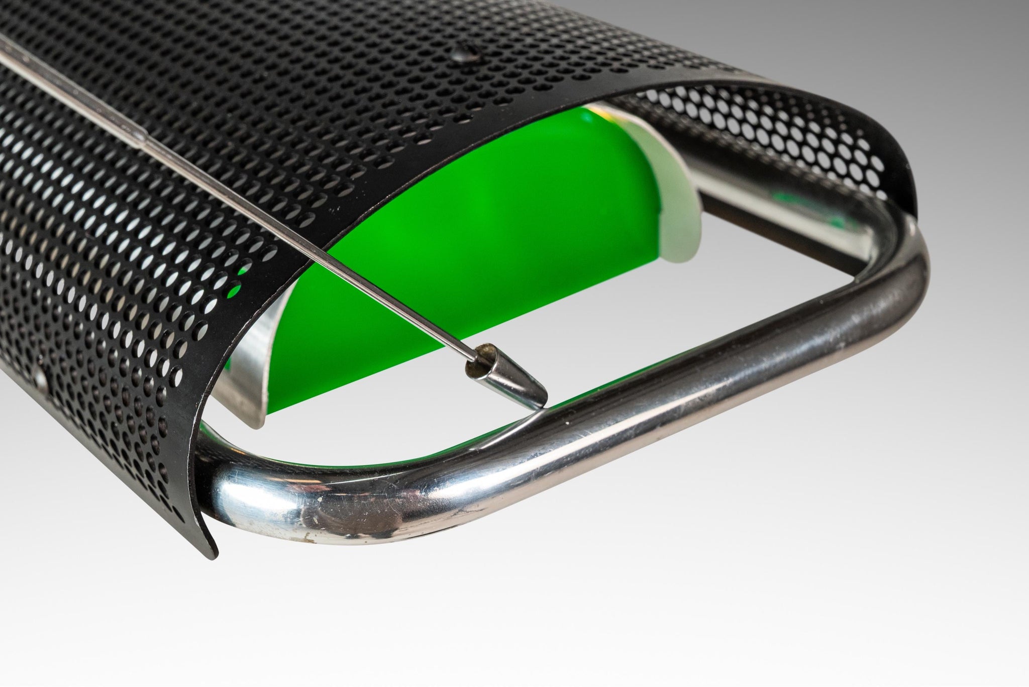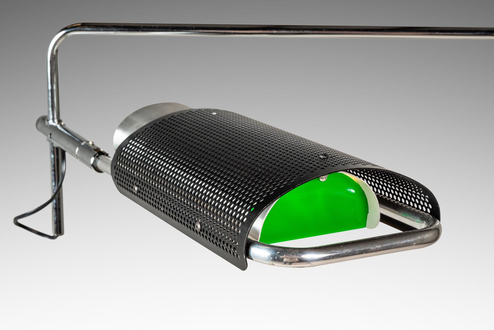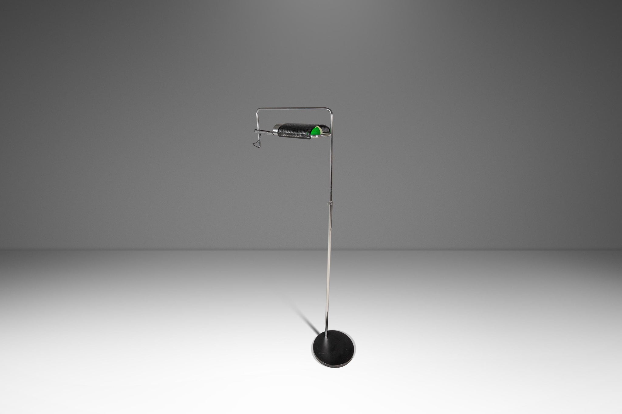 About: Introducing a rare, early "Eyeshade" floor lamp designed by the influential George Nelson for Koch & Lowy. Designed by and for architects this lamp is as versatile as it is aesthetically captivating. Abe to adjust from a minimum height of 38" to a maximum height of 56" this lamp features a swing arm shade that can swivel circularly in a 360 degree motion. The instantly recognizable, subtle green shade adds character and points directly to the great designer George Nelson.