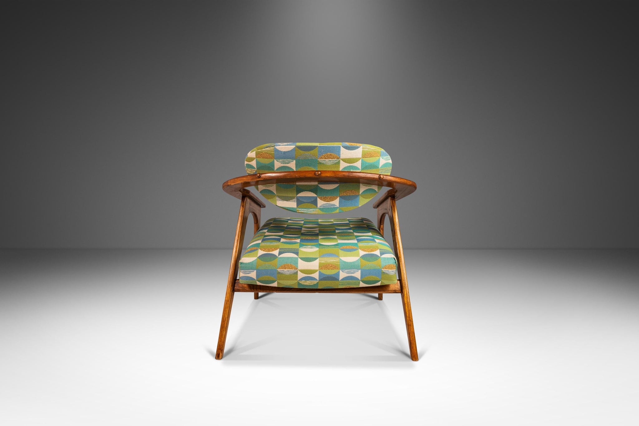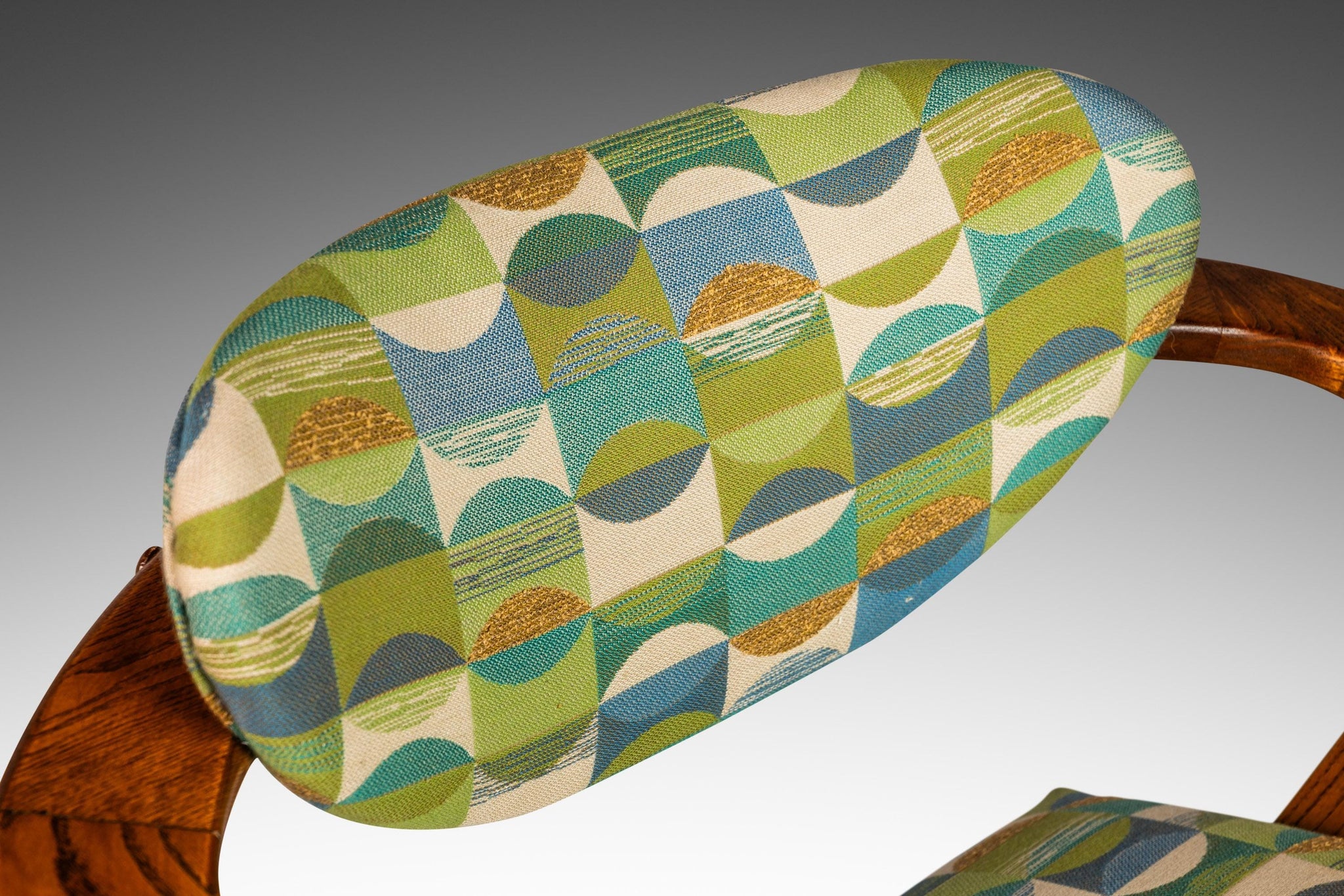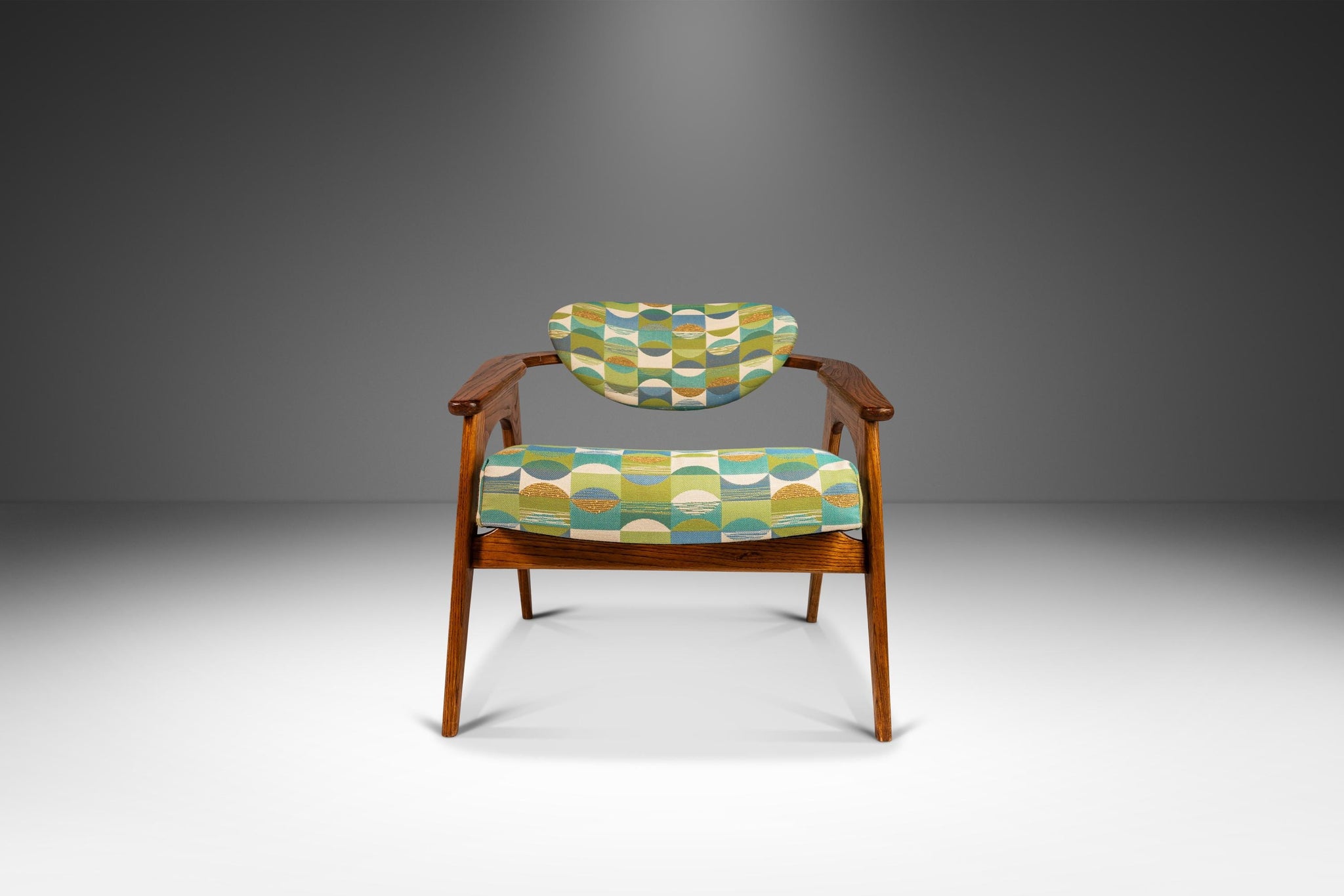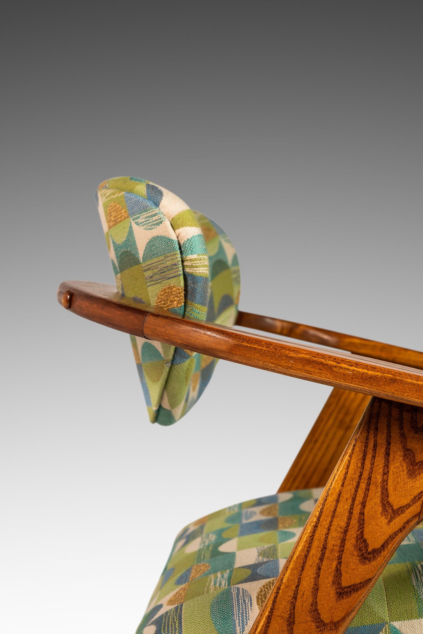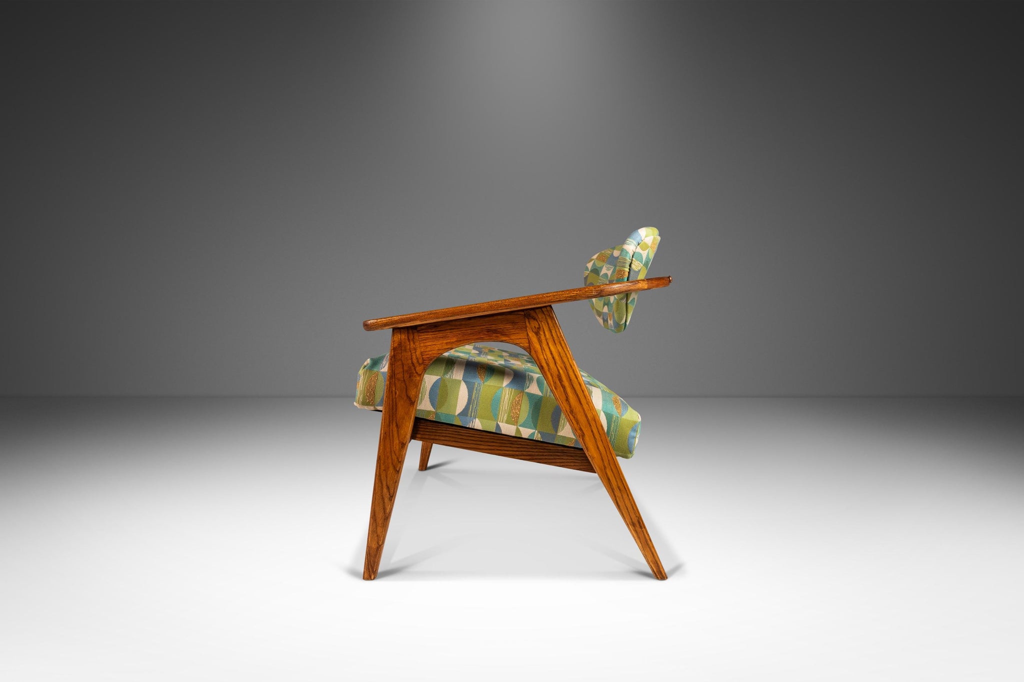 About: Designed by the incomparable Adrian Pearsall, this iconic Model 916-CC Captain's Chair is the epitome of functional art. Visually stunning and audacious in shape and materials used this 916-CC is a true American Modern masterpiece. Featuring new geometric patterned, heavy knit fabric, new medium-density foam for maximum comfort and a solid oak frame that is in 100% original, vintage condition this Model 916 is perhaps the best conditioned 916 chair available for sale in North America.