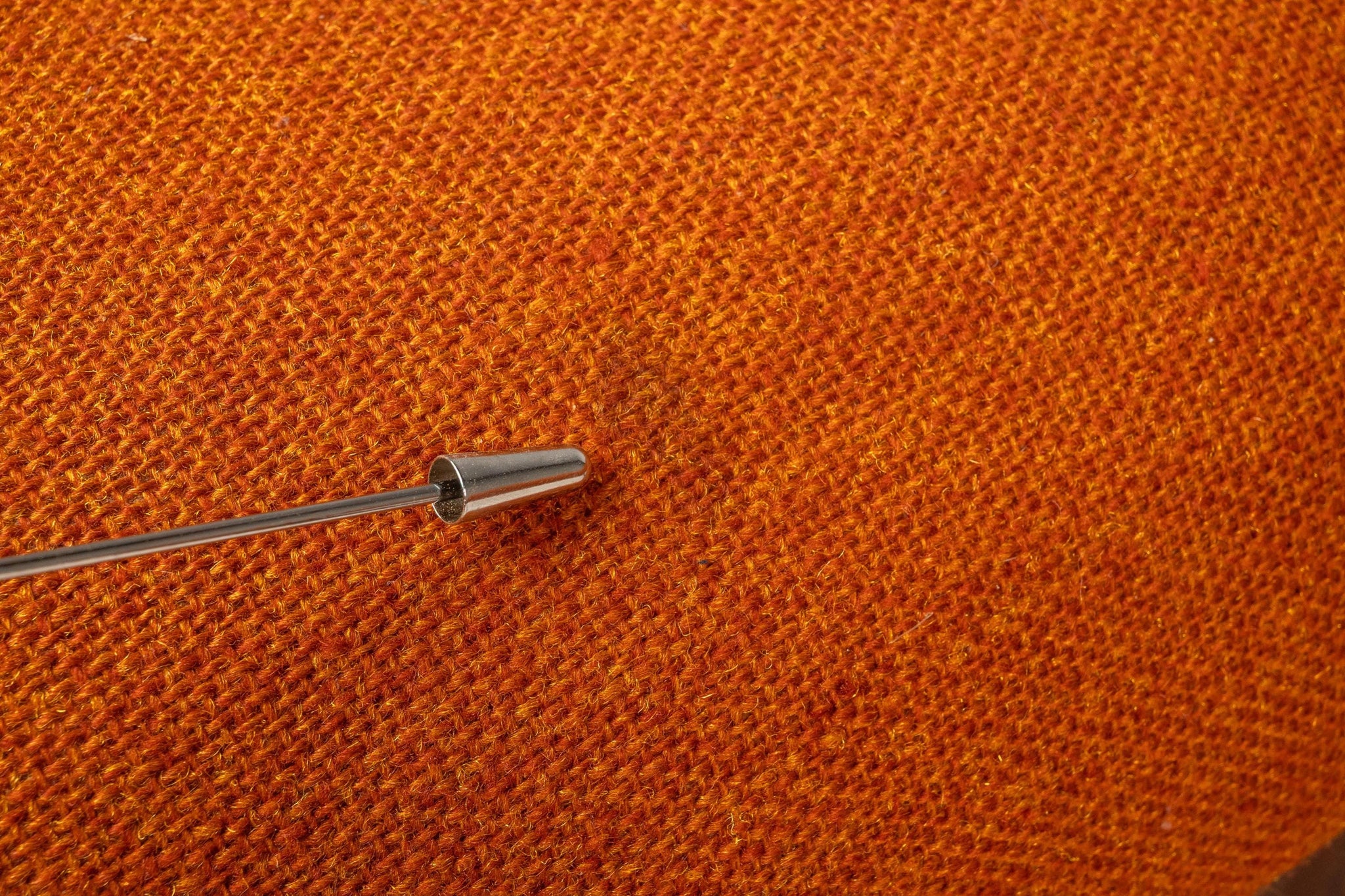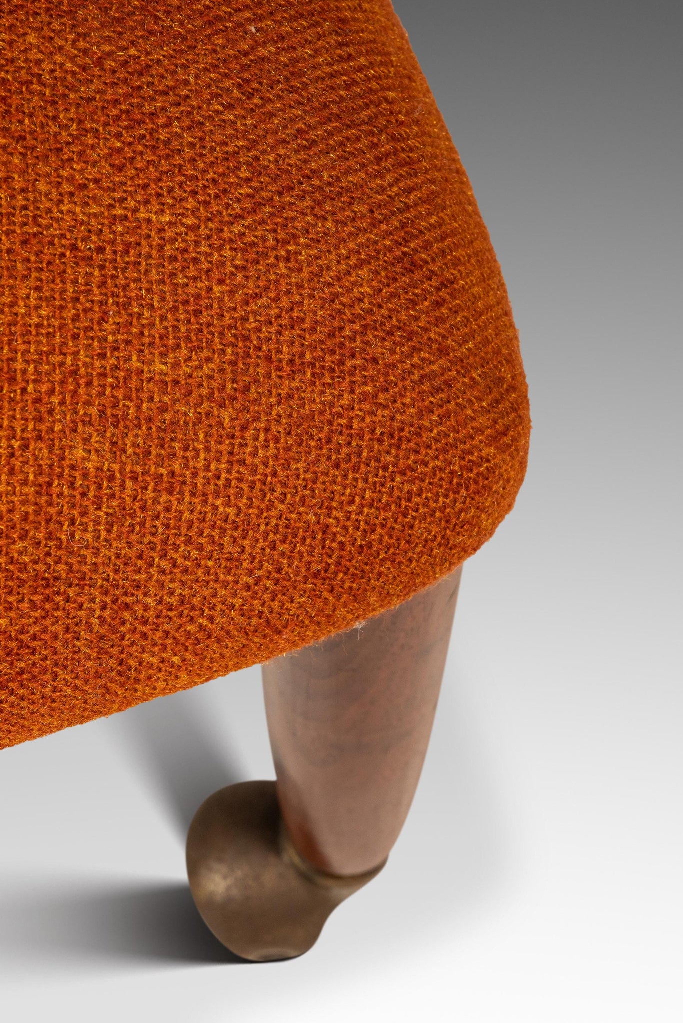 The original burnt orange knit polyester fabric shows only light areas of minor discoloration (shown in the detail photos and natural light video provided) but are in overall very hood shape. The cushions have been replaced with new medium density foam for maximum comfort and longevity.