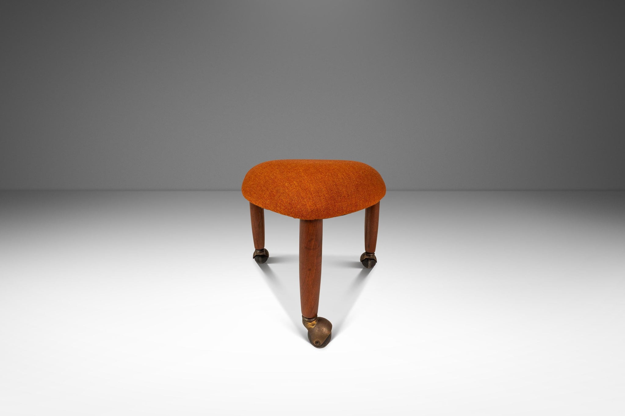 Condition Details: Save for new foam, this set of rare "Trifecta" rolling stools is in original, vintage condition and has aged to perfection! The solid black walnut legs have been hand-polished and show only minor nicks and scratches (the worst of which can be seen in the detail photos provided) but showing now gouges, stains or other wear whatsoever. The brass castors show tarnishing however all 16 castors roll without issue.