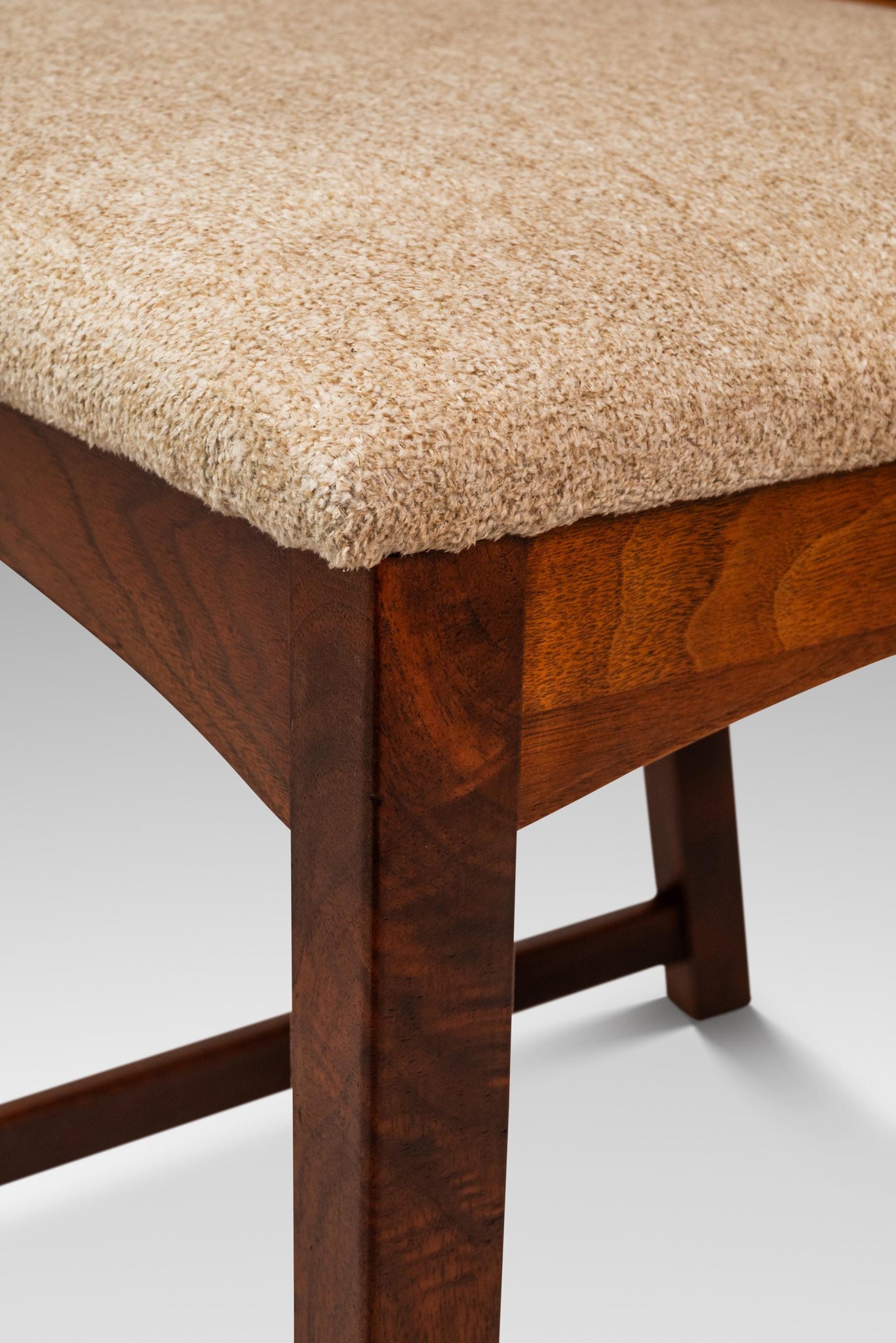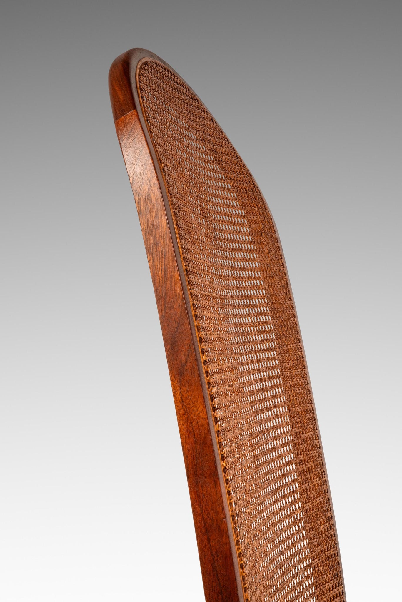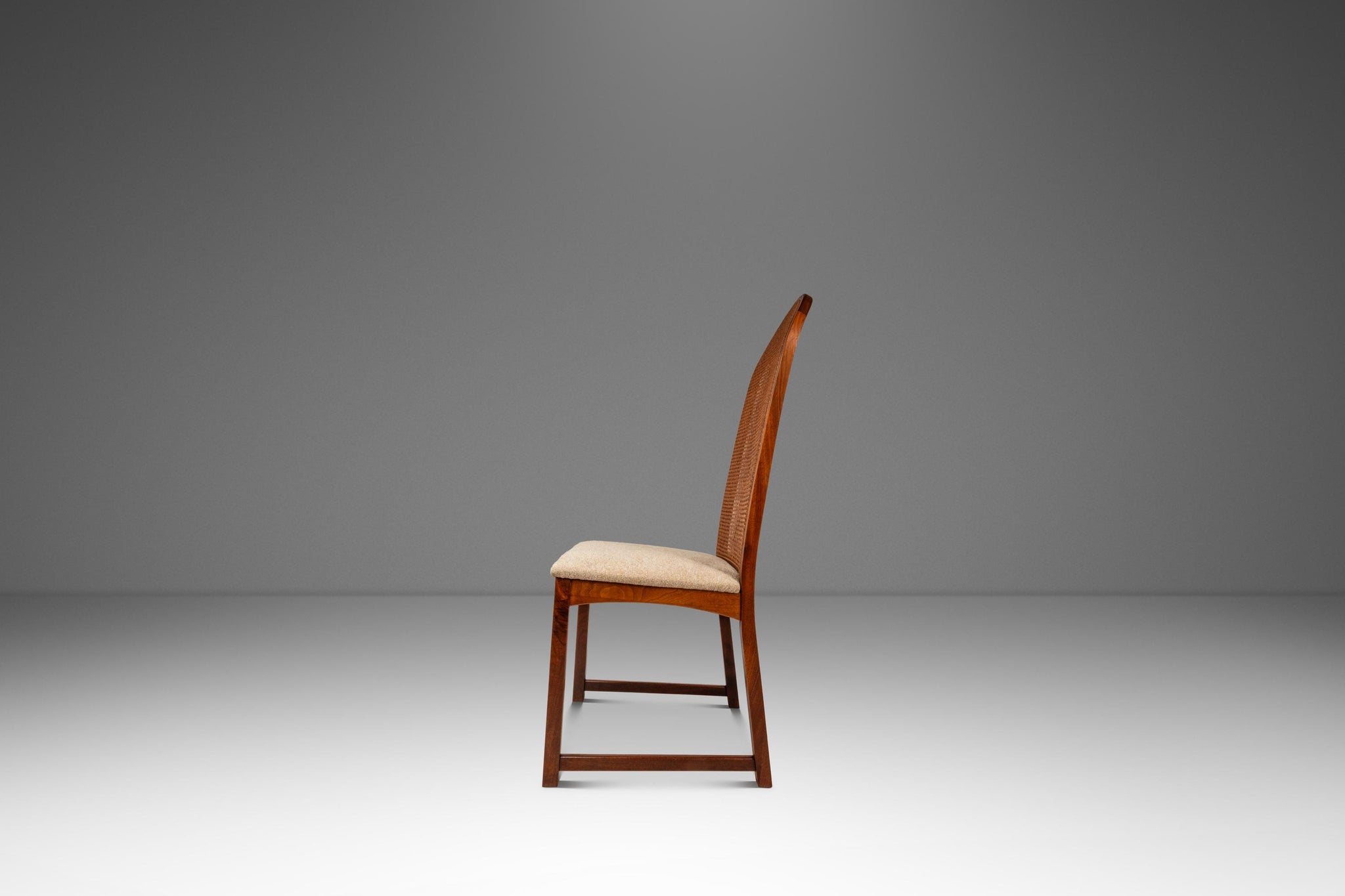 About: Introducing an ultra-rare set of cane-back dining chairs designed by the influential Milo Baughman for Directional made in the 1950's. Constructed from a frame of solid American black walnut with stunning variegated woodgrains this set of dining chairs feature architecturally and visually fascinating hoop-shaped, caned backrests. The caning, in superb original condition, adds a sense of airiness for an otherwise grandiose chair. With new upholstery, redone in a kind to the touch cotton blend fabric, this set is ready for a literal lifetime more of use.