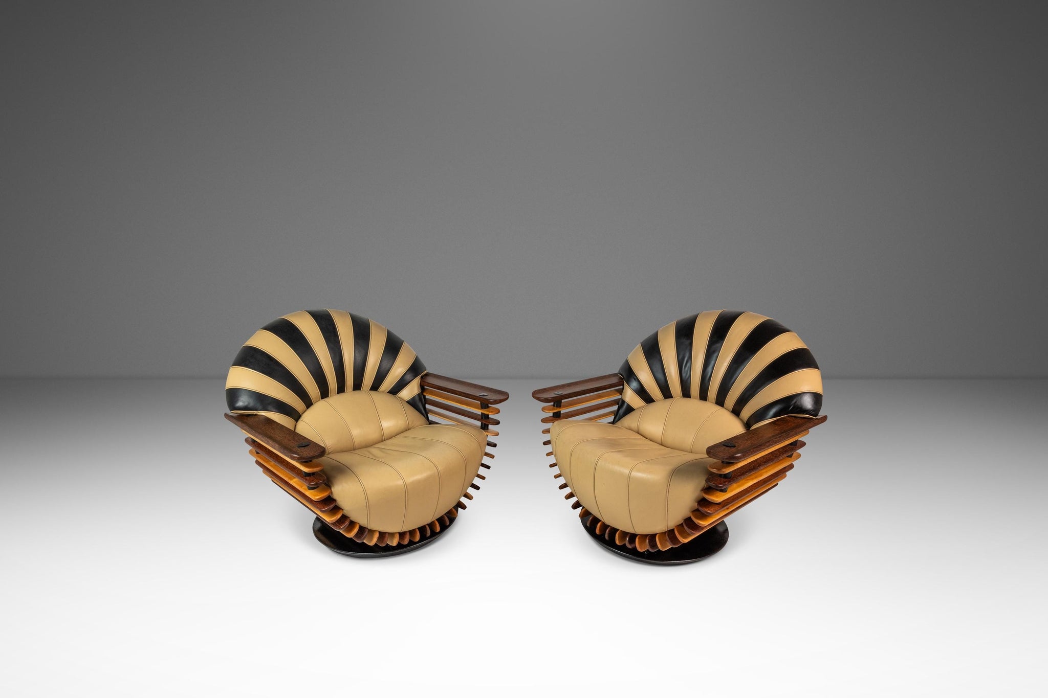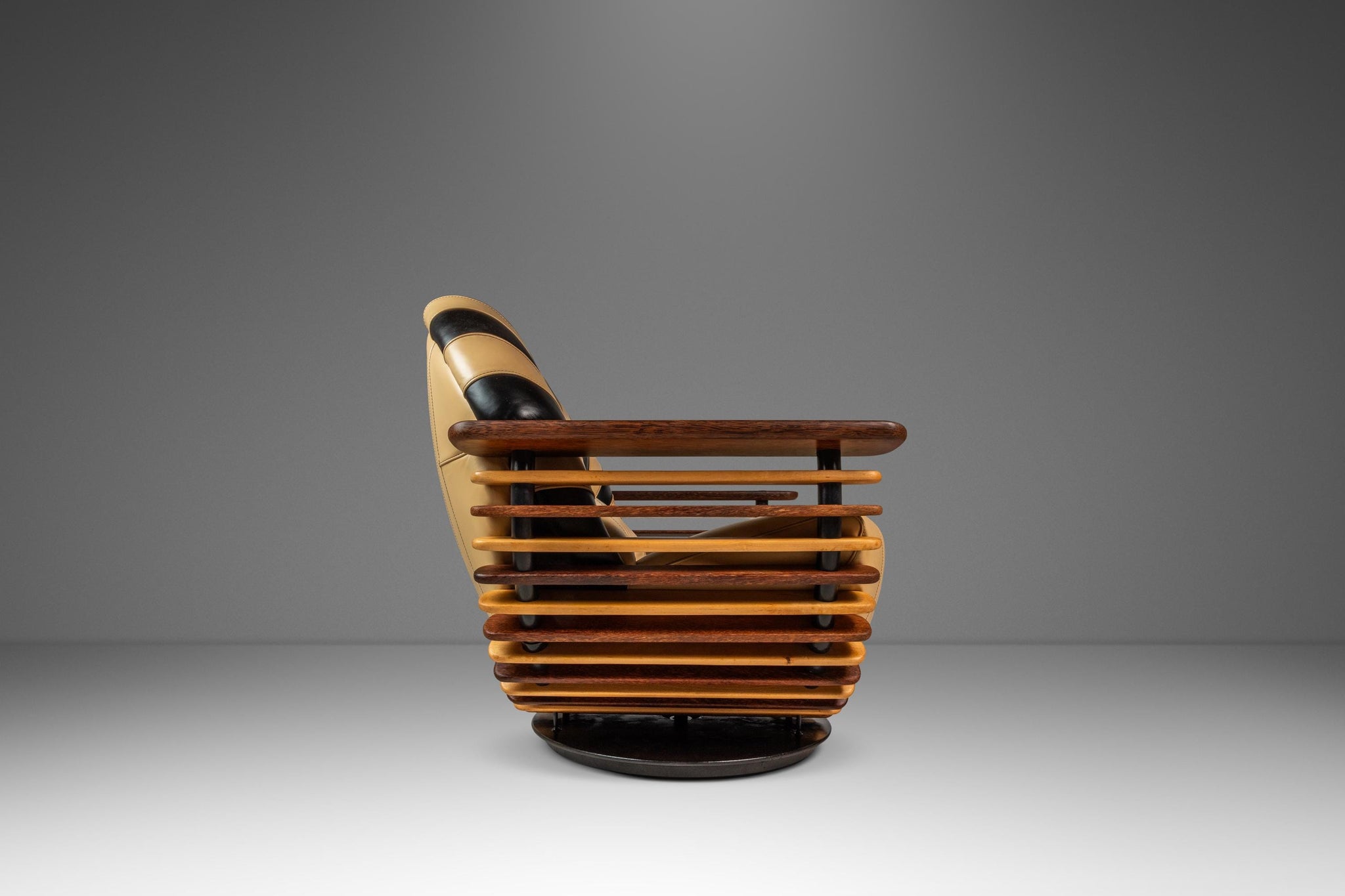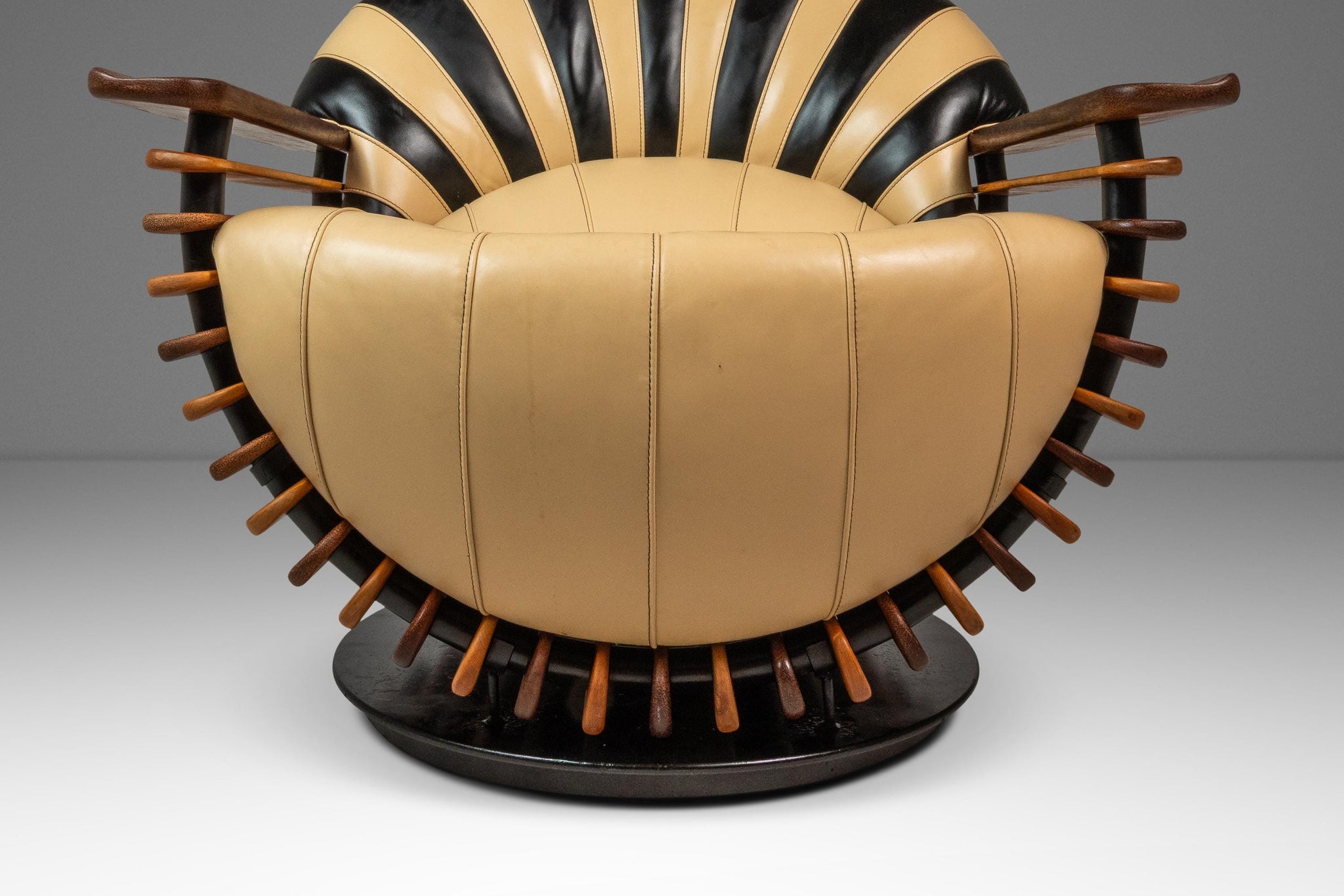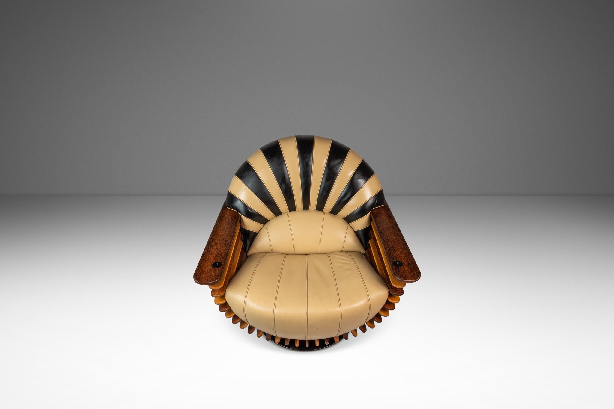 About: Introducing a stunning "Luxor" armchair produced by the lauded Australian-based Pacific Green company. Artfully constructed with alternating bright spruce and dark palm wood slats and beautiful butter soft beige and black genuine leather. This visually captivating chair has a geometric curved back and base that borrows from the Art Deco style of the early 20th century. This piece is VERY heavy and well built with a solid metal frame and stand on which the chair can spin 360 degrees effortlessly. The "Luxor" emulates the alternating light and dark patterns that the Egyptians historically used in their artifacts and art.