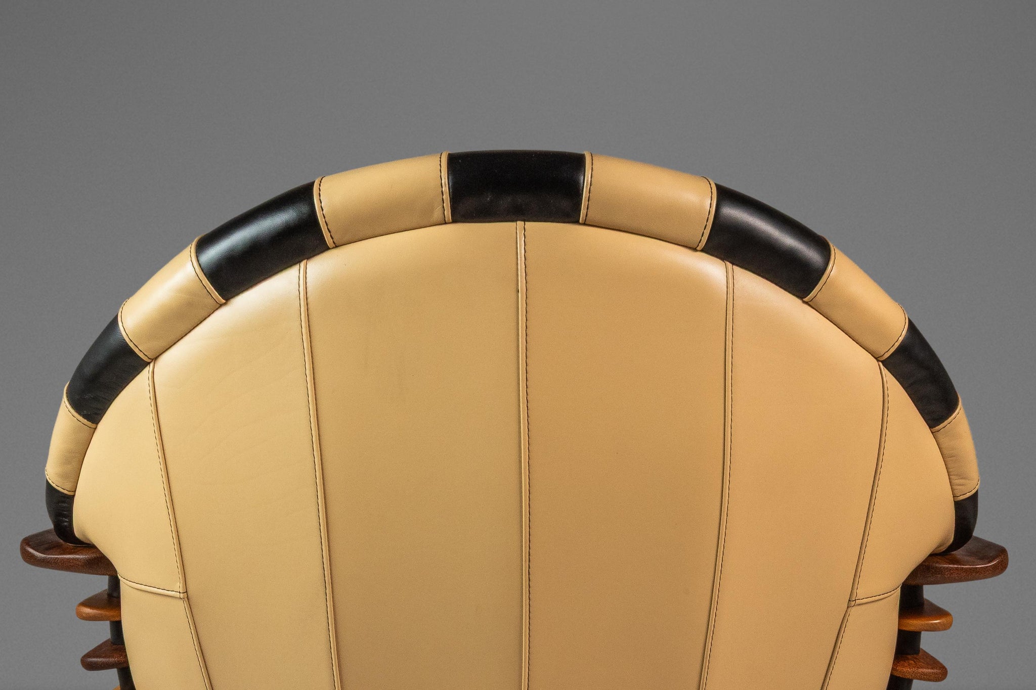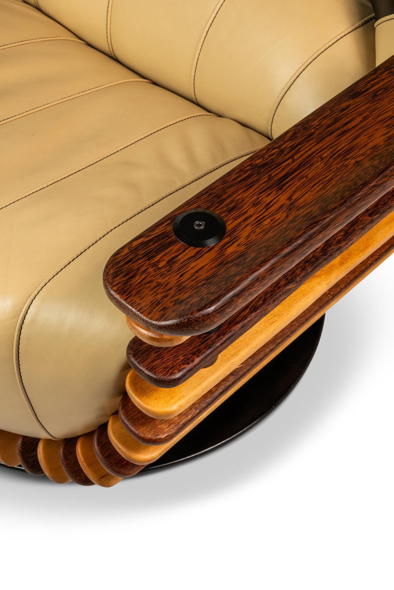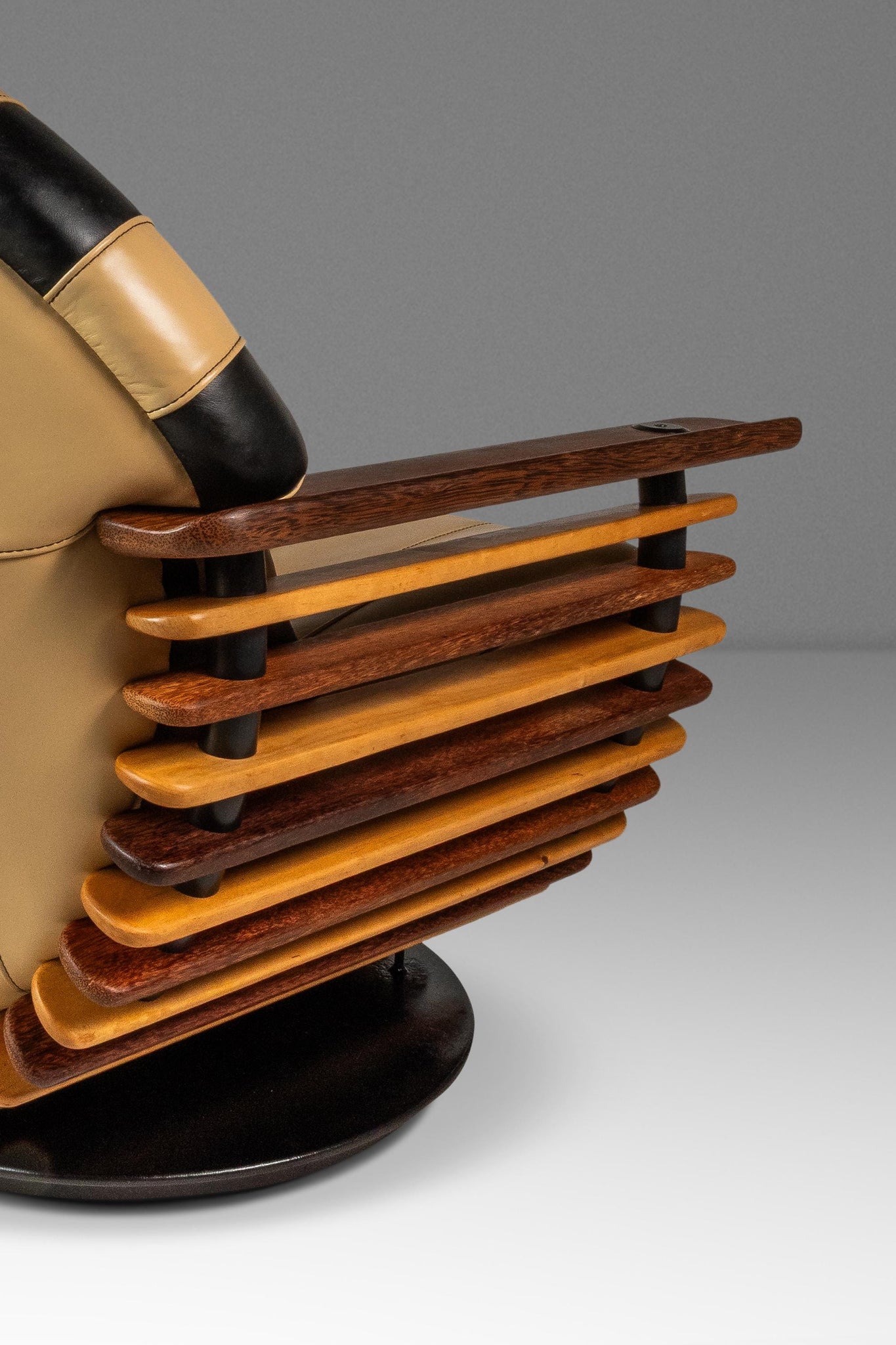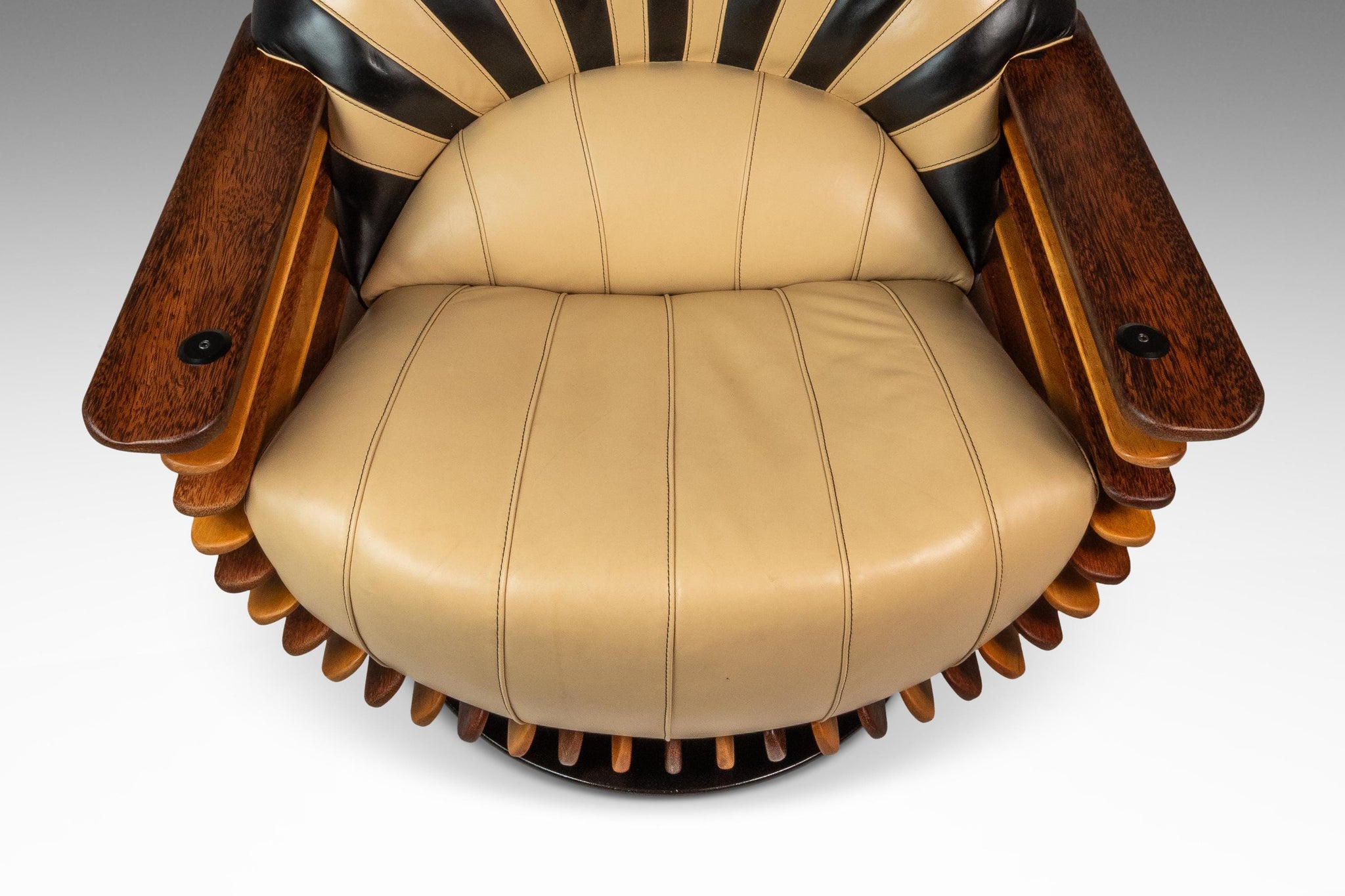 About: Introducing a stunning "Luxor" armchair produced by the lauded Australian-based Pacific Green company. Artfully constructed with alternating bright spruce and dark palm wood slats and beautiful butter soft beige and black genuine leather. This visually captivating chair has a geometric curved back and base that borrows from the Art Deco style of the early 20th century. This piece is VERY heavy and well built with a solid metal frame and stand on which the chair can spin 360 degrees effortlessly. The "Luxor" emulates the alternating light and dark patterns that the Egyptians historically used in their artifacts and art.
