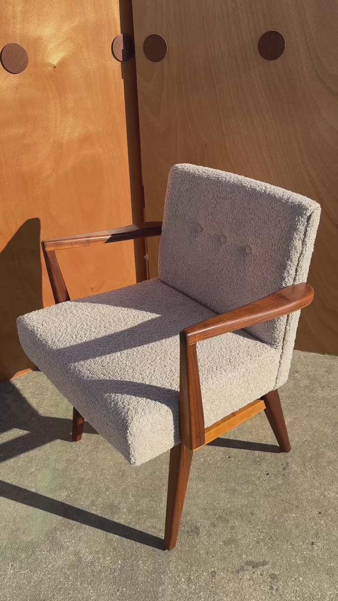 About: Introducing a limited set of two restored Model C-108 armchairs designed by Jens Risom for Jens Risom Design. Constructed from frames, legs and arms of solid black walnut replete with exceptional woodgrains, this iconic set of 108's has recently undergone a comprehensive restoration process. The upholstery, redone in a kind-to-the-touch cotton bouclé, has been hand-sewn in exact accordance with the original scheme and layout making this set ideal for collectors and designers alike. Designed in 1948 and crafted in the late 1950's by Jens Risom Designs, consequently the zenith of Risom's career and subsequent fame, this set of Mid-Century Modern armchairs is a true American icon.
