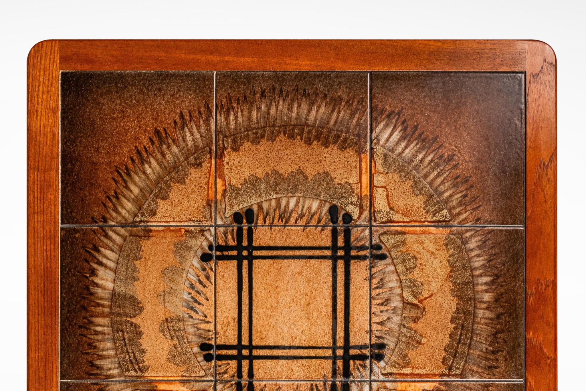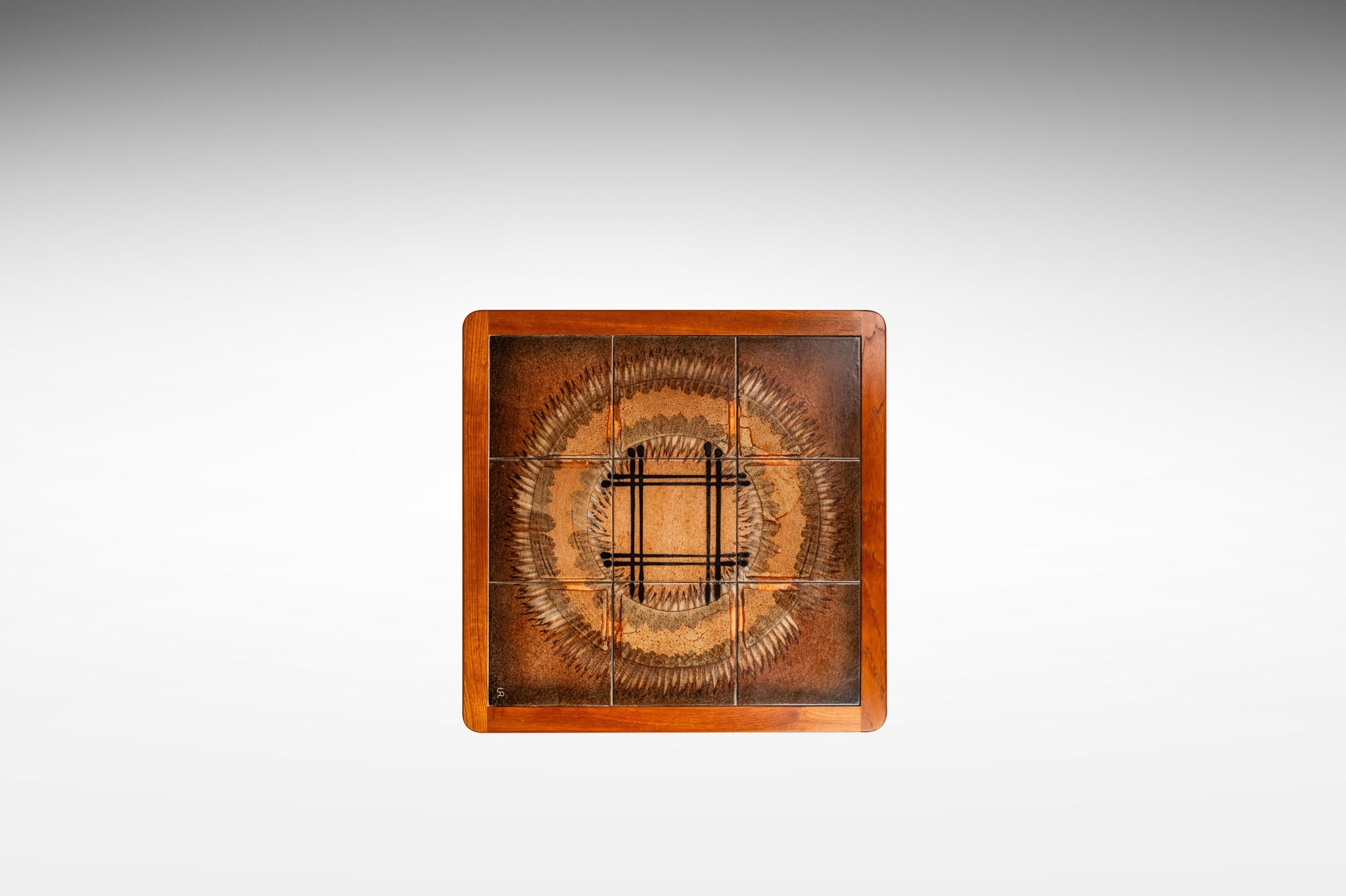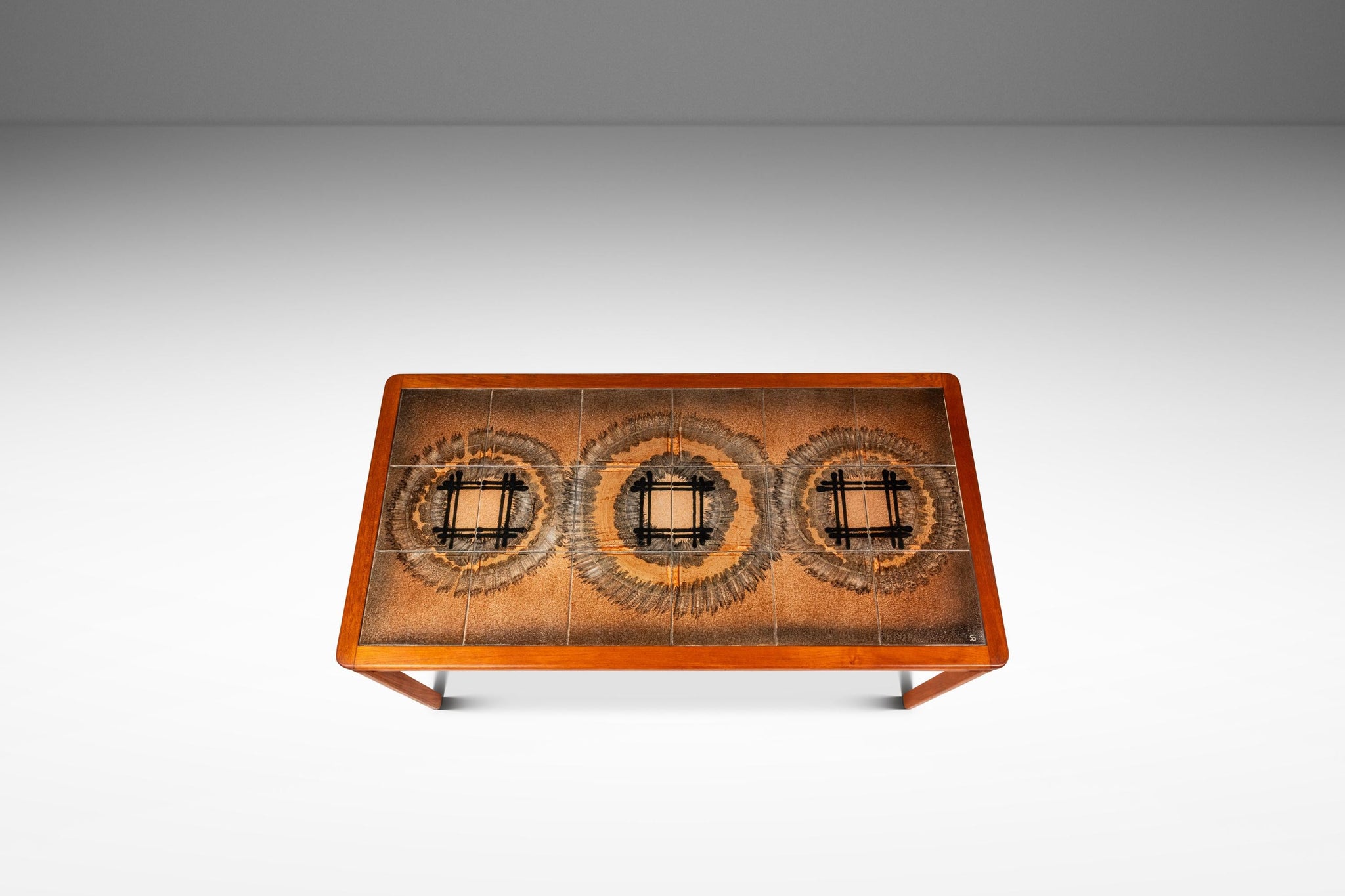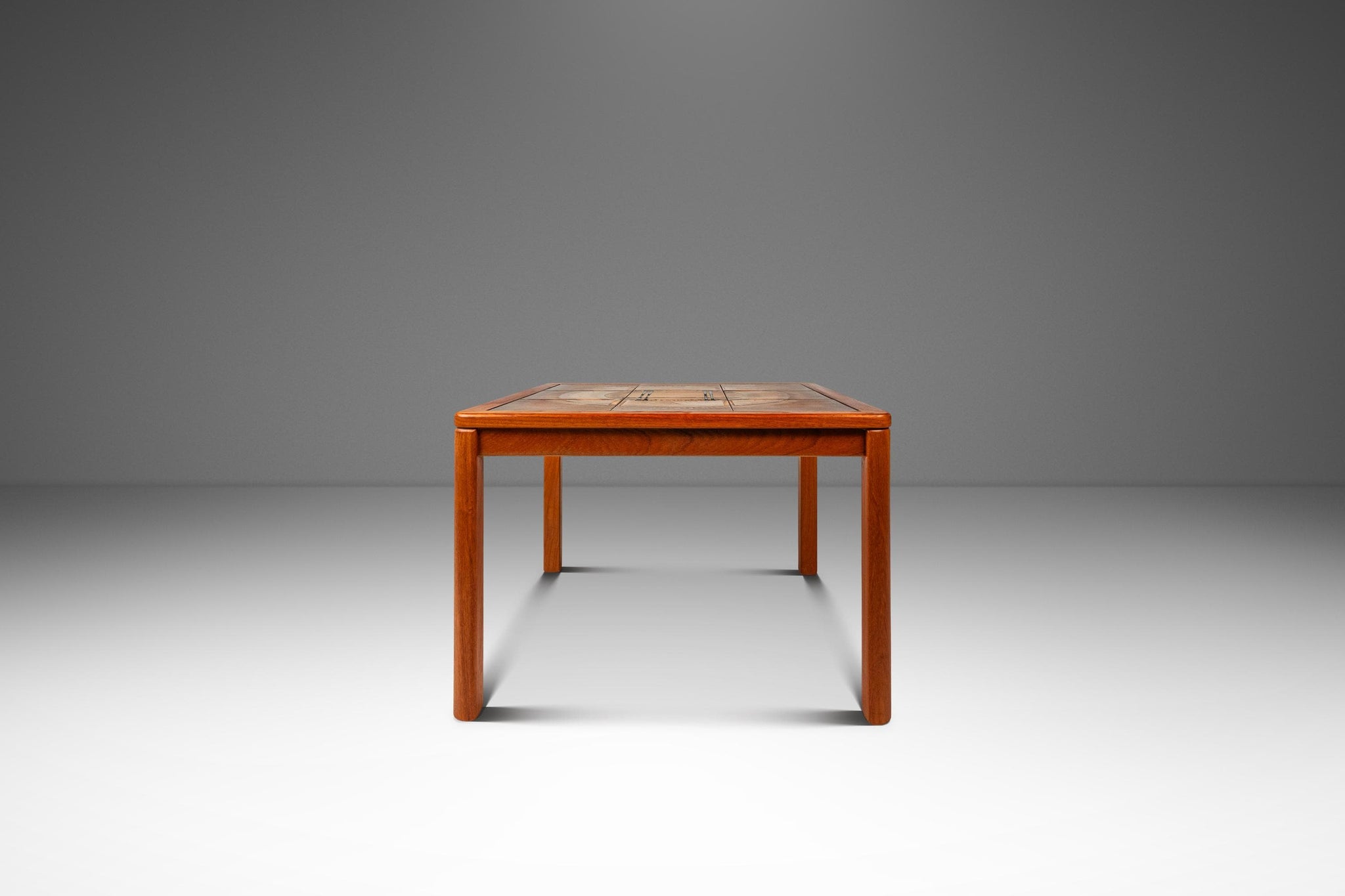 About: Introducing a true Danish Modern treasure: a rare, signed coffee table with matching end table designed by the well respected and prolific Johannes Andersen. Featuring table tops constructed from ceramic tiles, painted with intriguing geometric shapes as well as a frame of solid Burmese teak with exceptional woodgrains this table set is the very epitome of "functional art". In rare stunning original condition this set is ideal for collectors searching for an authentic Andersen table set that is ready for a lifetime more of use.