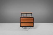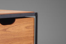 About: A modernist desk constructed from the finest cuts of walnut and angular wrought iron. The desk has an open worksurface with a floating bank of drawers to it's left or right side as the draws can be switched for your alignment preference. Note: The chair pictured with the desk is not included and is sold separately.