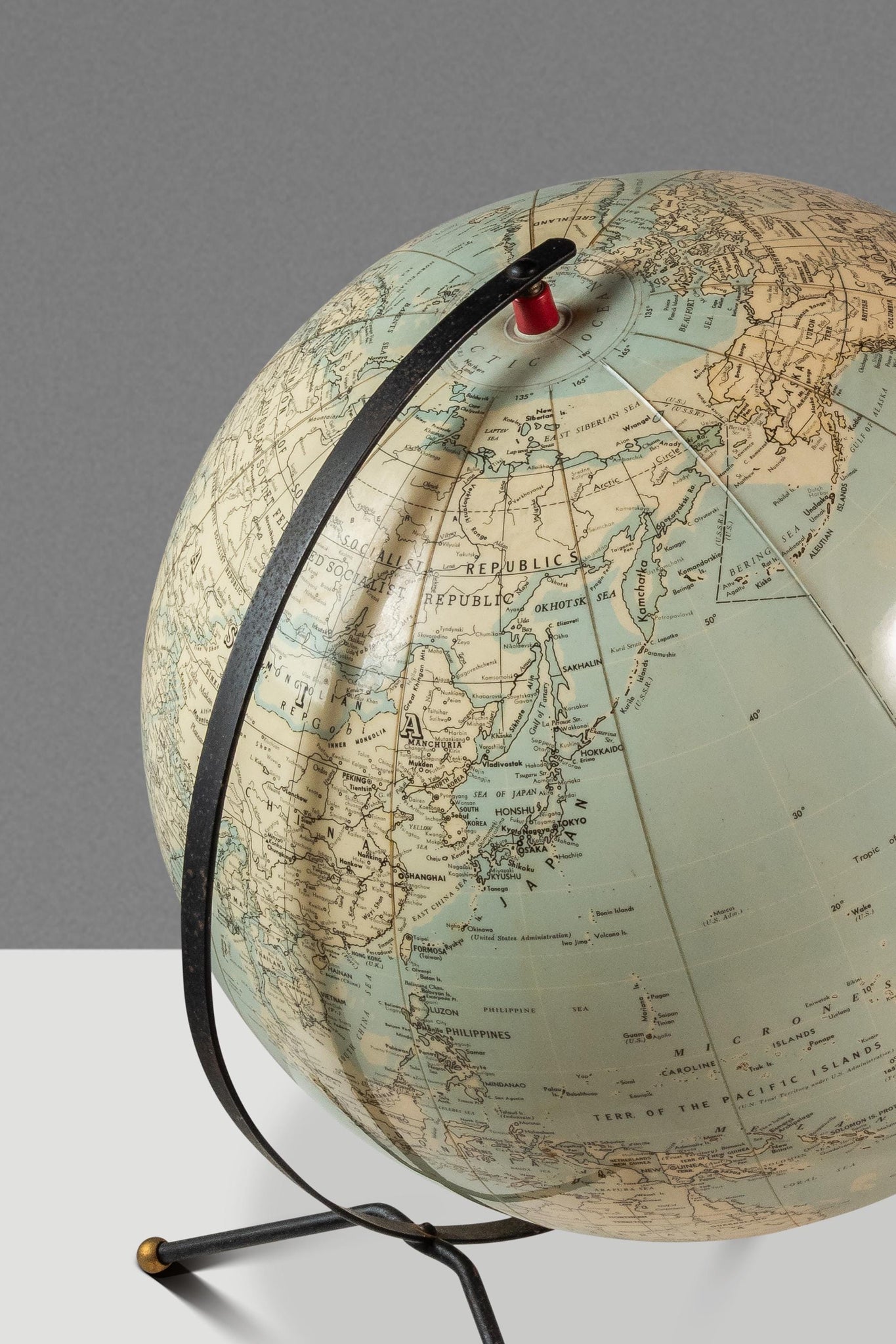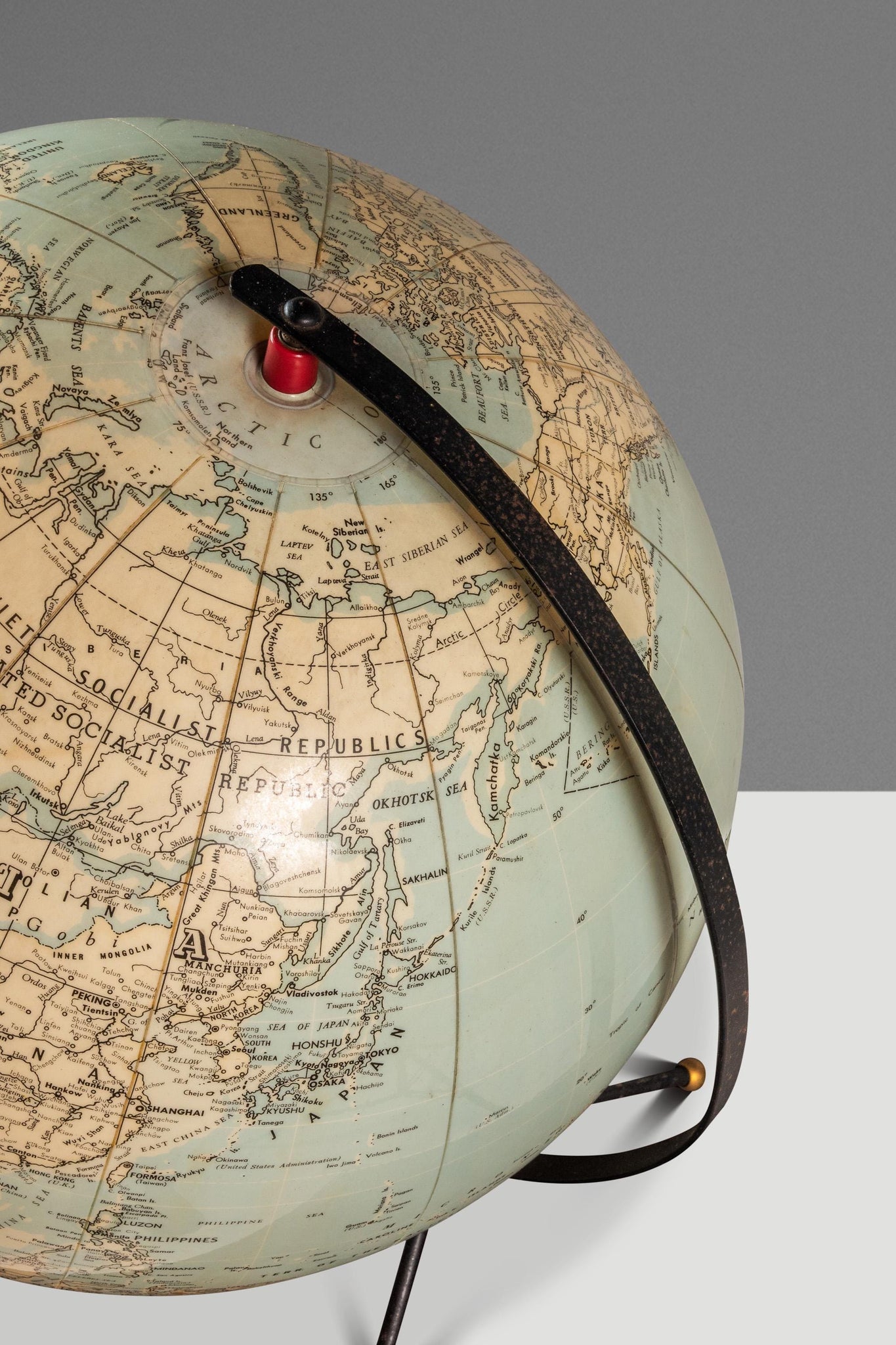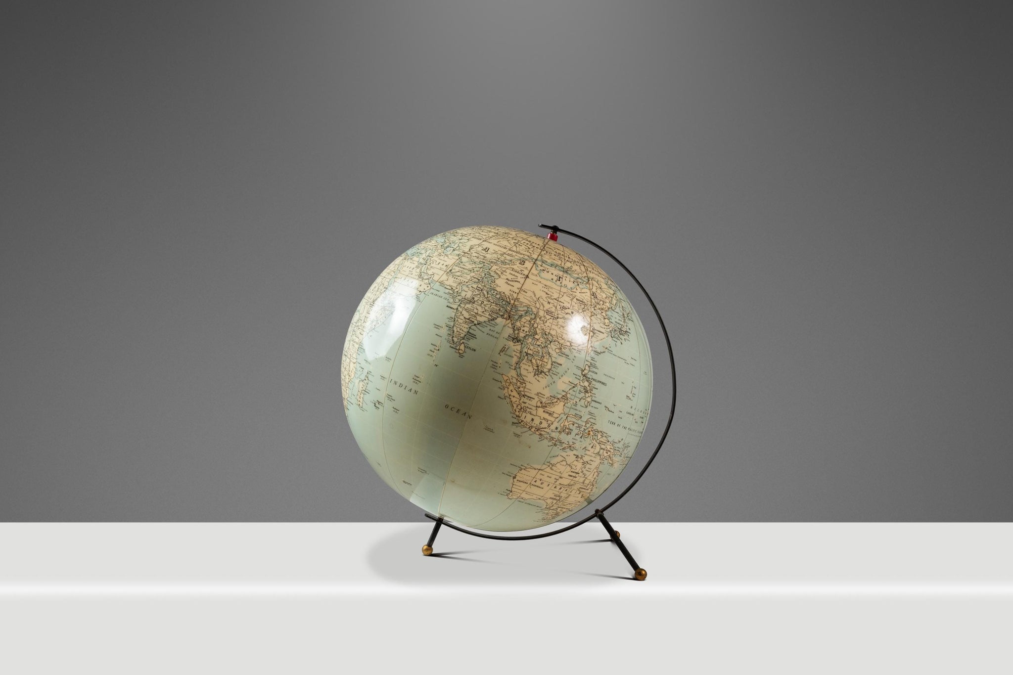 About: Attention collectors! Introducing a nearly 75 year old table top globe in 100% original, vintage condition. Featuring a space-age metal stand with geometric feet this globe shows the world as it was in the early 1950's at the height of the cold war.