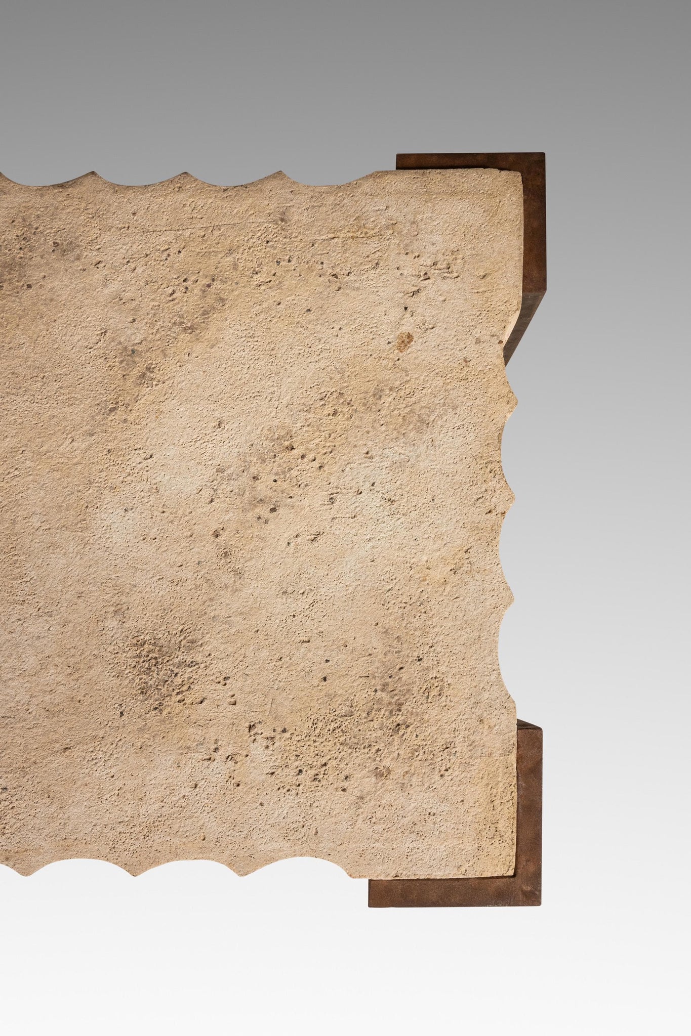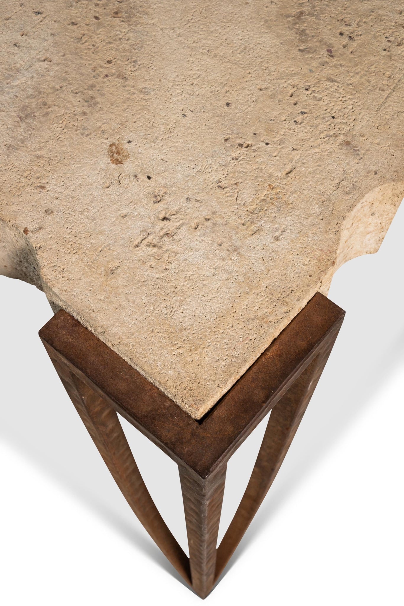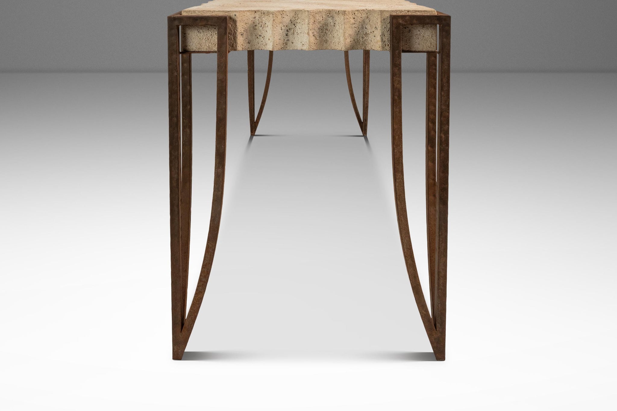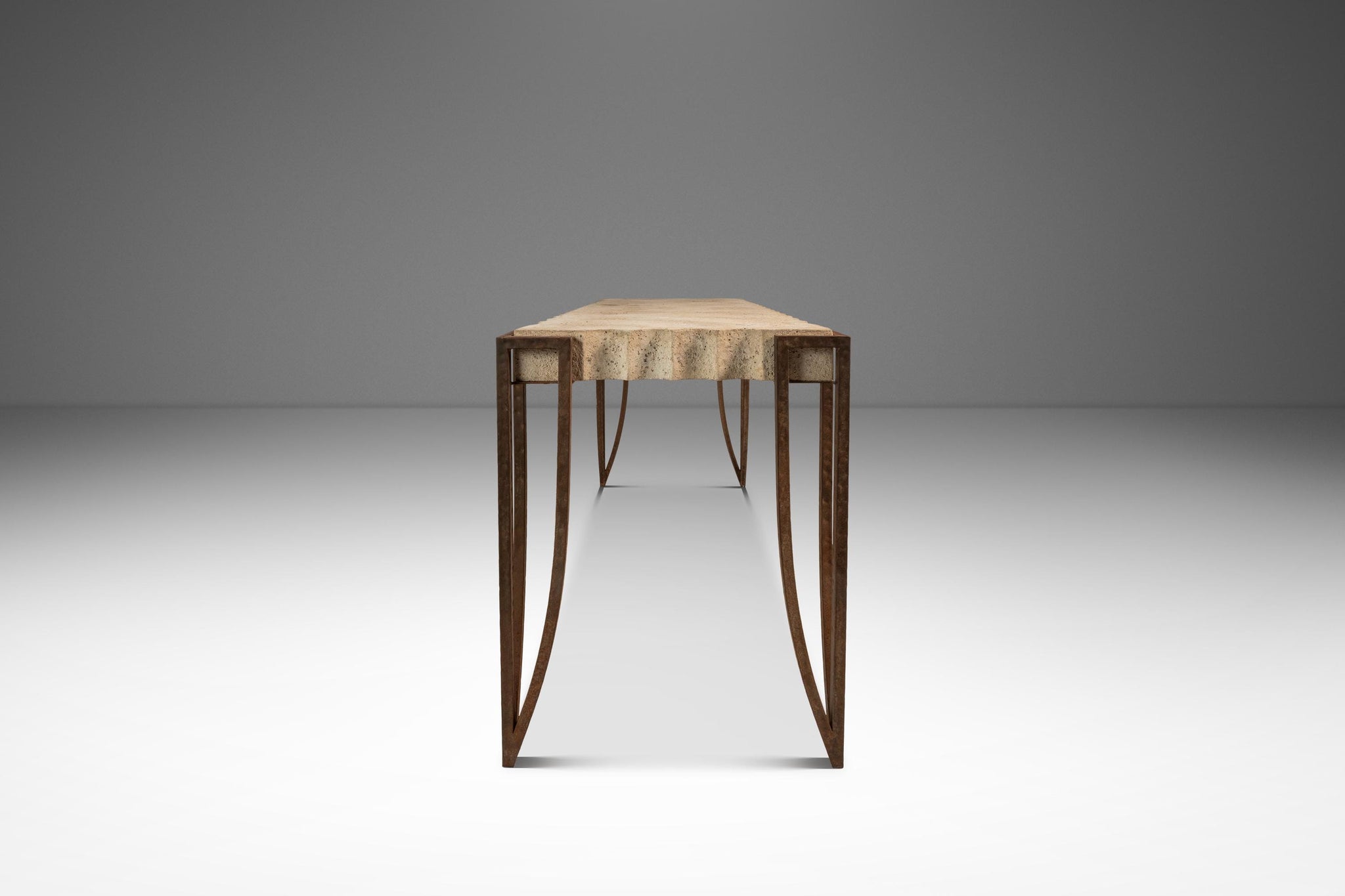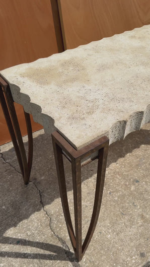 About: Introducing a truly one of a kind console table designed in the manner of R & Y Augousti. Simultaneously understated and bold, Post Modern yet minimal this high-top table features a unique hand-carved cement top replete with visually pleasing ripples on all four edges. The concrete top is suspended in the air by a set of hand forged and welded legs that show the perfect amount of character-rich patina. Though minimal and graceful, the legs are super stout and support the heavy top in a perfectly balanced position making this table ideal for showcasing art or other heavy objects.